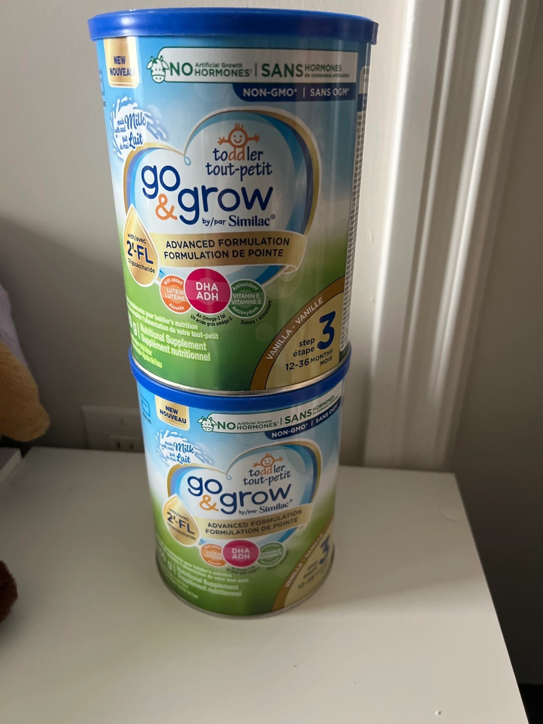 2cans of Similac Go & Grow toddler formula, stage 3 (12-36 months). Vanilla flavour. Non-GMO, no added hormones. Advanced formulation. $25 each or $40 for both