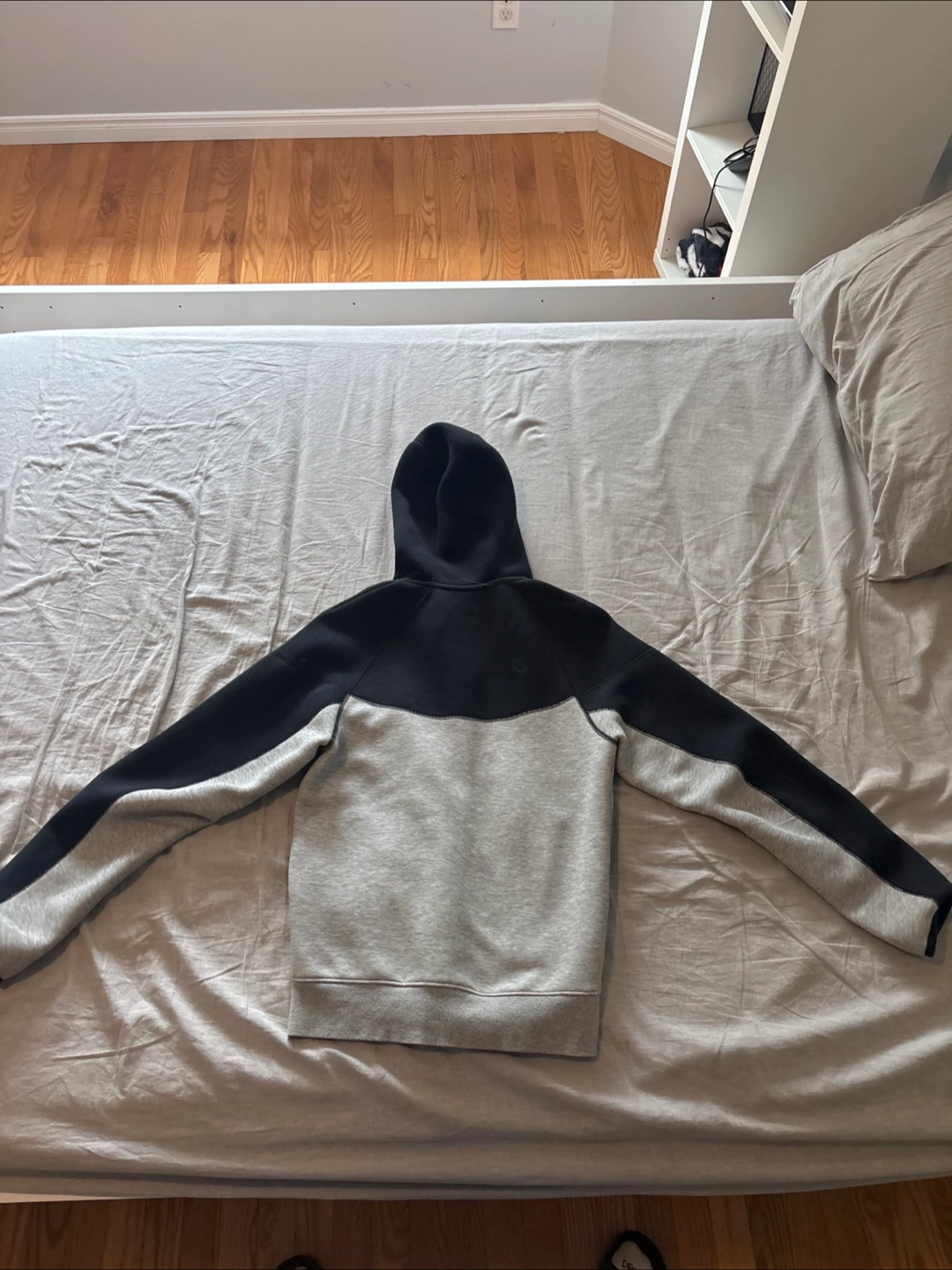 Grey and black colour block design. Small size. Full zip closure. Attached hood. Two zippered pockets. Made in Cambodia.