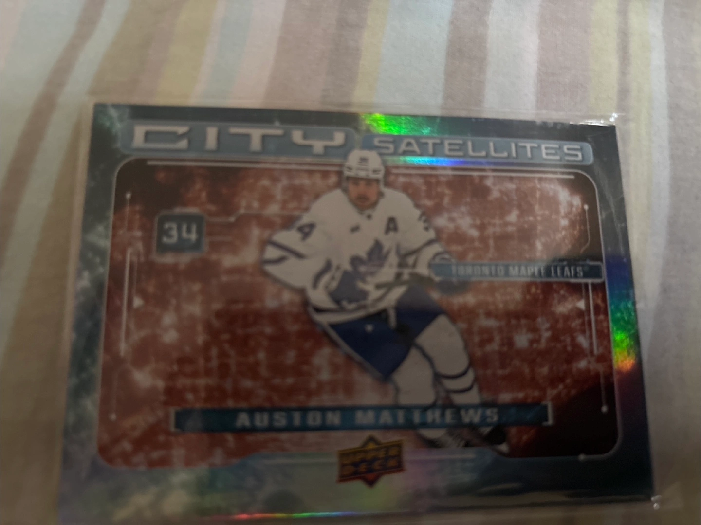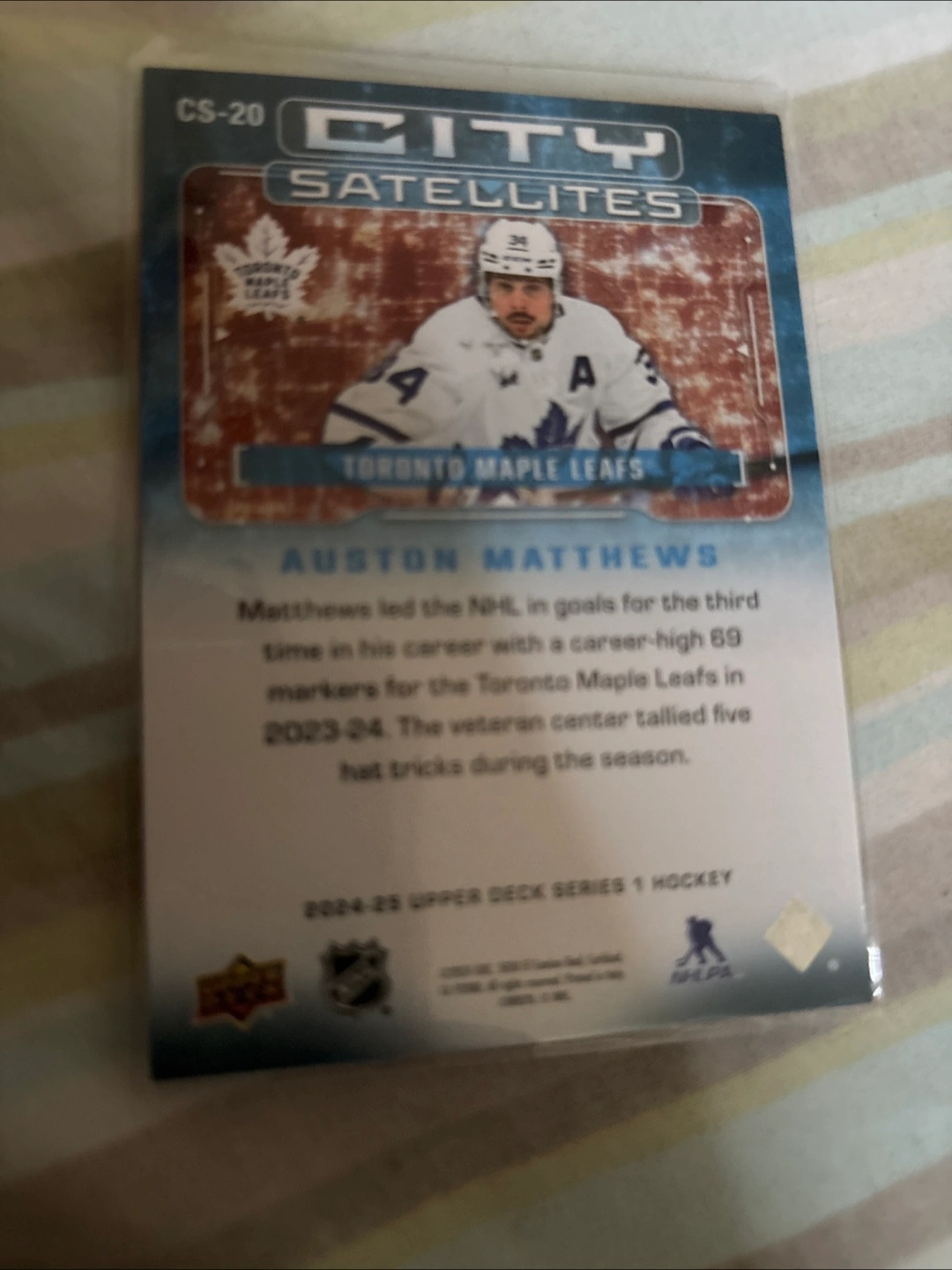 Auston Matthews City Satellites trading card. Part of the 2023-24 Upper Deck Series 1 set. Numbered CS-20. Features Toronto Maple Leafs player.