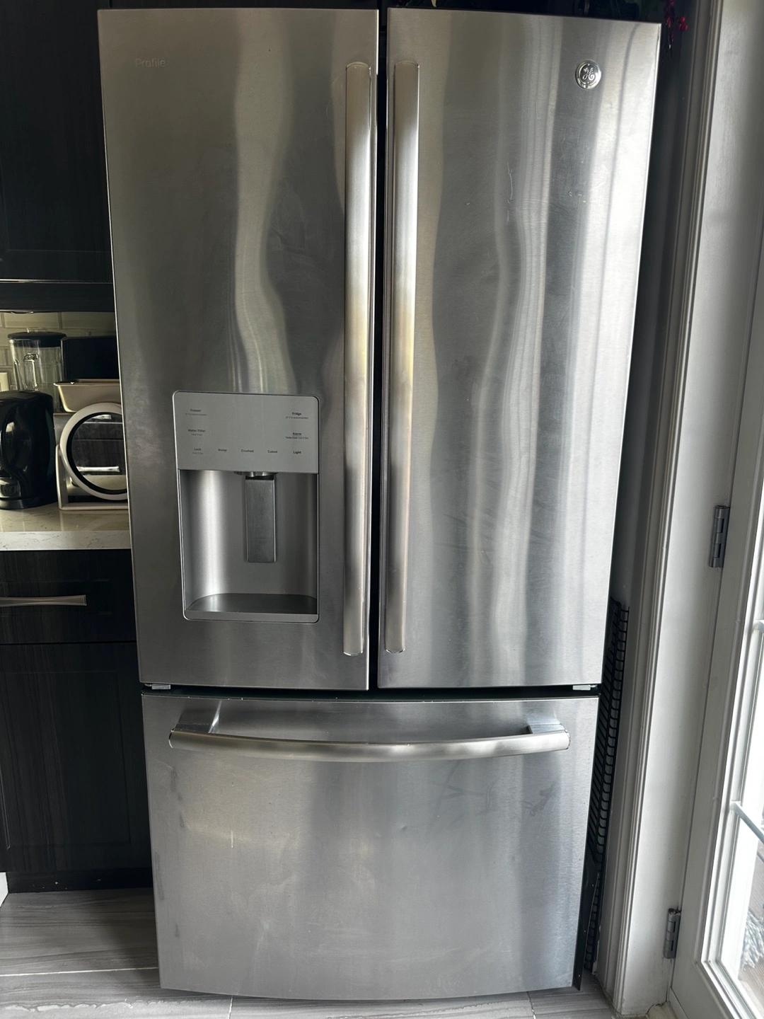 Selling this GE Profile French Door Refrigerator. It powers on and the lights work, but it’s not cooling properly—likely needs repair or could be used for parts. Features include water and ice dispenser, bottom freezer, stainless steel finish, and modern French door design. Cosmetic condition is fair—some scratches and wear as shown in the photo, but no major dents. Selling as is. Model: GE Profile (exact model unknown) Dimensions: Approx. 36” W x 70” H x 30” D Pickup Only – Located in Pickering Great for someone who fixes appliances or needs parts.