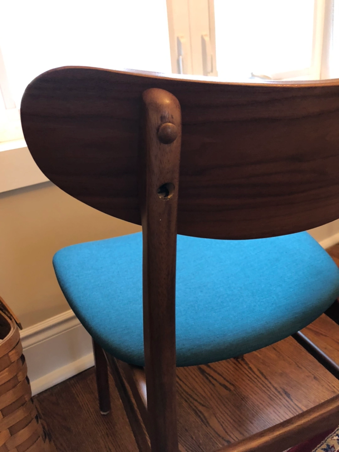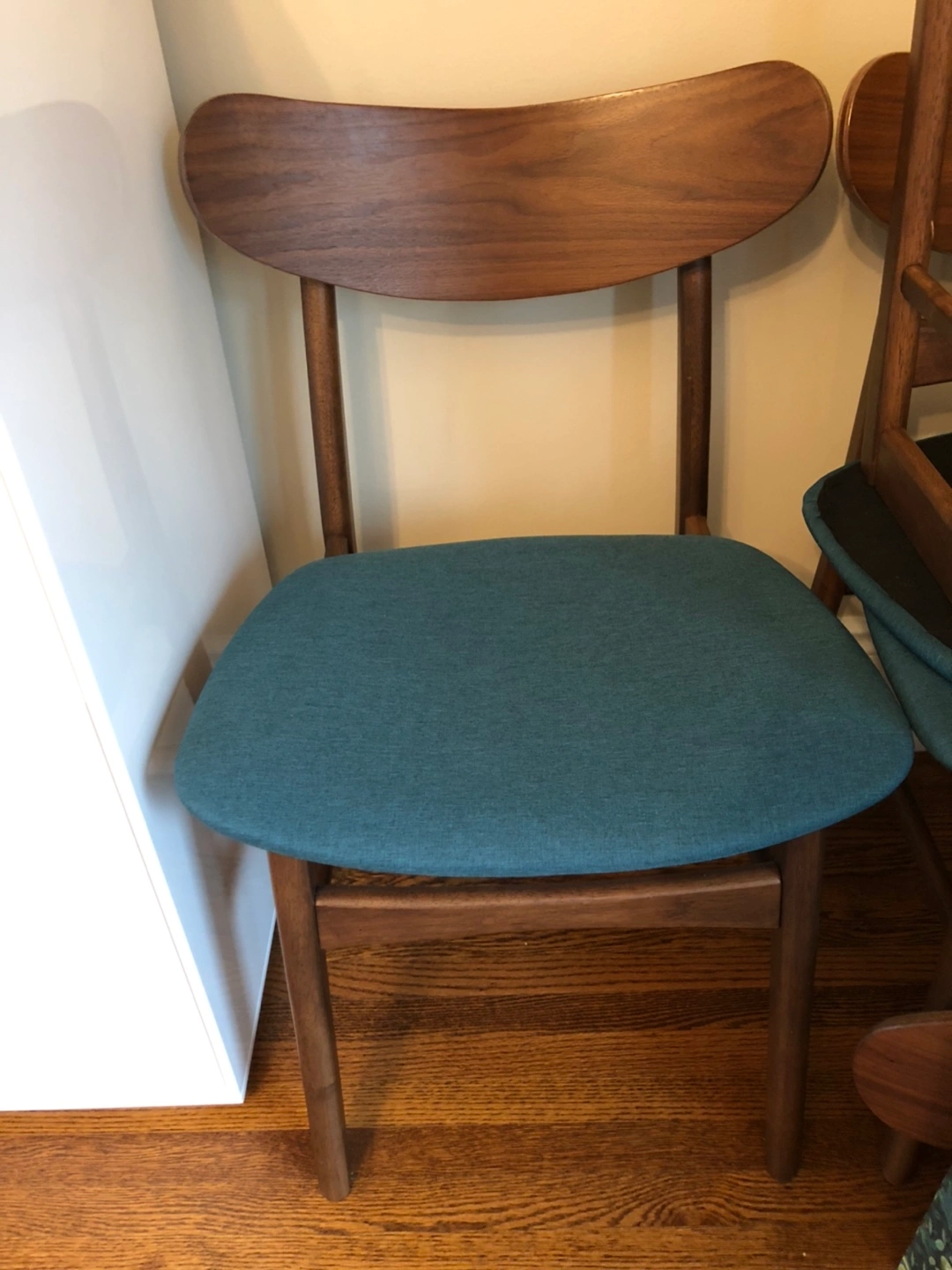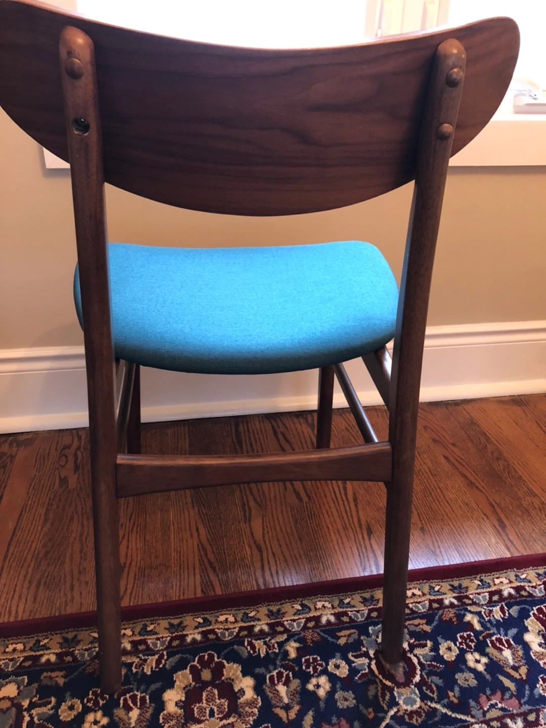 Danish inspired midcentury modern dining chairs in walnut finish with blue teal cushions. Super comfortable and nice looking. Love them but selling because we inherited a different kitchen table and chairs. Excellent condition. On one of the chairs, a button on the back is missing (last two pictures) but that’s an easy fix. $35 each or $120 for 4