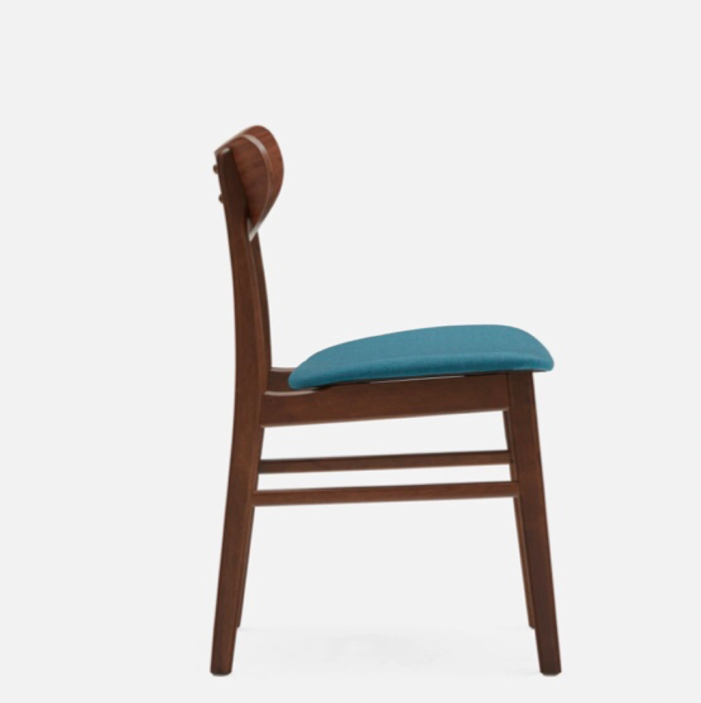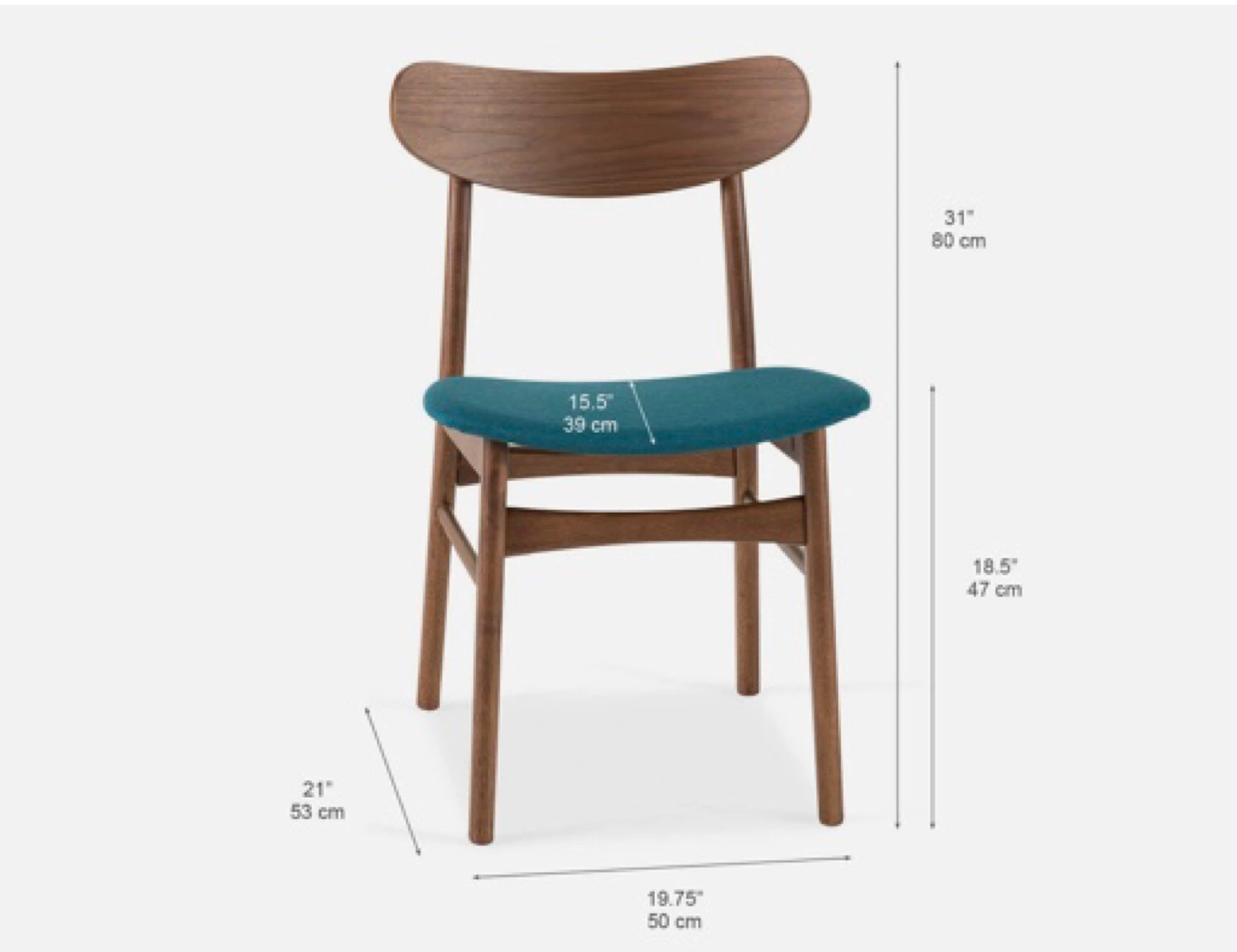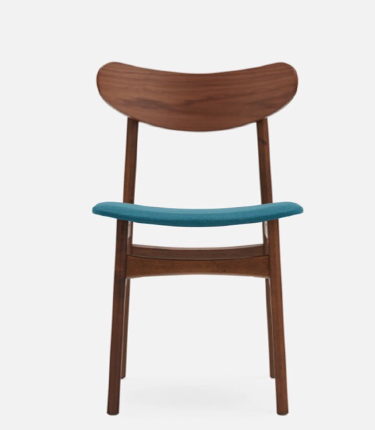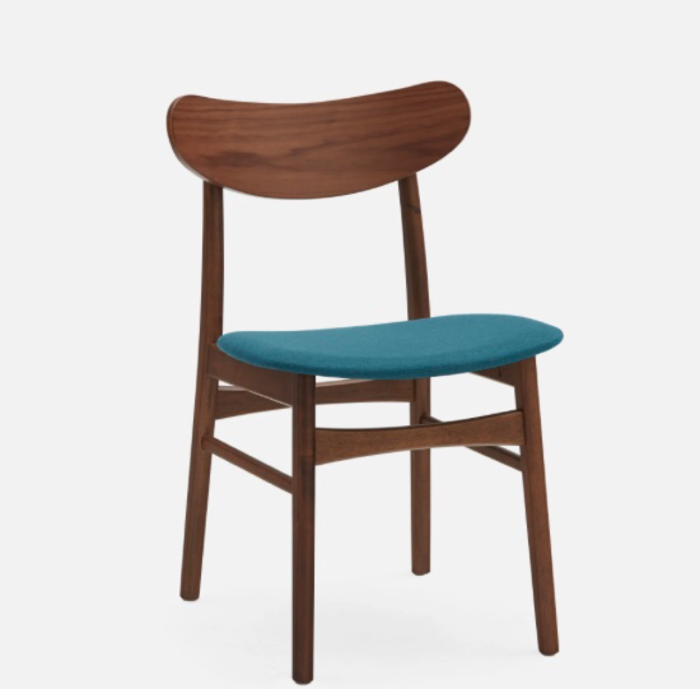 Danish inspired midcentury modern dining chairs in walnut finish with blue teal cushions. Super comfortable and nice looking. Love them but selling because we inherited a different kitchen table and chairs. Excellent condition. On one of the chairs, a button on the back is missing (last two pictures) but that’s an easy fix. $35 each or $120 for 4