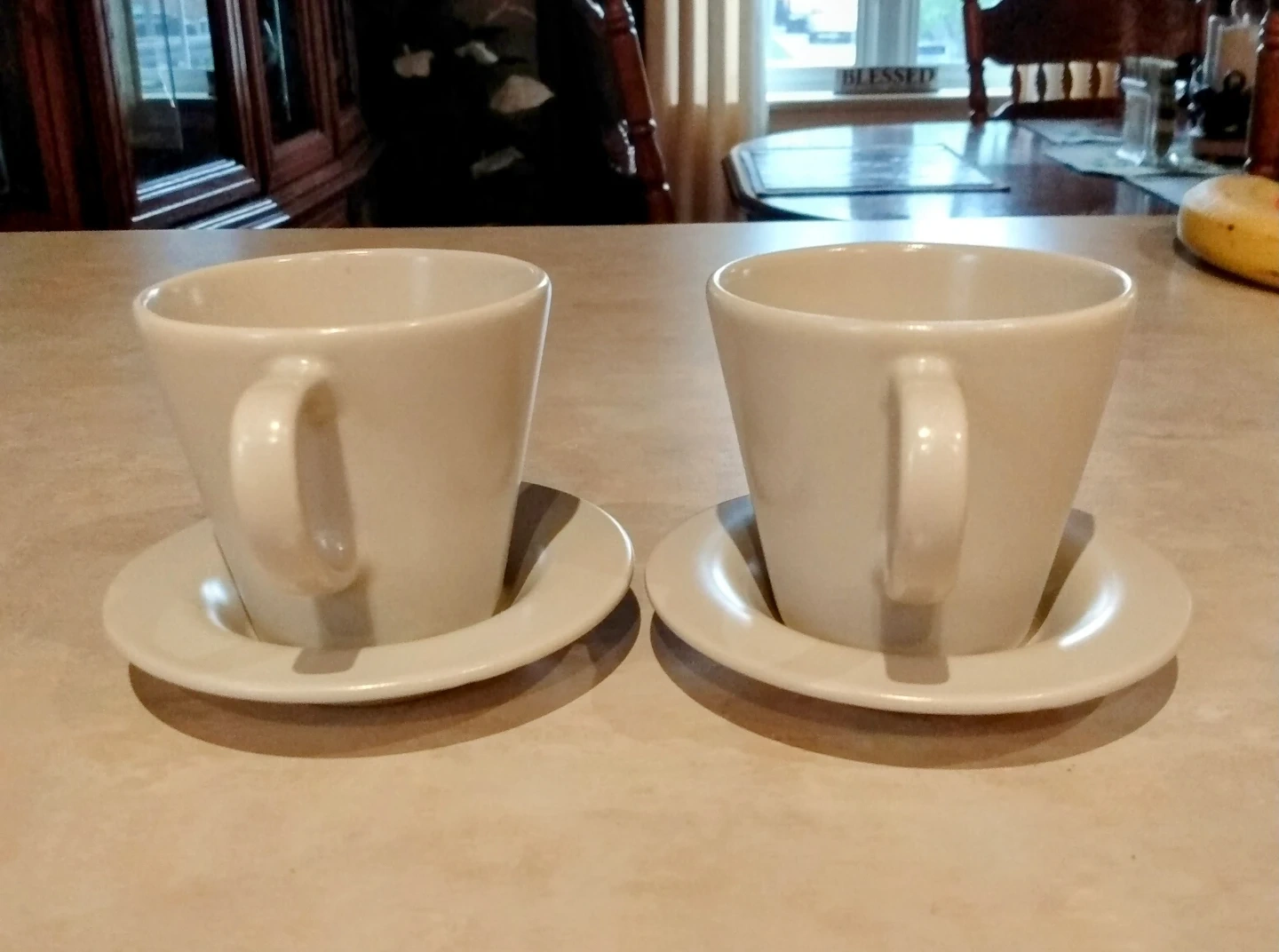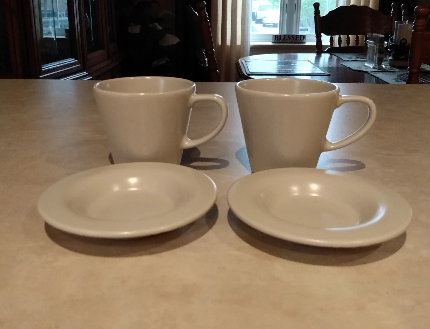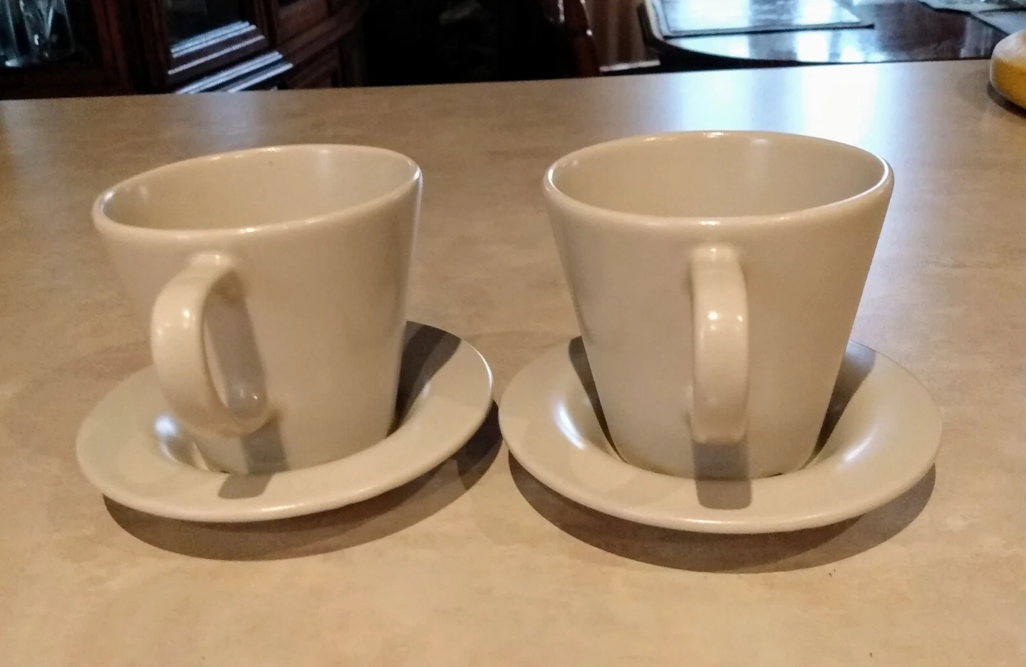 Pair of coffee cups and 2 saucers. Light beige colour. Simple design. Great for everyday use. (Cash pick up)