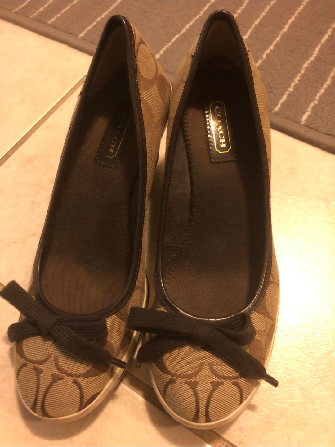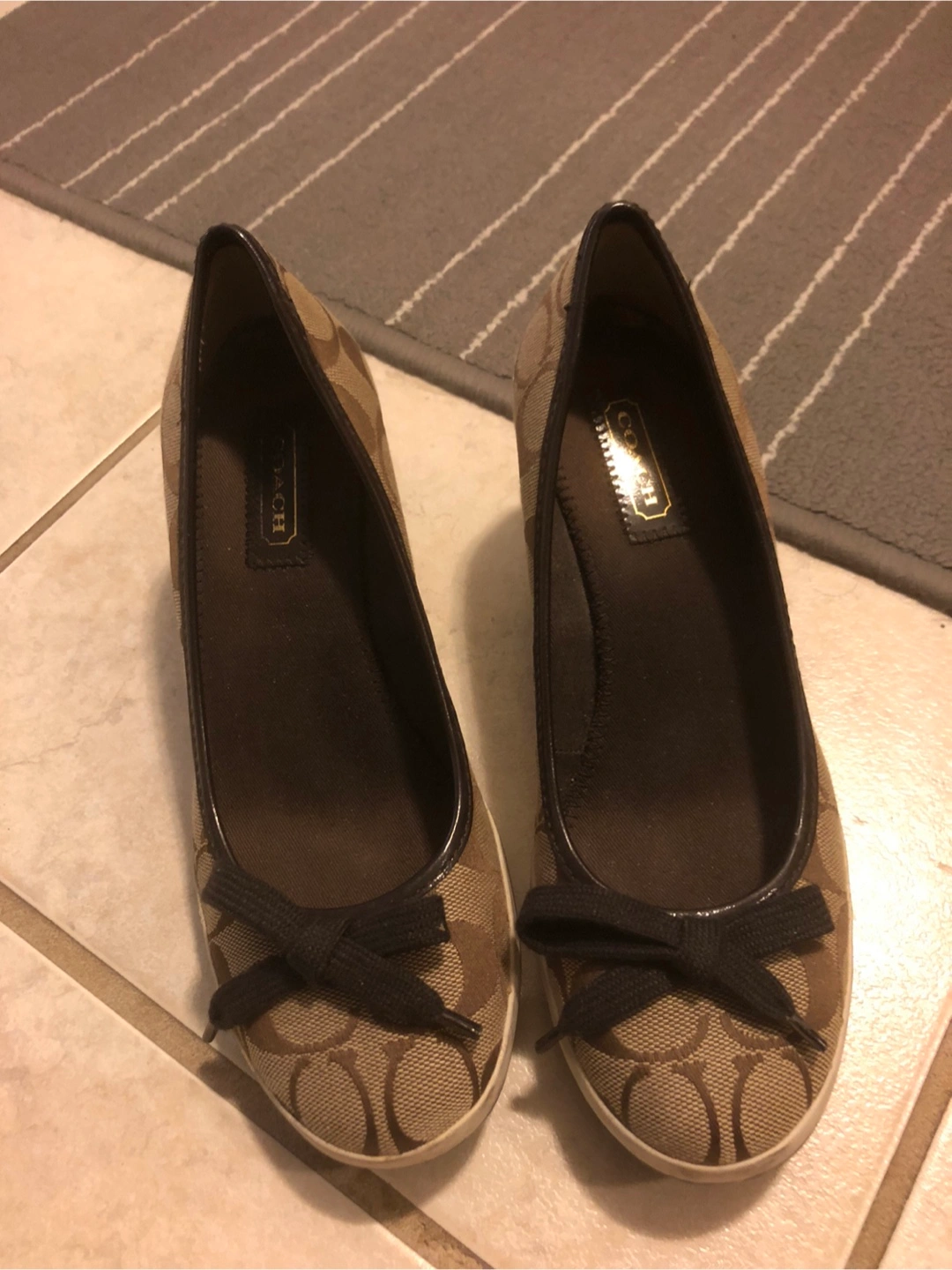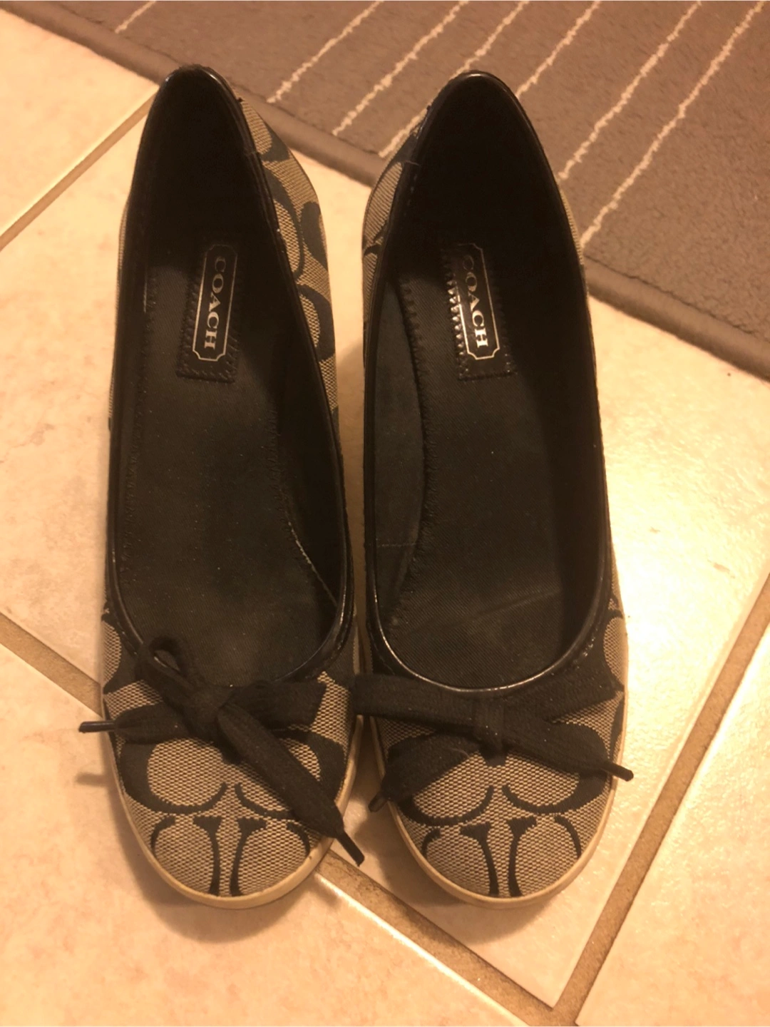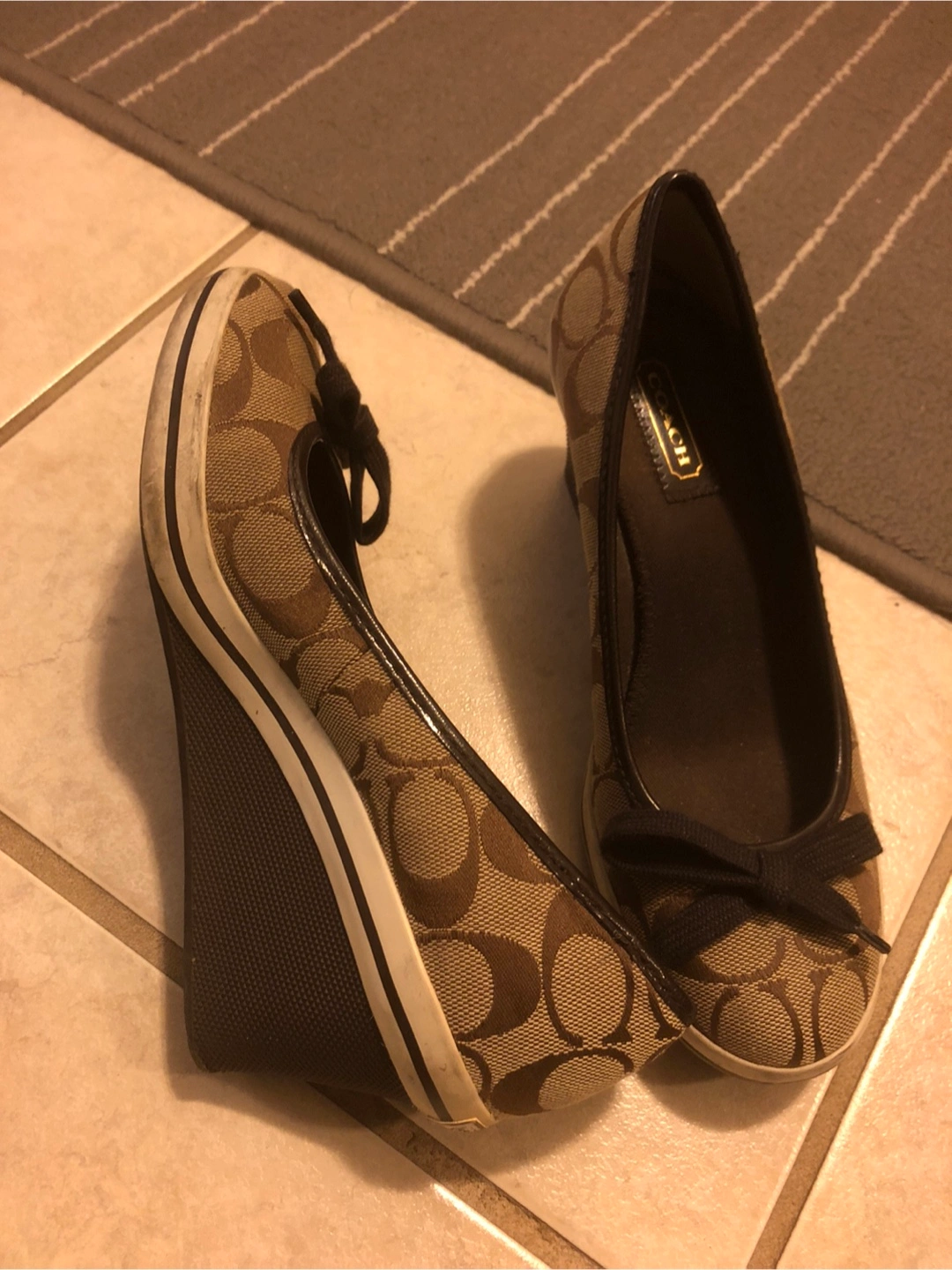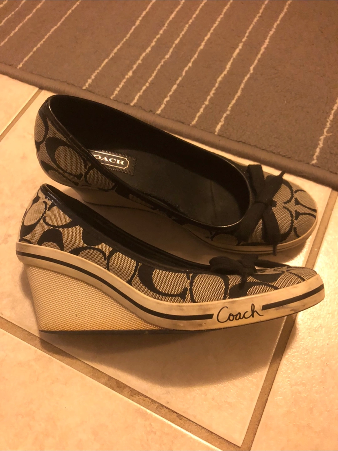 -Brown and beige Coach wedge shoes. Very Good condition $55 Small bow detail. Canvas material. -Black size 5.5 good condition/picture #1,2 -Both Pre-owned.