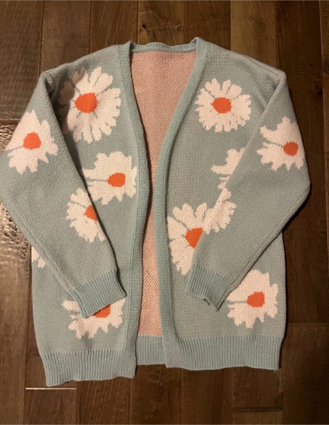 Light blue open cardigan. Features a white and orange daisy pattern. Long sleeves. Relaxed fit.