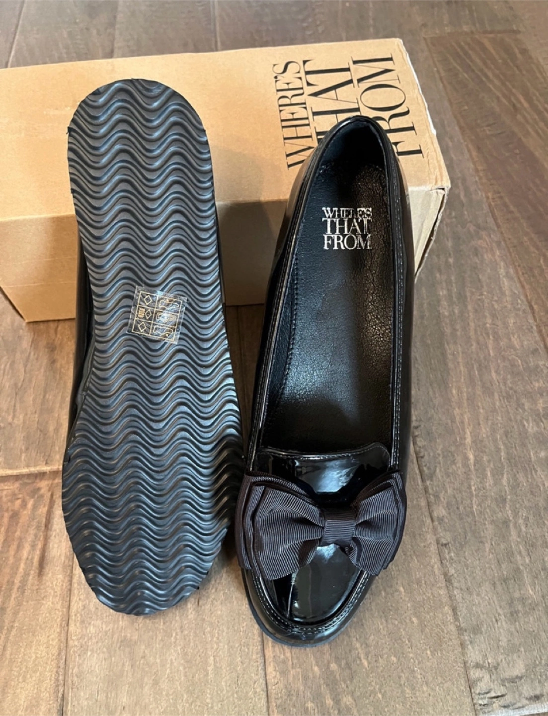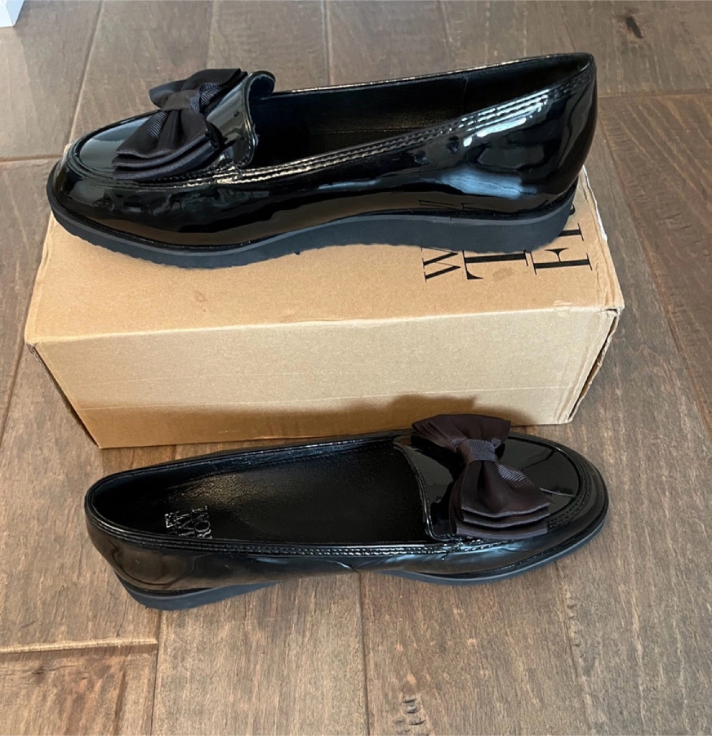 Black patent leather loafers with a cute bow detail. Comes in original box.