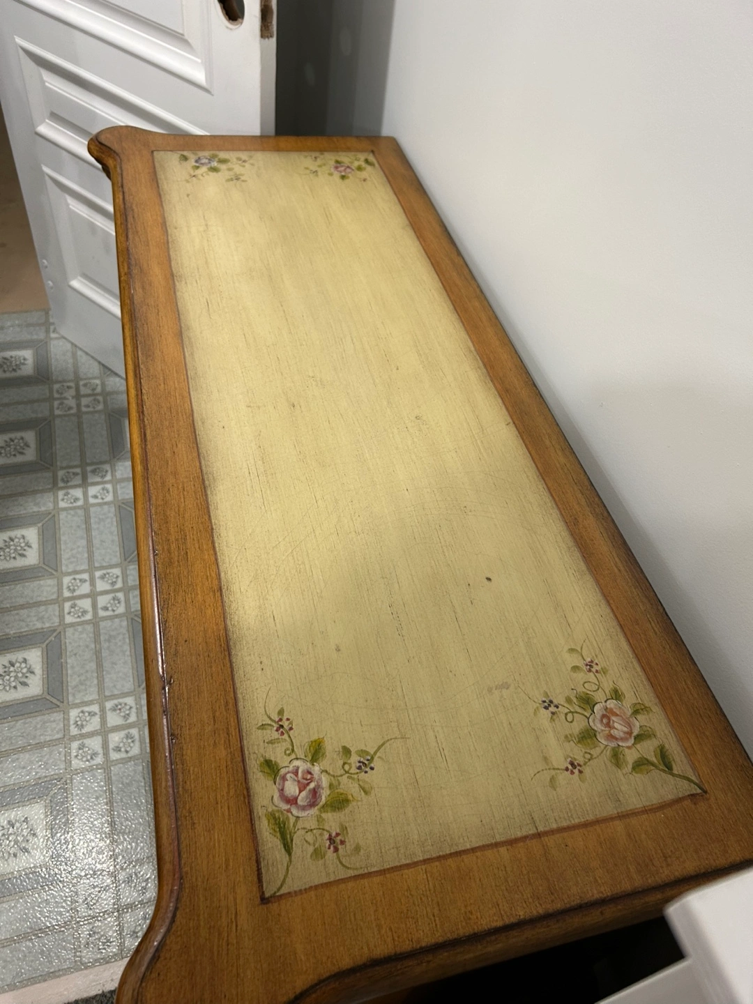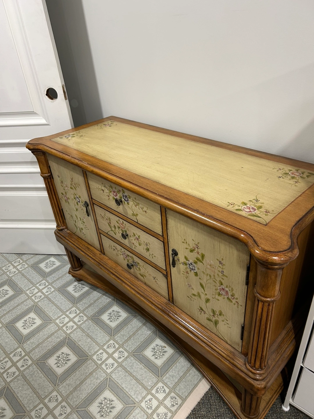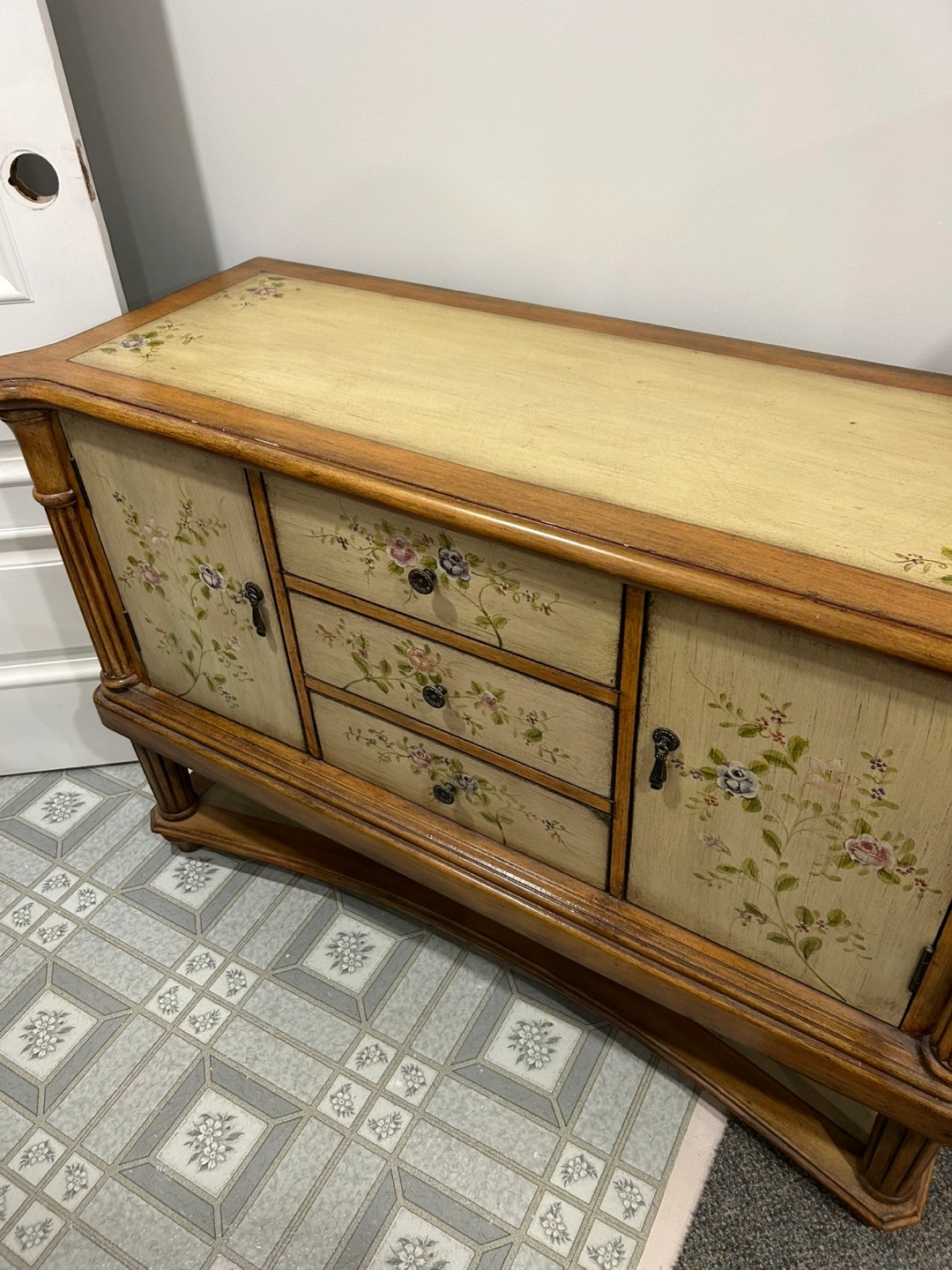 Beautiful hand-painted server. Three drawers, two doors. Floral design. Solid wood construction. Excellent condition.