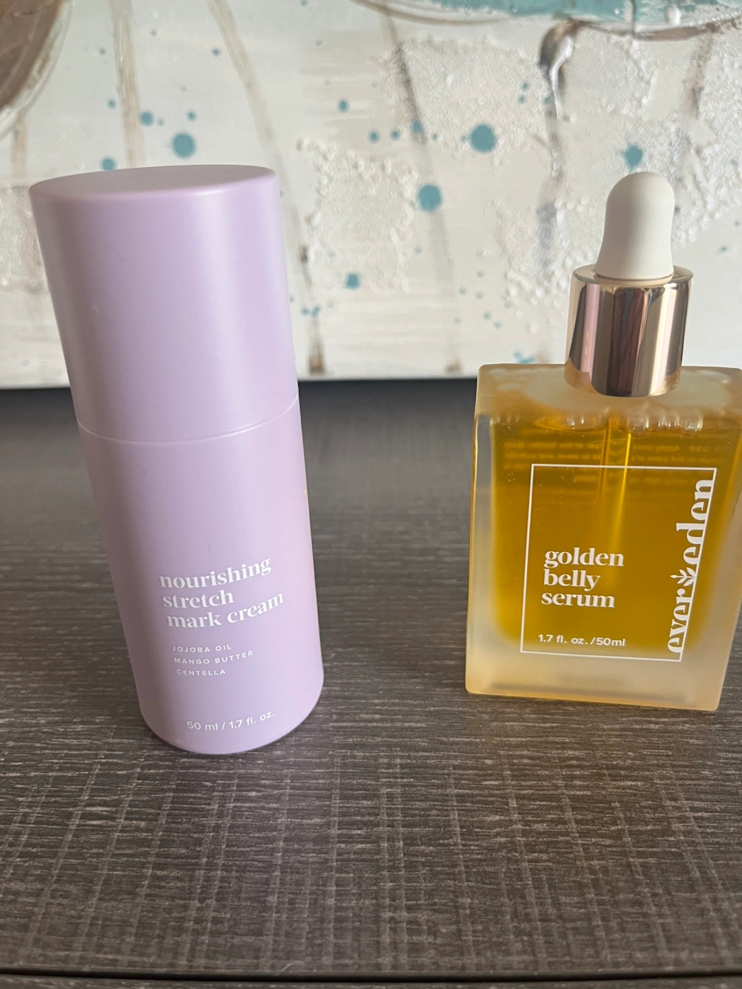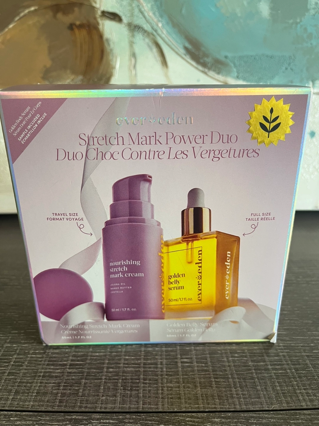 New, unopened evereden Stretch Mark Power Duo. Includes nourishing stretch mark cream and golden belly serum. Travel-sized. Pick up in Utopia