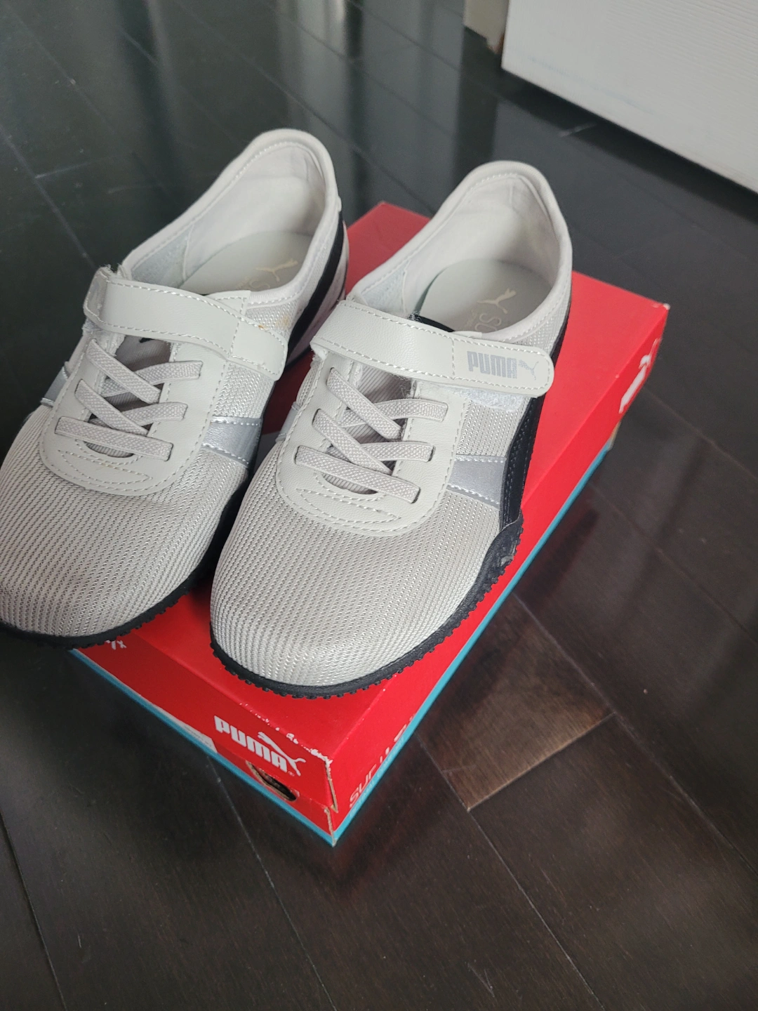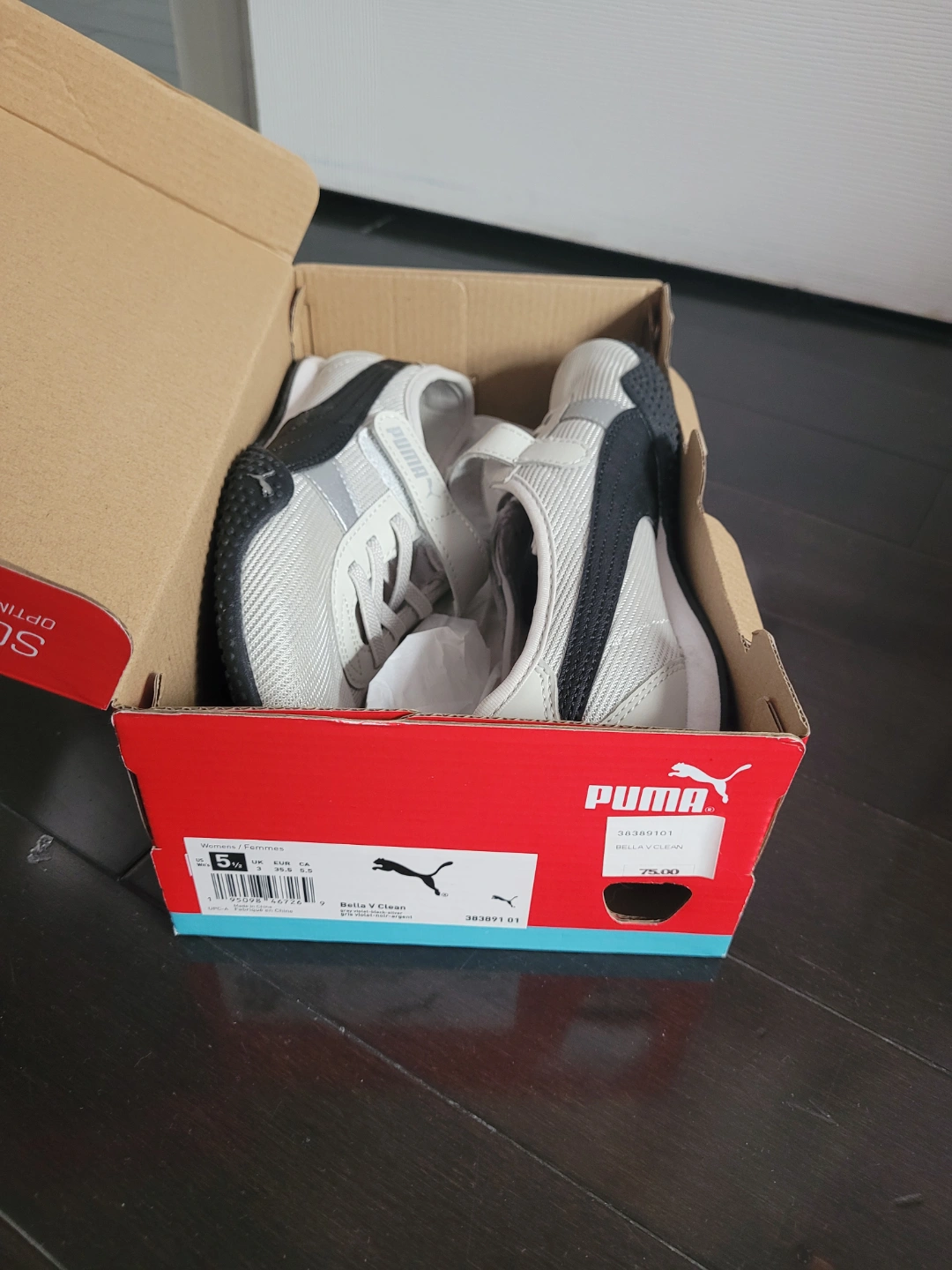 Puma Bella V Clean women's casual shoes. Size 5. Grey and white colour scheme. Velcro strap closure. Like new condition. Comes in original box.