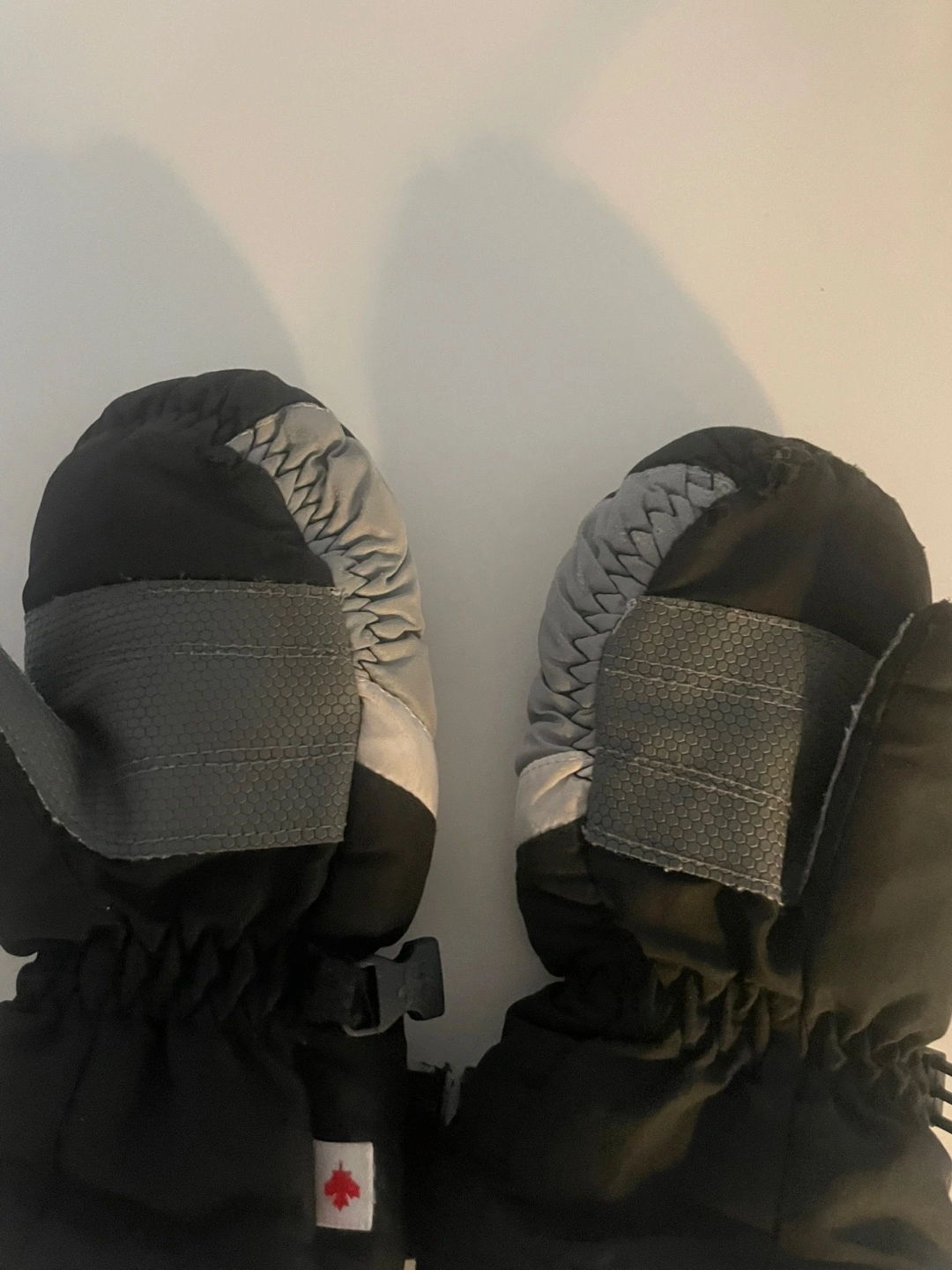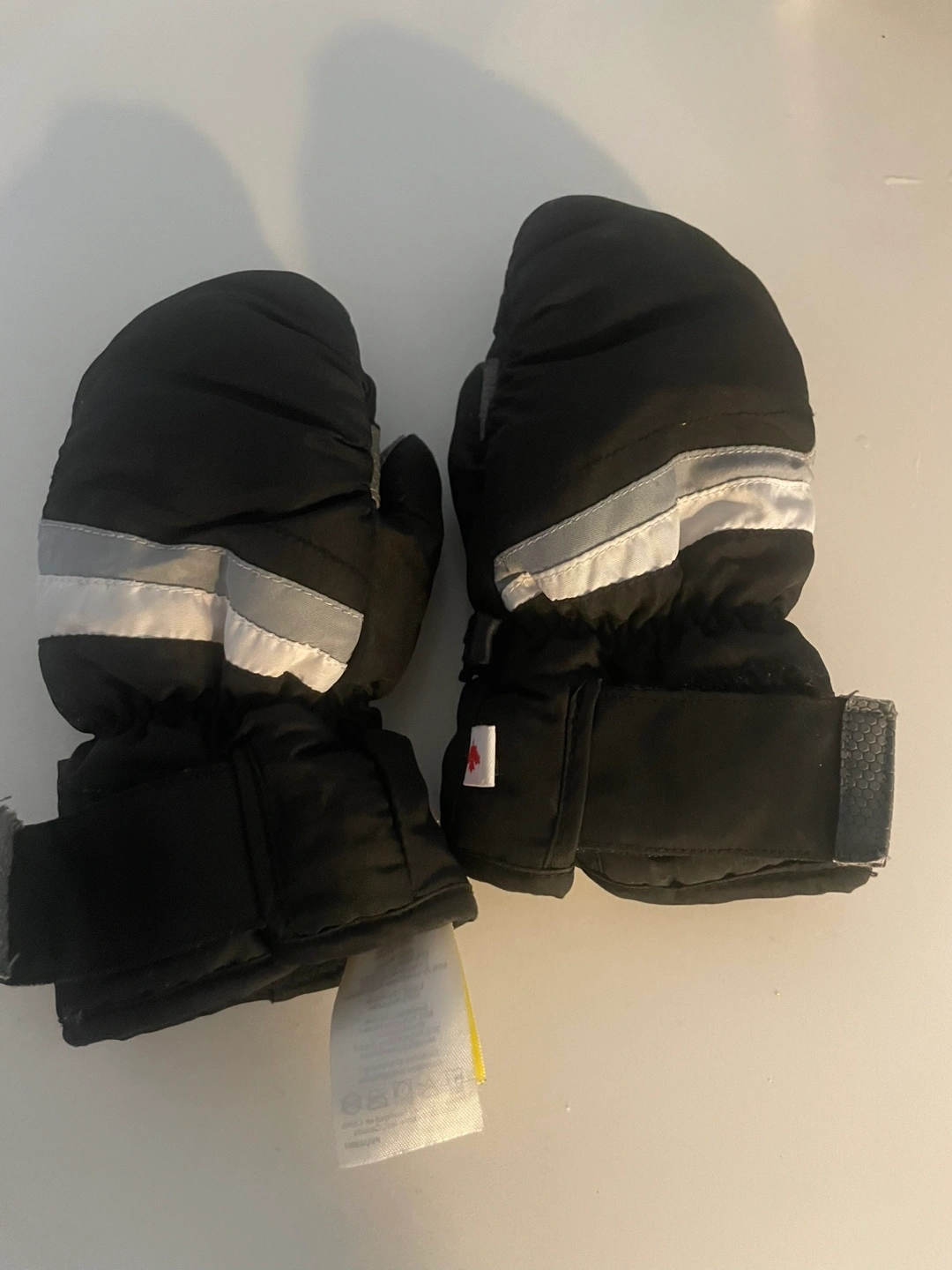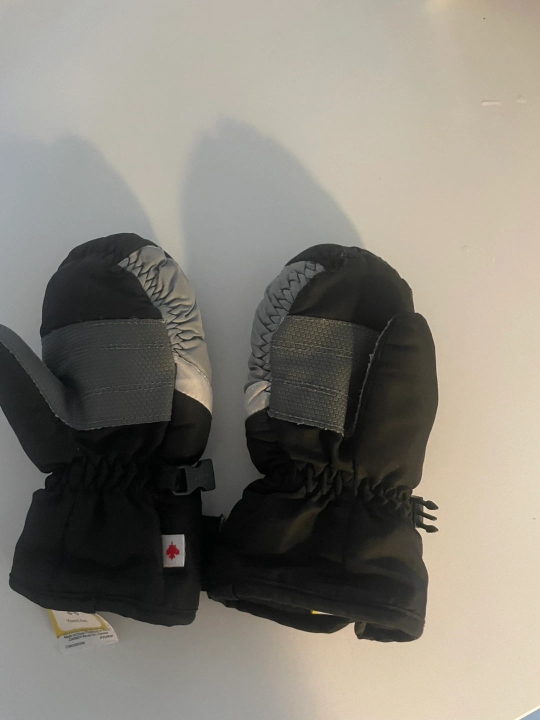 Pair of children's winter mittens. Black and grey colour scheme. Size small. Features adjustable wrist straps and a mitten cuff. Suitable for snow play.