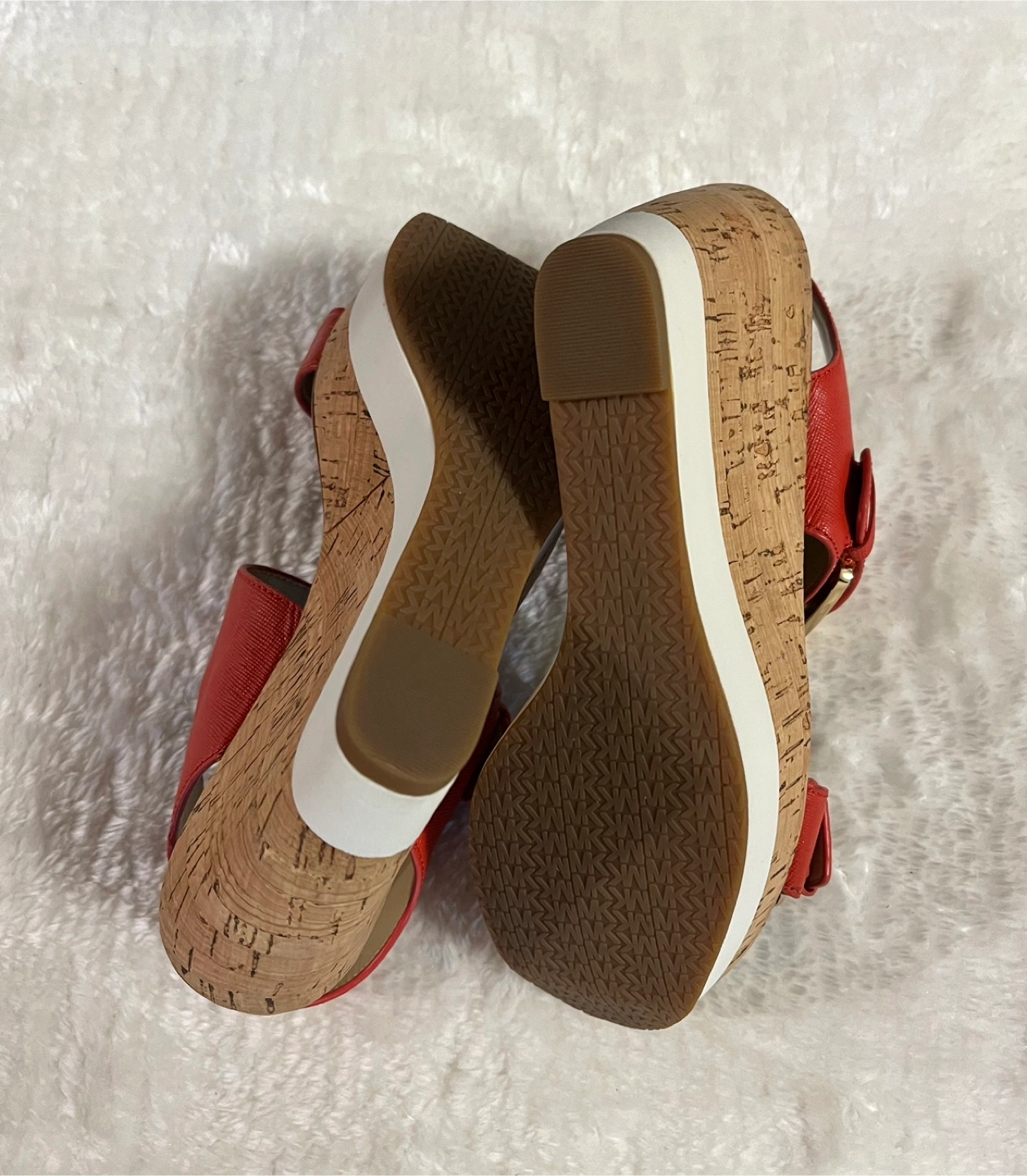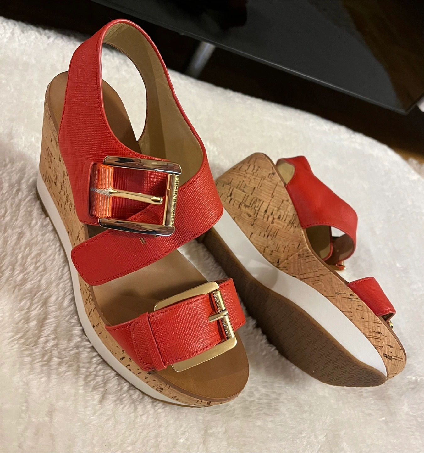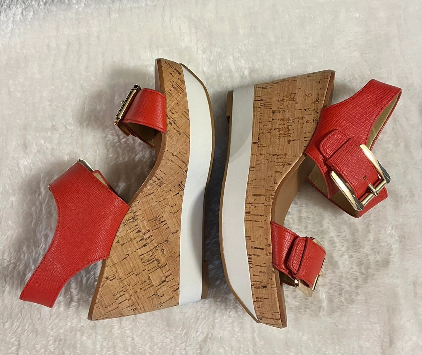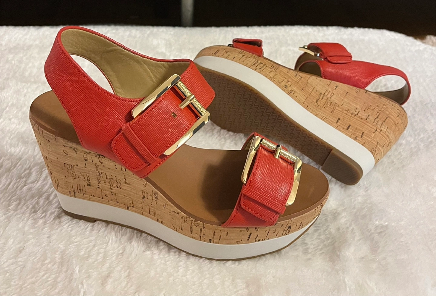Beautiful M K red leather wedge sandals Cork wedges Gold buckles Ankle strap Women Size 6 New- only worn once Pick up Bloor and Islington Etobicoke
