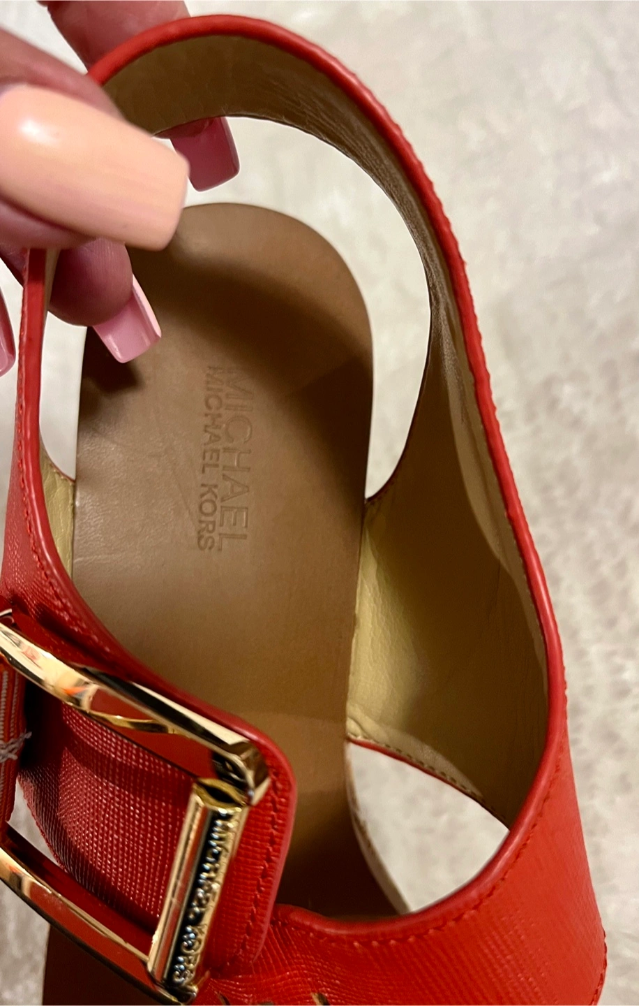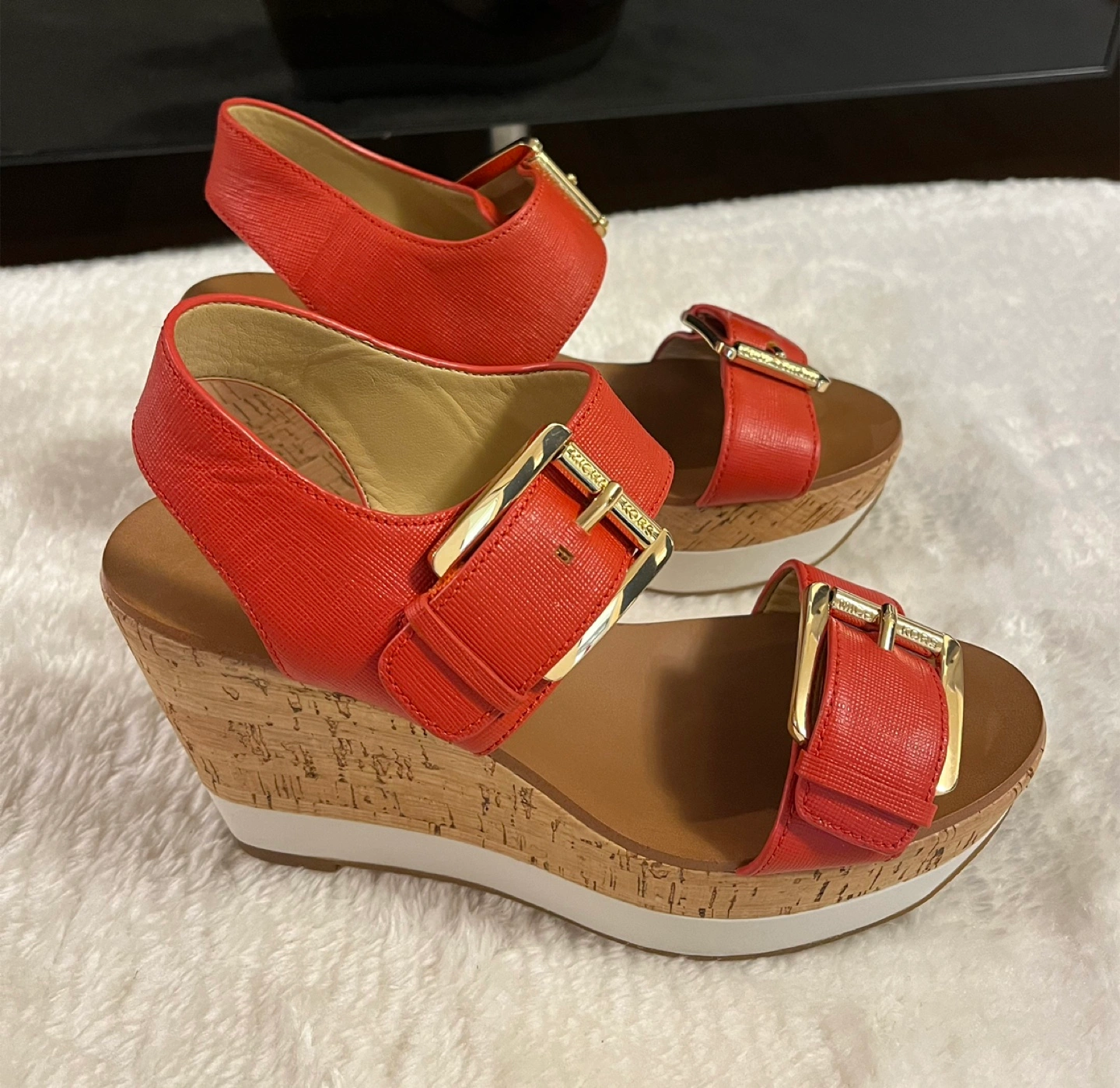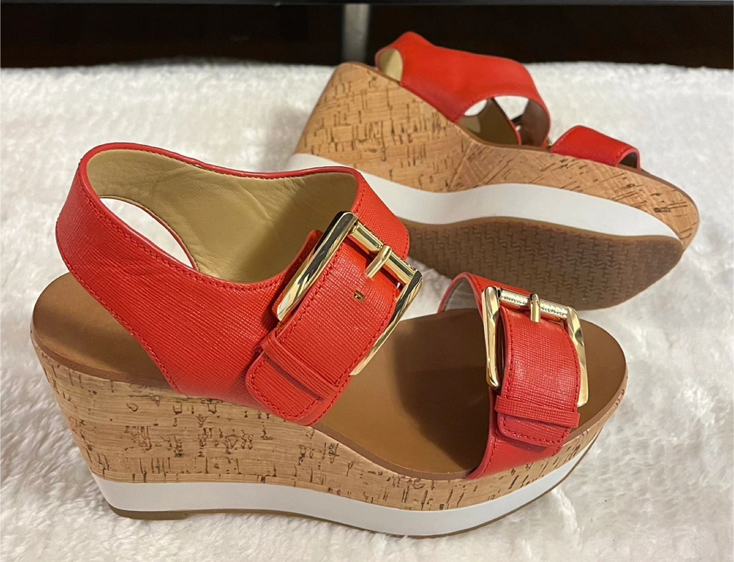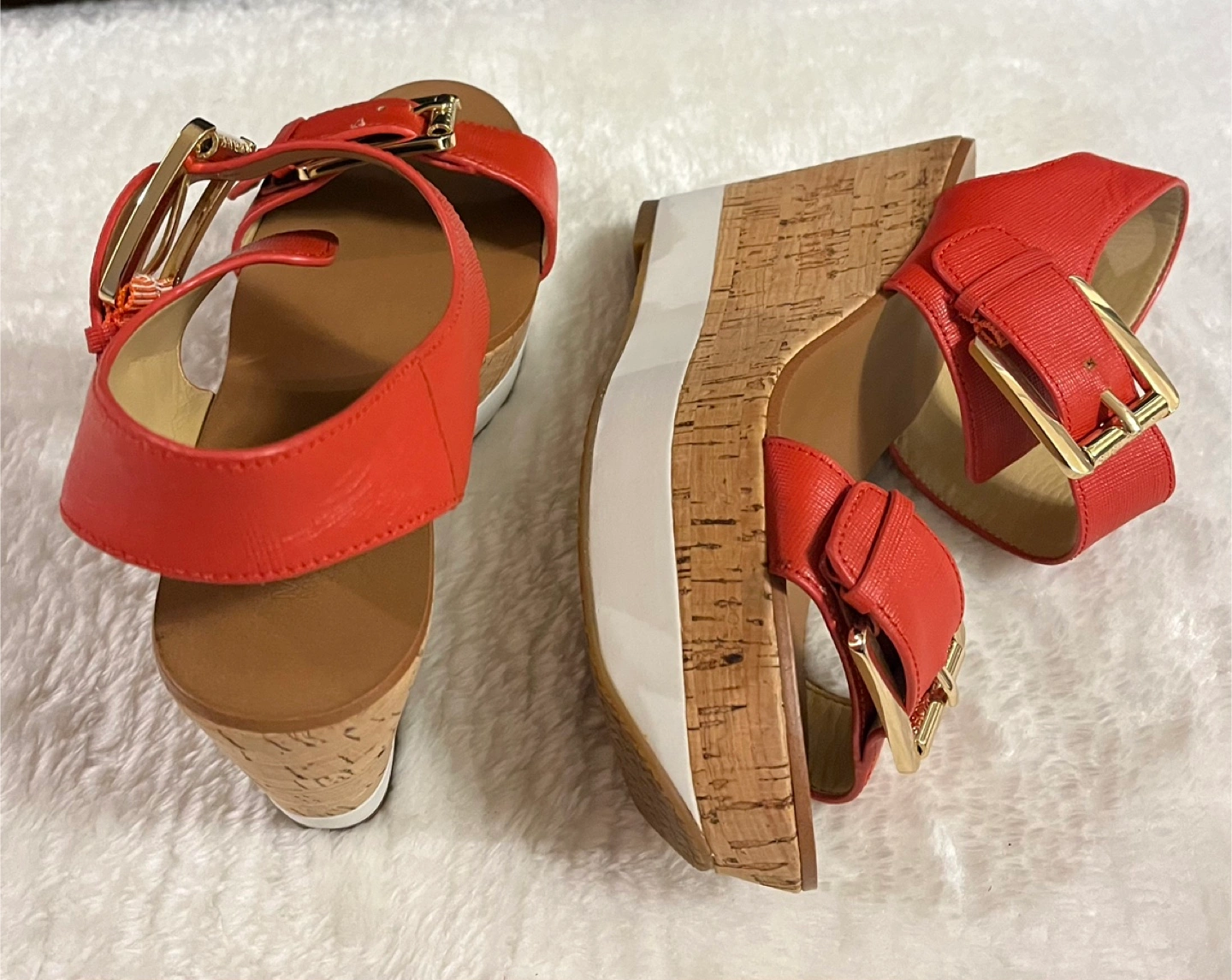 Beautiful M K red leather wedge sandals Cork wedges Gold buckles Ankle strap Women Size 6 New- only worn once Pick up Bloor and Islington Etobicoke