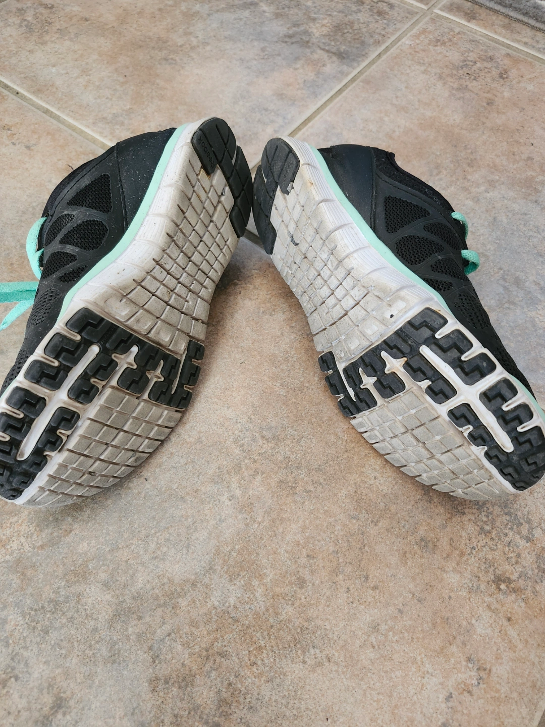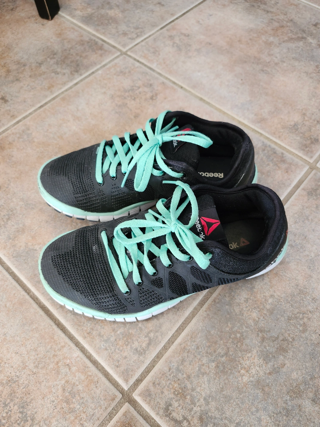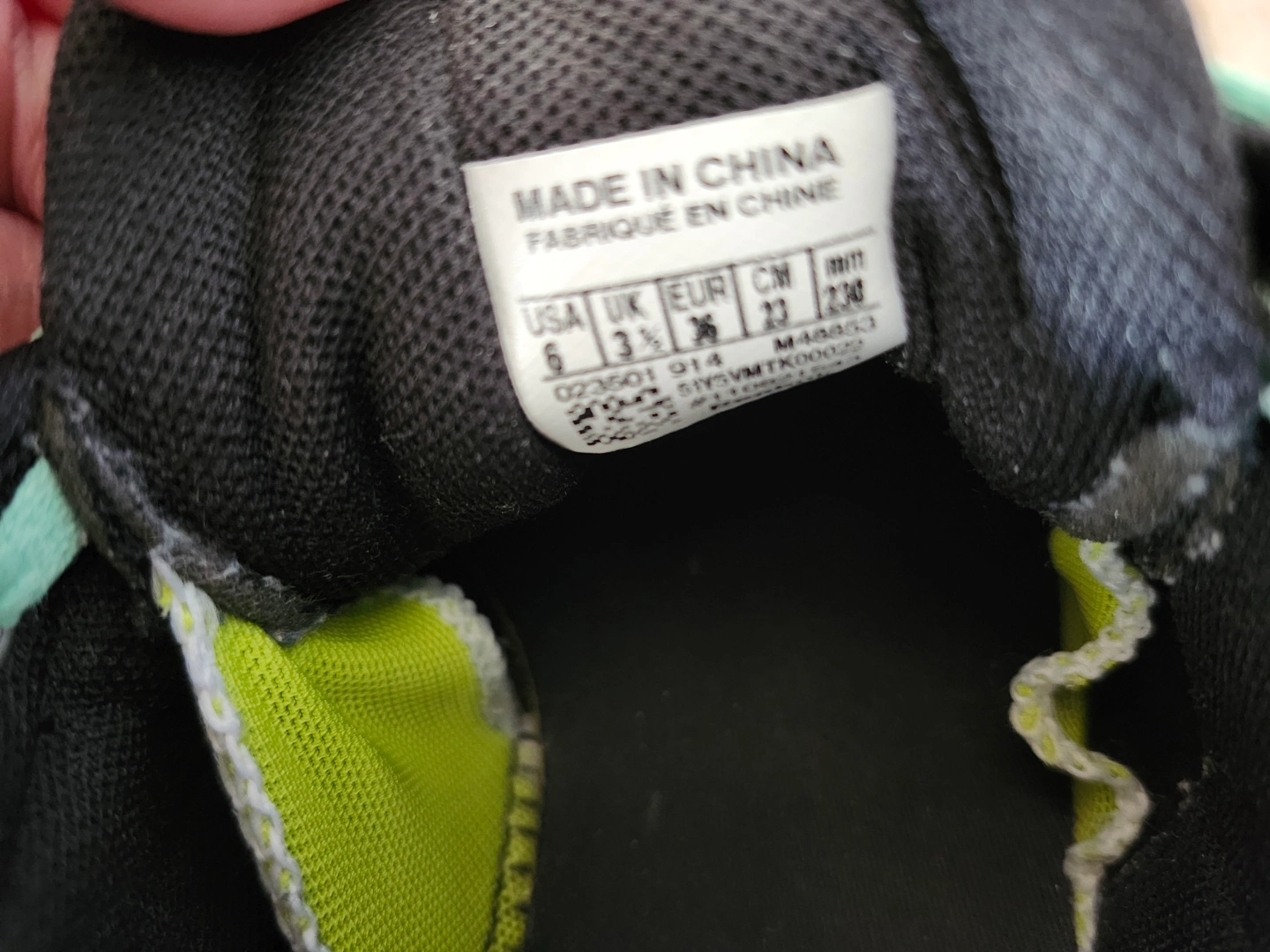 Black running shoes with teal accents. Women's size US 6. Made in China. Pre-owned.
