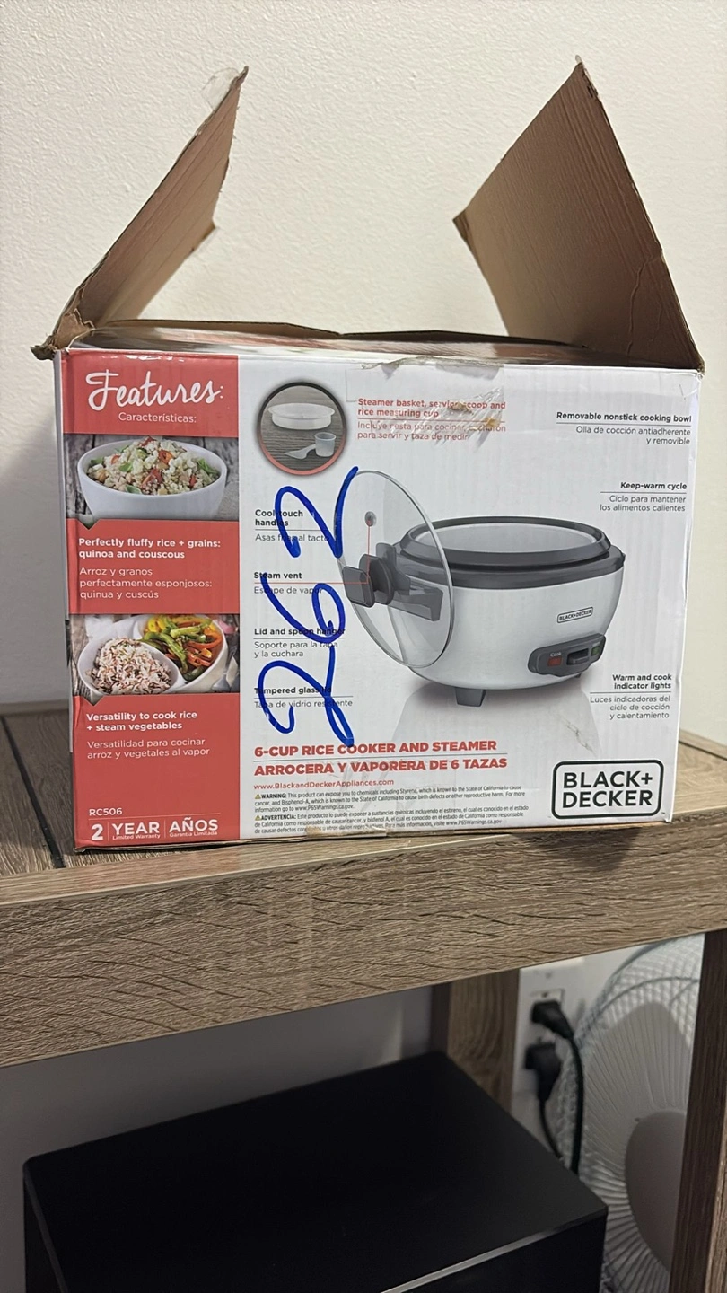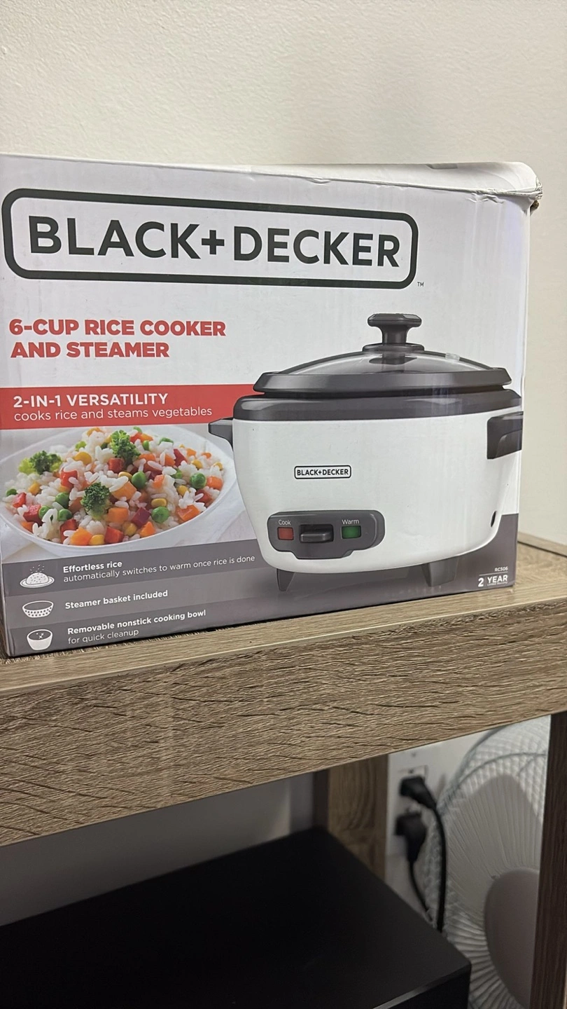 New in box, 6-cup rice cooker and steamer. Cooks rice and steams vegetables. Features removable nonstick cooking bowl for quick cleanup. Automatic switch to warm once rice is done. Steamer basket included.
