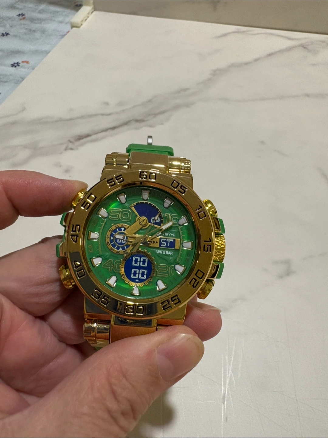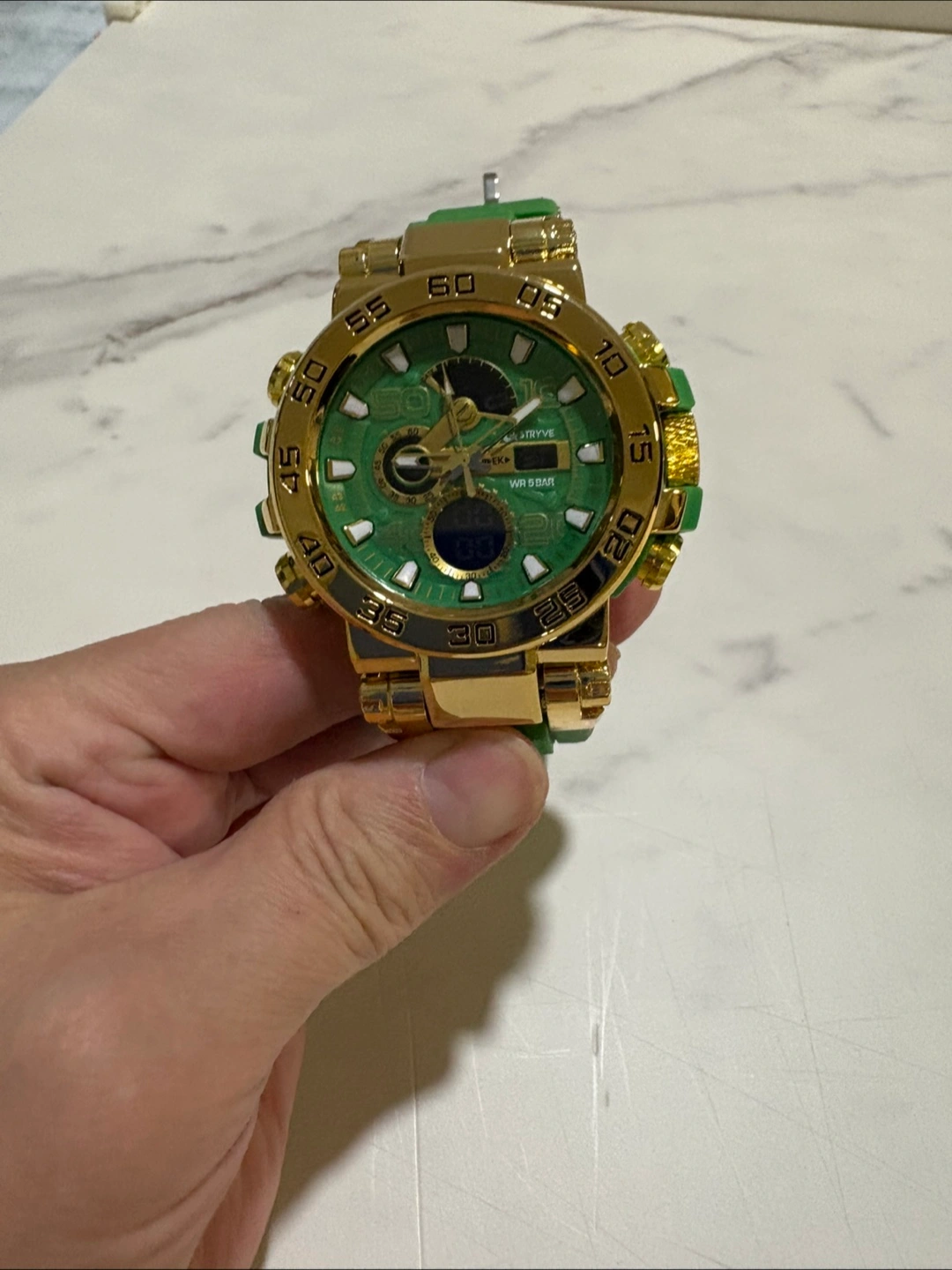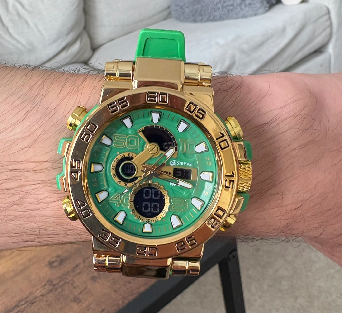 Description: Never used, eye-catching STRYVE men’s wristwatch in bold green and gold colors. Features both analog and digital displays, stopwatch, calendar, and backlight. Water resistant up to 50 meters (5 BAR). Perfect for everyday style or sporty looks. Comfortable rubber strap. Great gift or personal use! Price is final, no negotiations. Item is exactly as shown in the pictures
