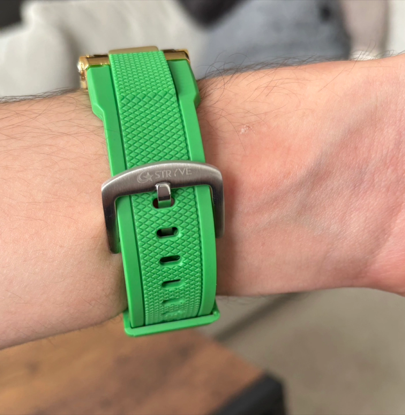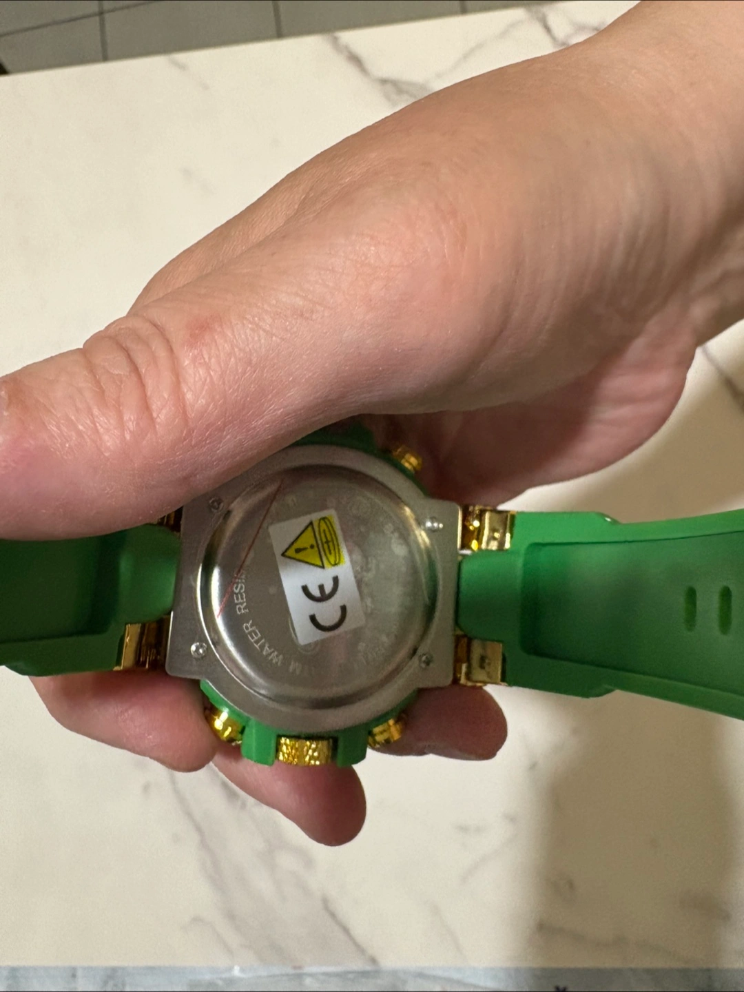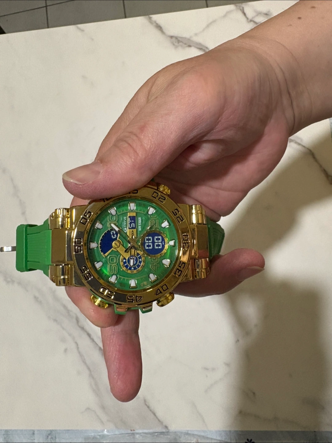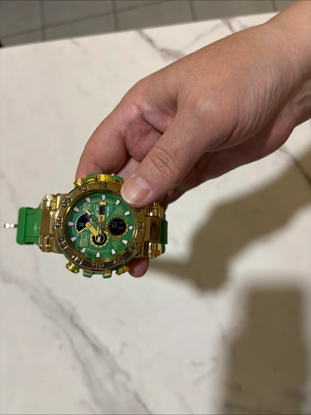 Description: Never used, eye-catching STRYVE men’s wristwatch in bold green and gold colors. Features both analog and digital displays, stopwatch, calendar, and backlight. Water resistant up to 50 meters (5 BAR). Perfect for everyday style or sporty looks. Comfortable rubber strap. Great gift or personal use! Price is final, no negotiations. Item is exactly as shown in the pictures