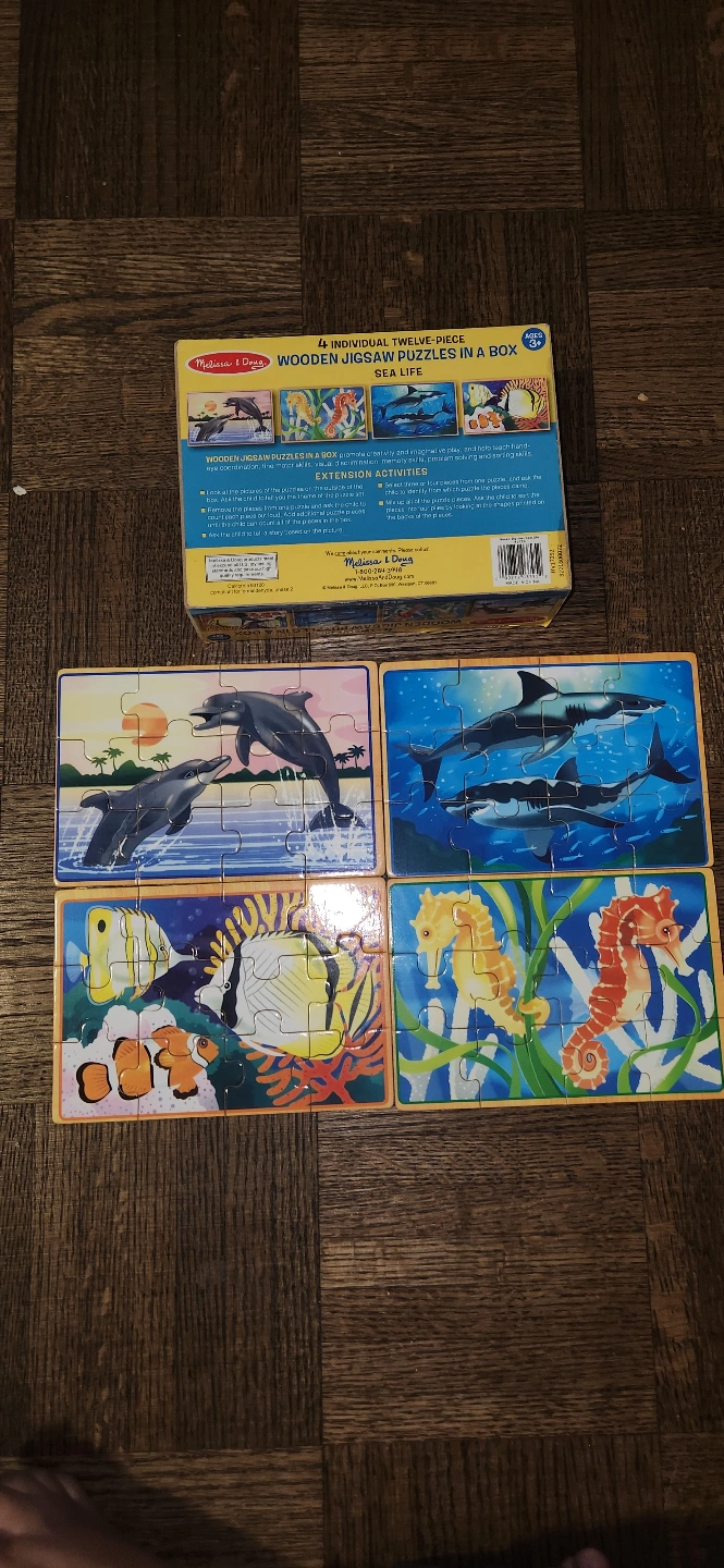 Four 12-piece wooden jigsaw puzzles. Sea life theme. Includes dolphins, sharks, seahorses, and tropical fish.