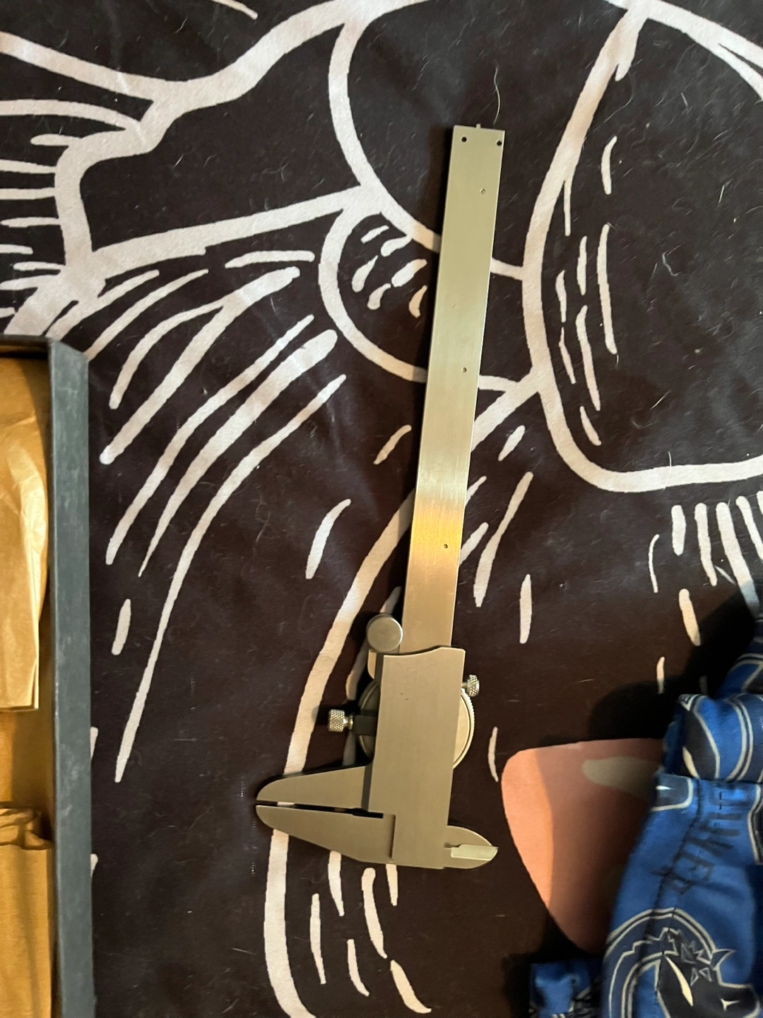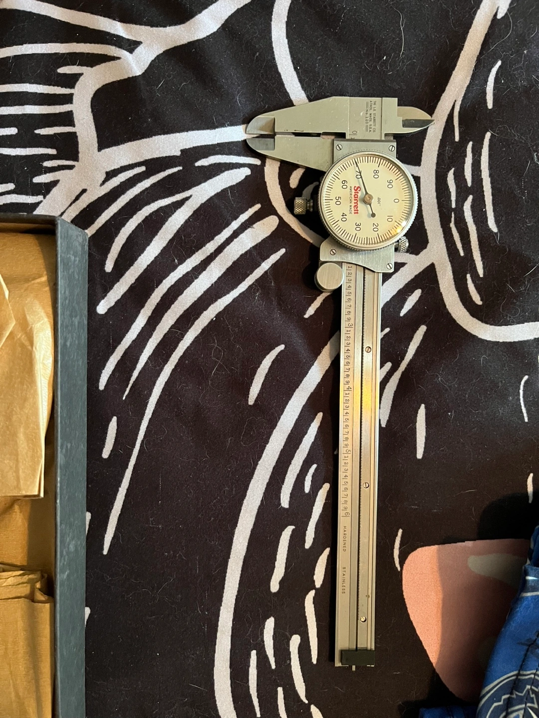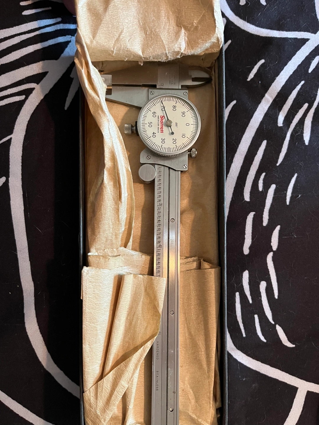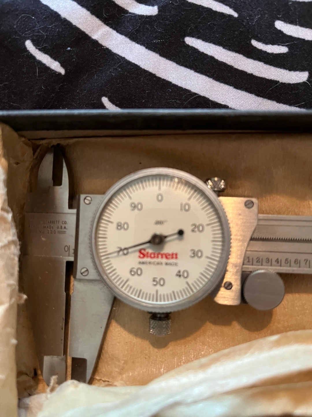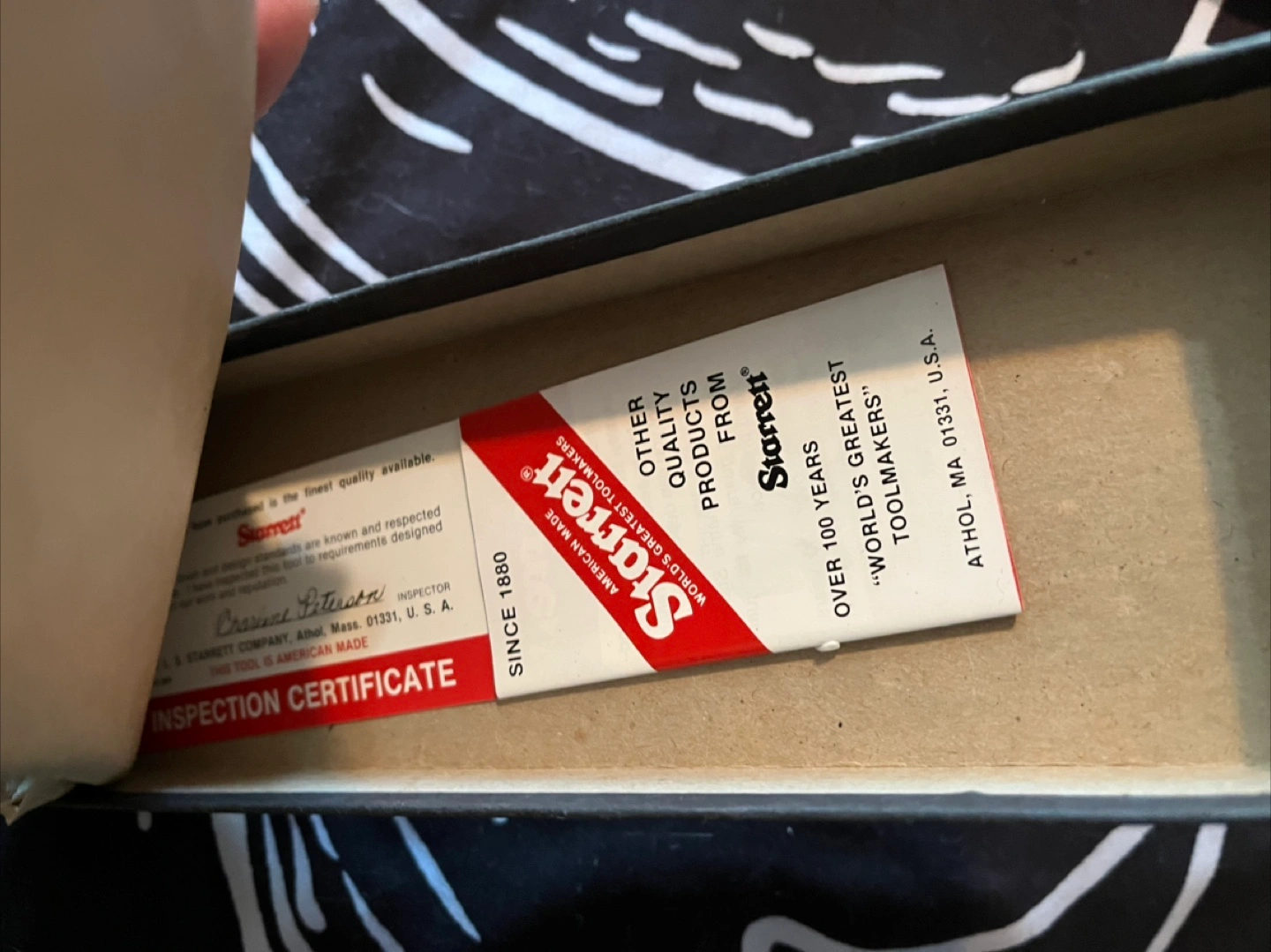 Used Starrett dial caliper in original box. Measures up to 6 inches. Shows minor wear. Great for collectors or hobbyists.