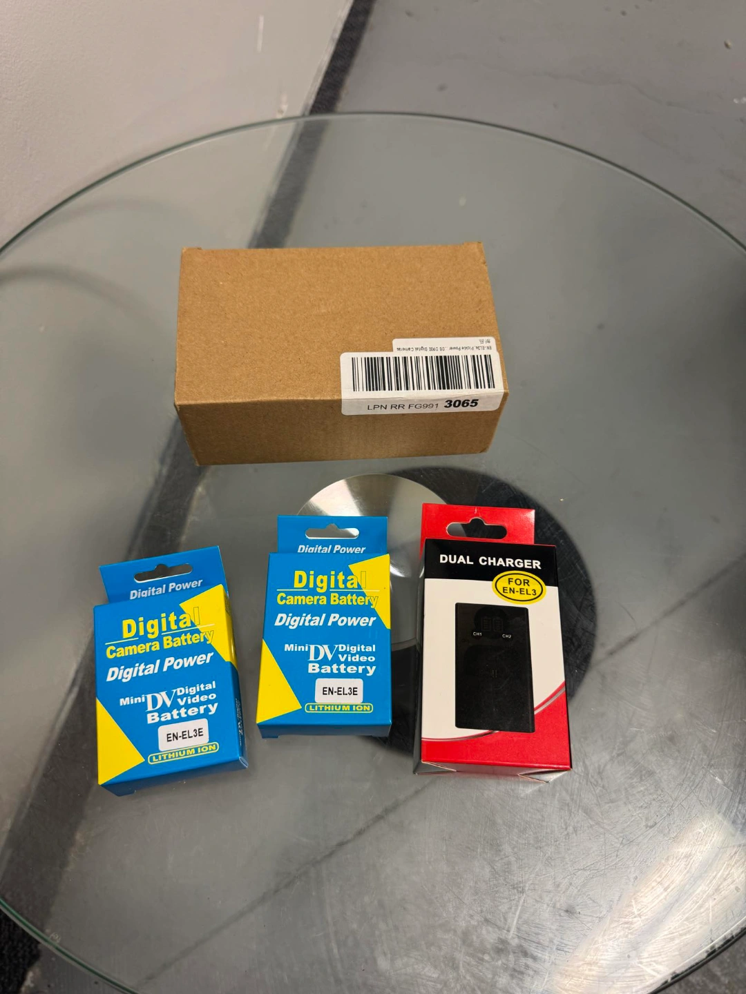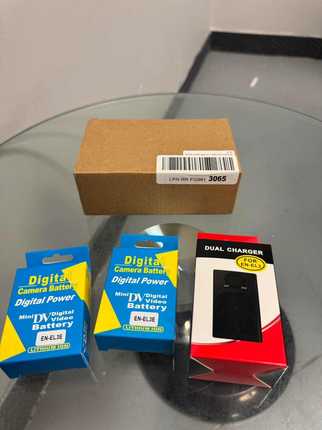 Two EN-EL3E lithium-ion batteries and a dual charger. New in box. Great for cameras and camcorders. READ ME BEFORE PURCHASING Please note that all items listed are available for pickup only at our warehouse location: 265 Rimrock Rd, Unit 2B, North York, ON Kindly ensure availability before arriving. If you have any questions or need more information about an item, feel free to message us directly. Thank you for your interest