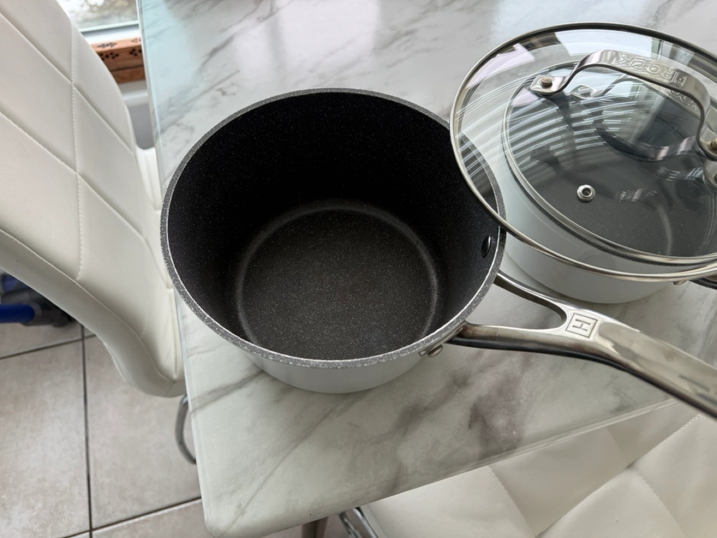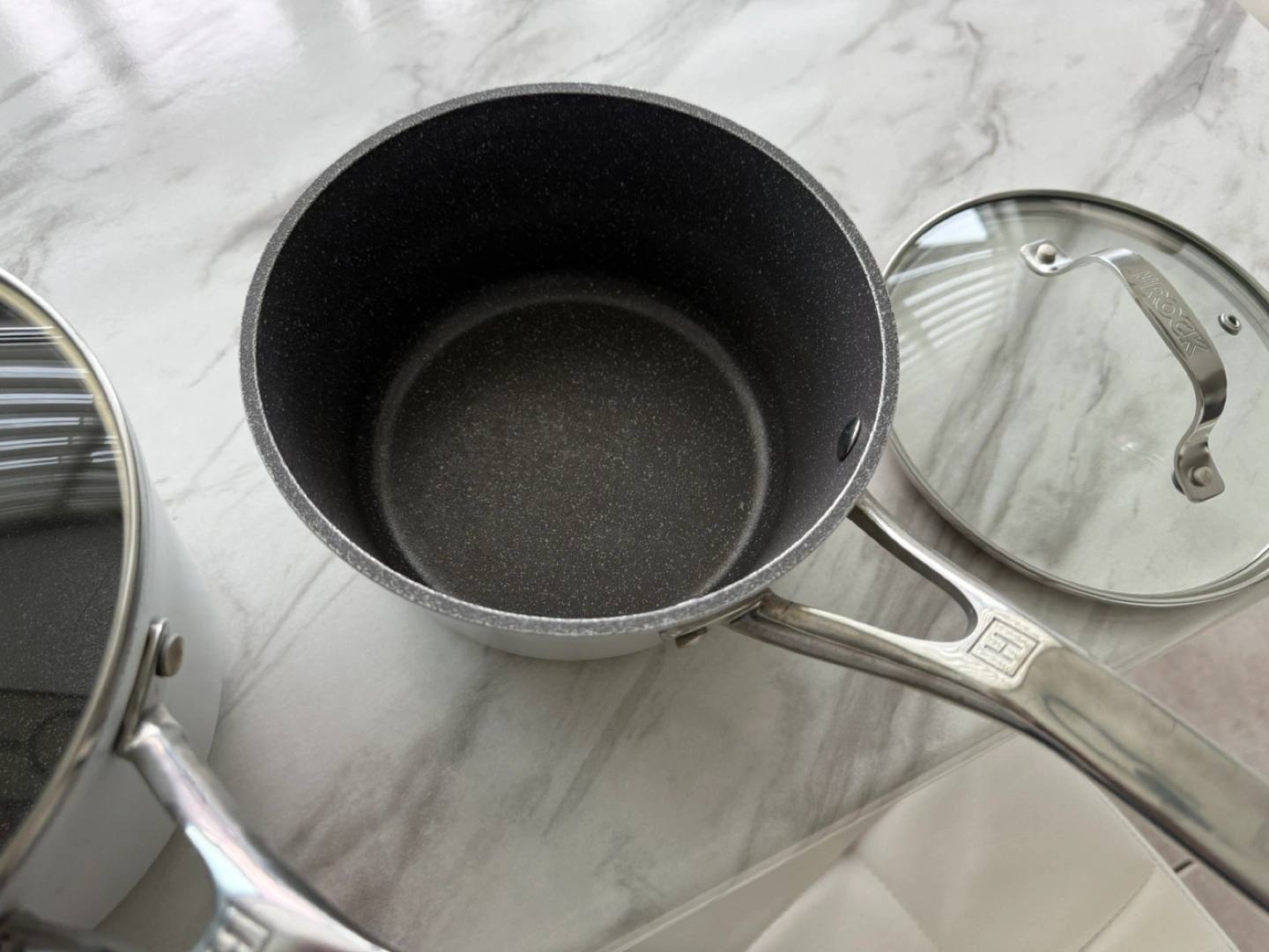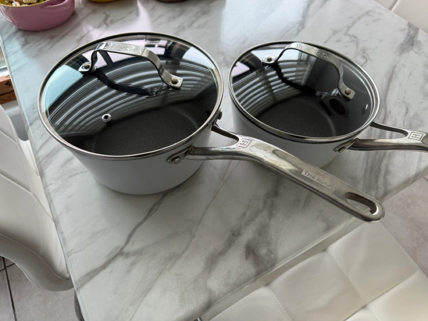 Two-piece cookware set. White exterior, dark grey interior. Stainless steel handles and lids. Great for smaller cooking projects.