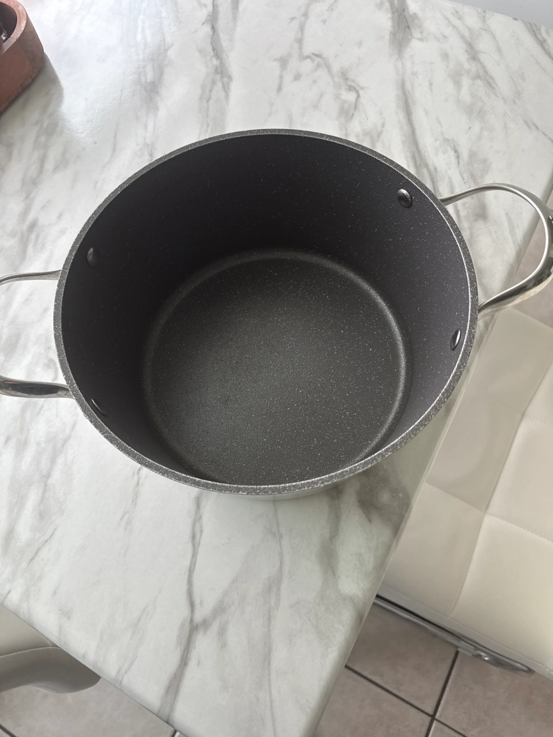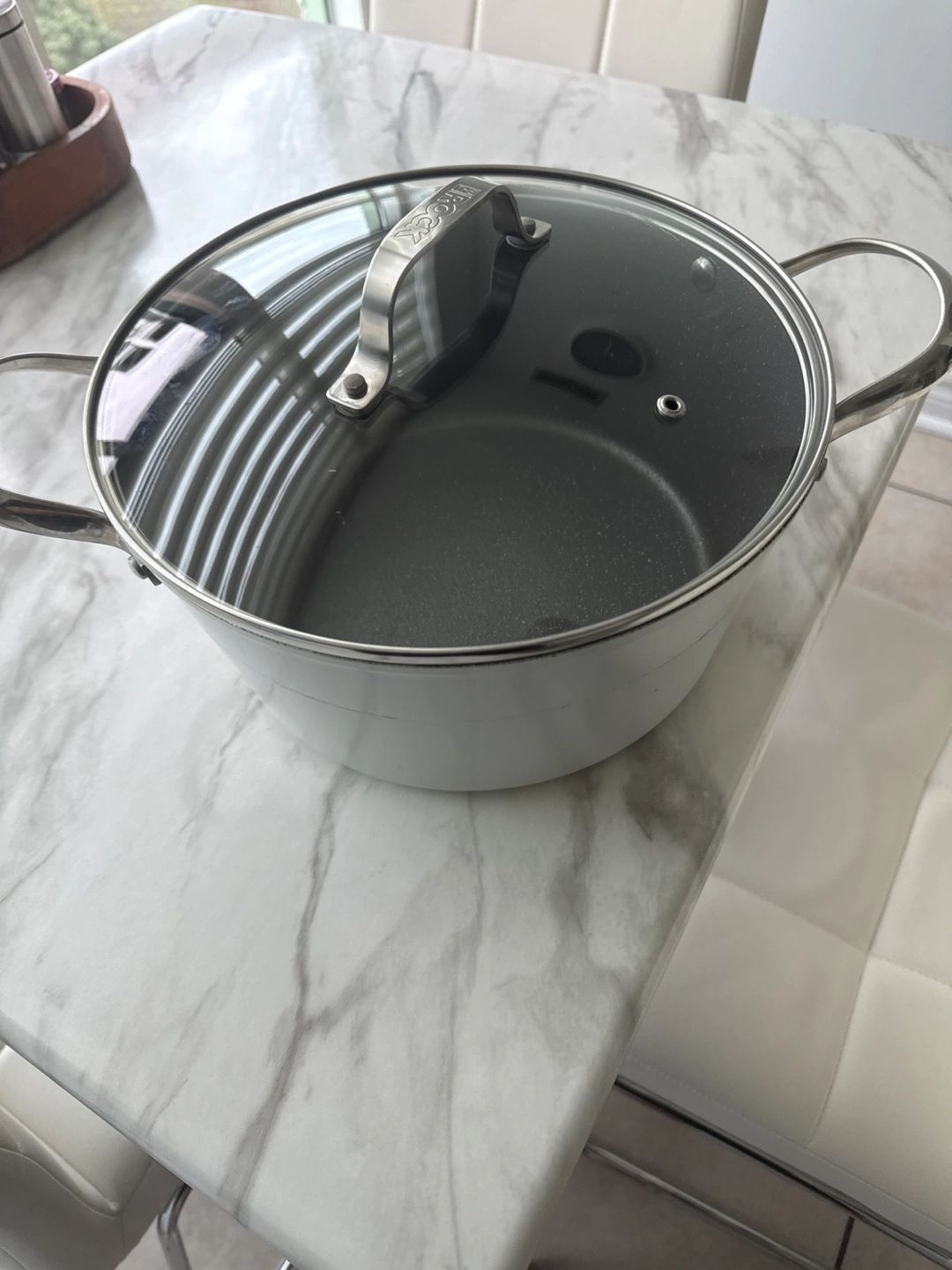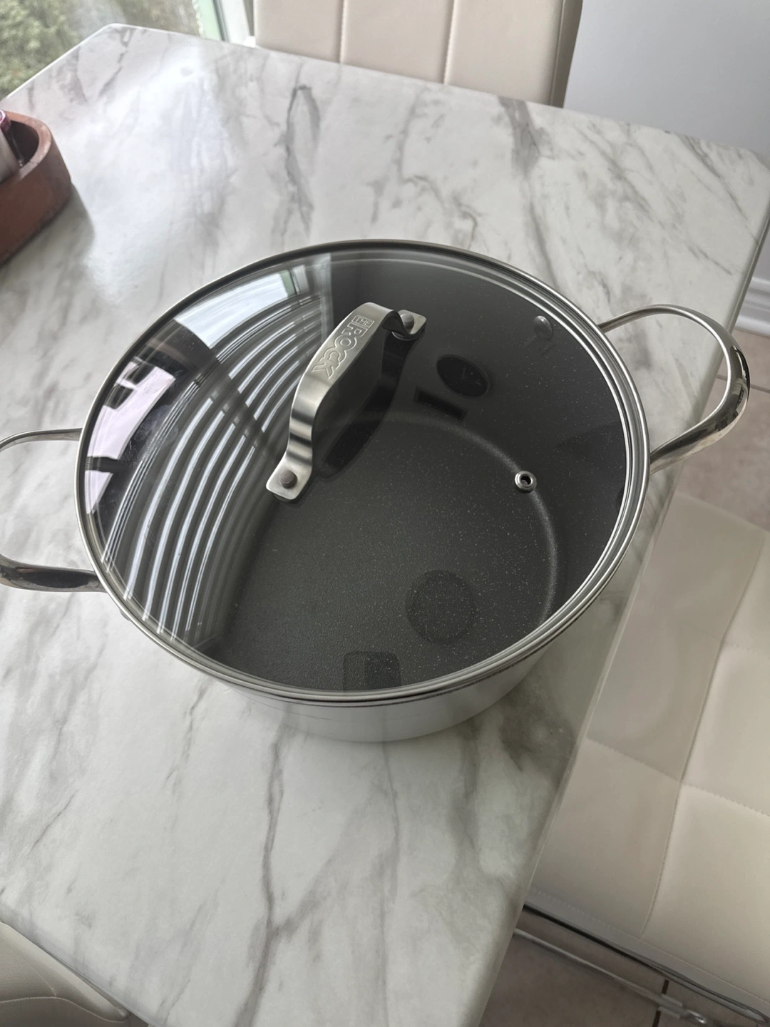 BergHOFF Leo stock pot. Features a glass lid and stainless steel handles. Excellent for soups and stews.