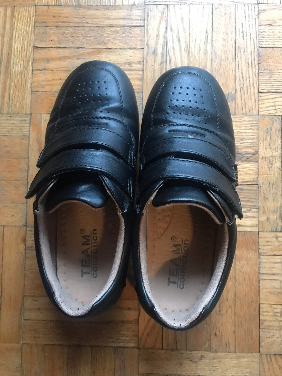 Black leather-like children's shoes. Velcro closures. Good for school or everyday wear. Size 6