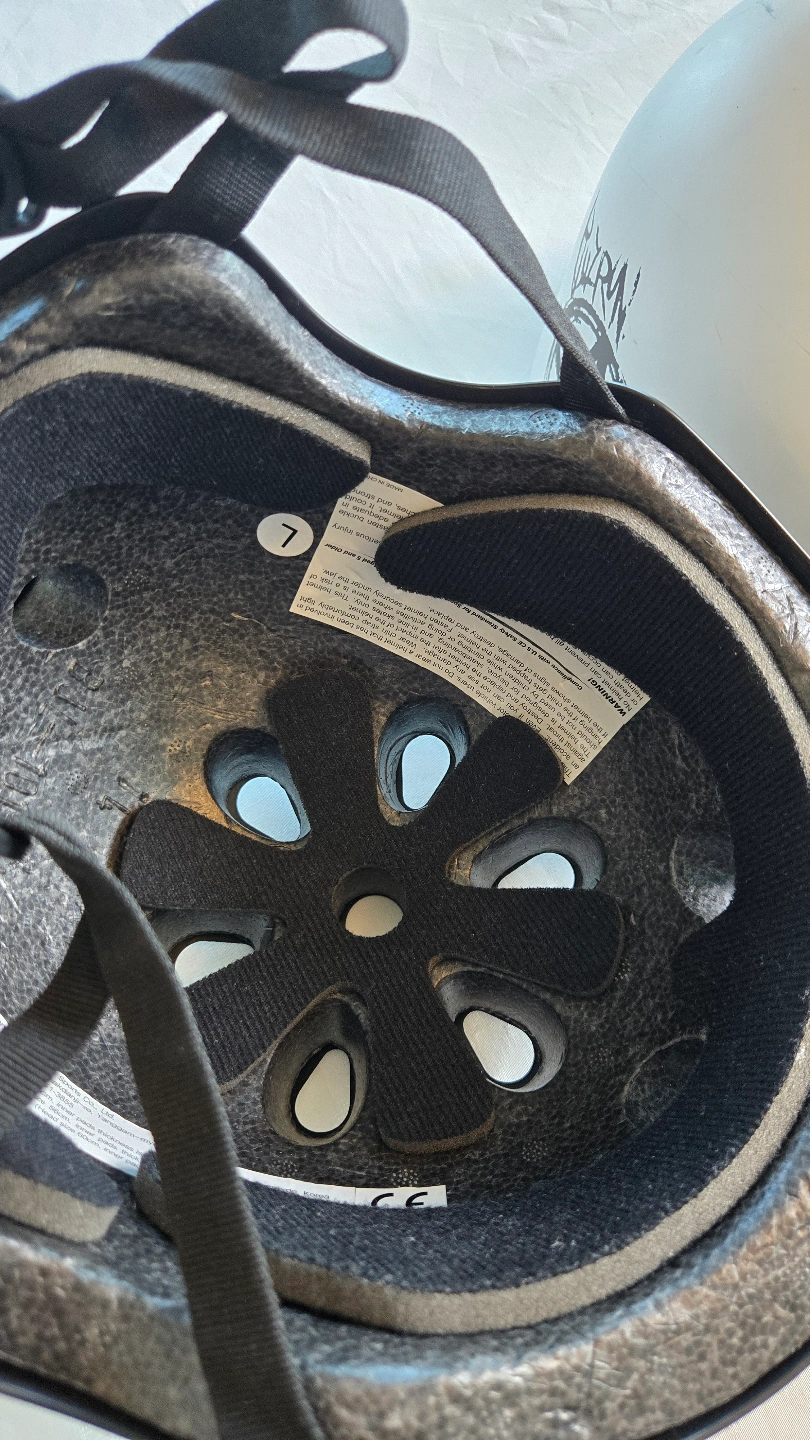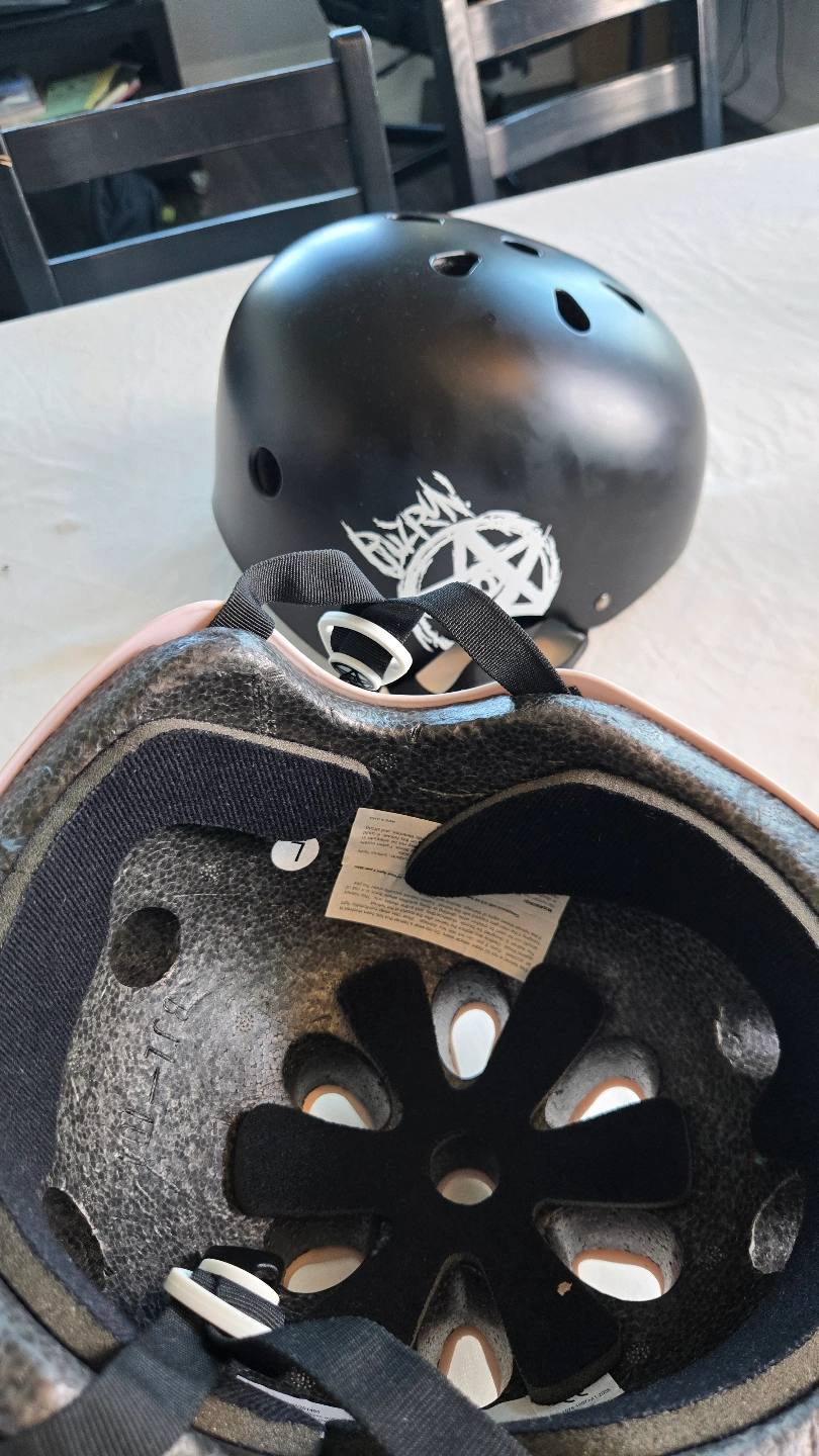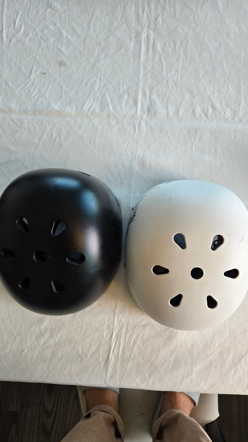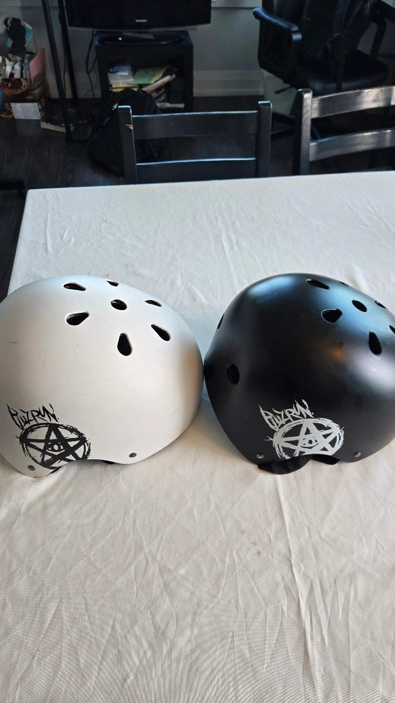 Two Buzzrun skate helmets. One black, one white. Size 7. Good condition. Features adjustable straps and ventilation holes.