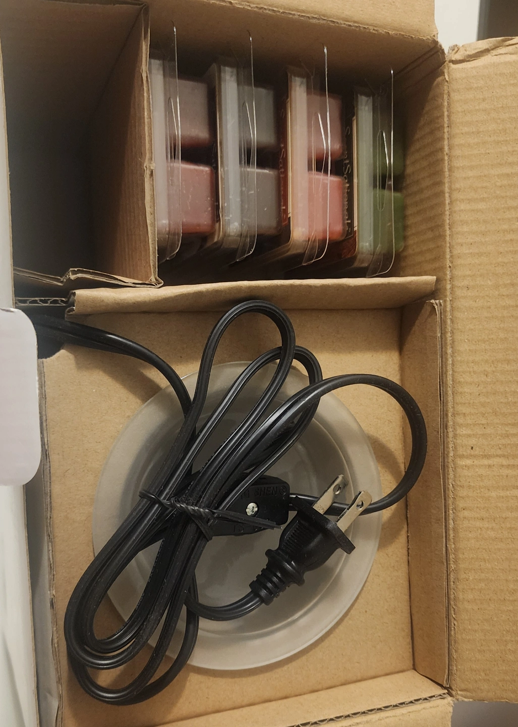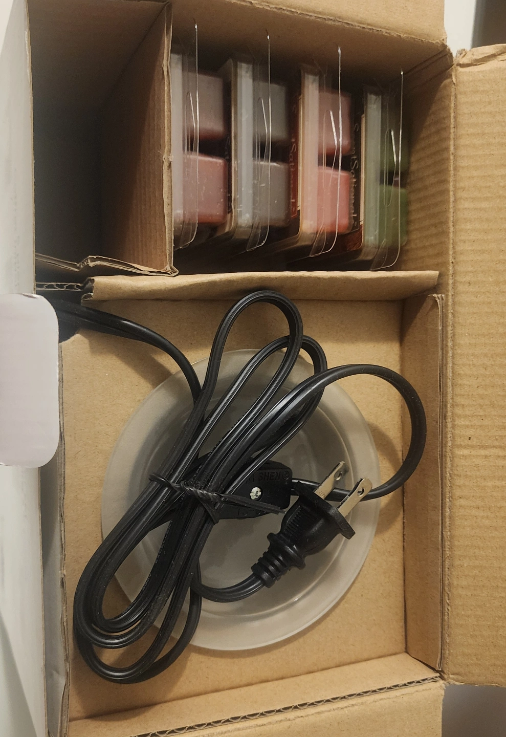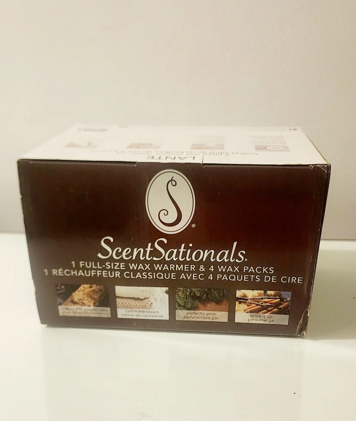 New in box. Includes one full-size wax warmer and four wax packs. Metal warmer with a geometric design. Perfect for adding fragrance to your home.