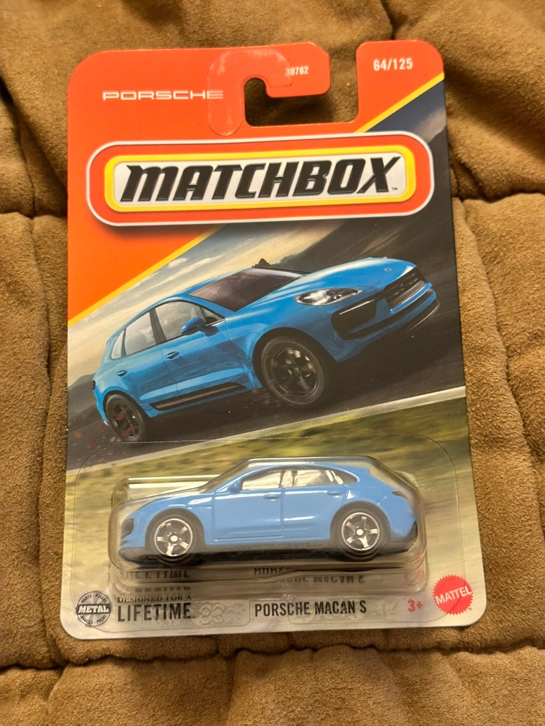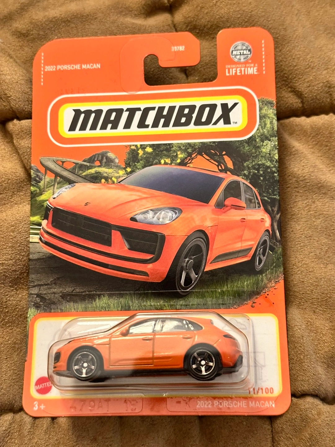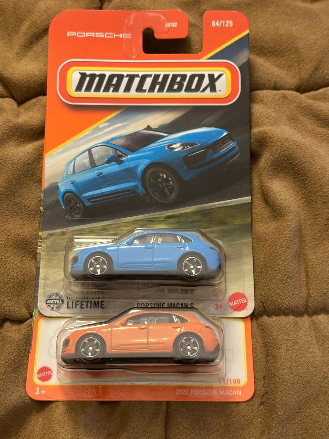 Three collectible Matchbox die-cast cars. Includes a blue and two orange Porsche Macans. New in package. Part of a 125-piece set.
