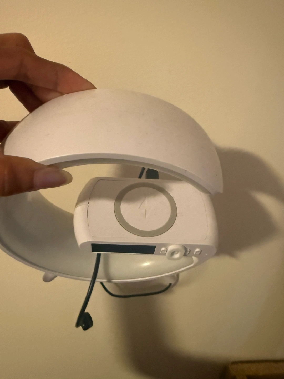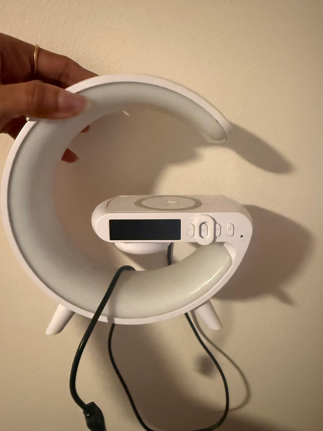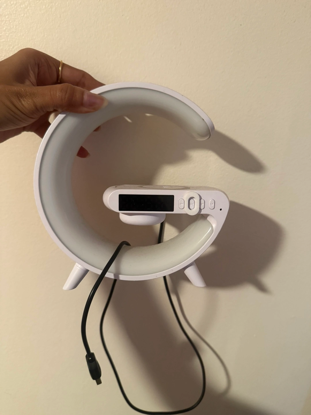 White smart light sound machine. Features sunrise simulation wake-up light, dimmable brightness, alarm clock, sound machine, and 15W fast wireless charging. App control. 10 million 256 lighting modes. Natural sleep aid.