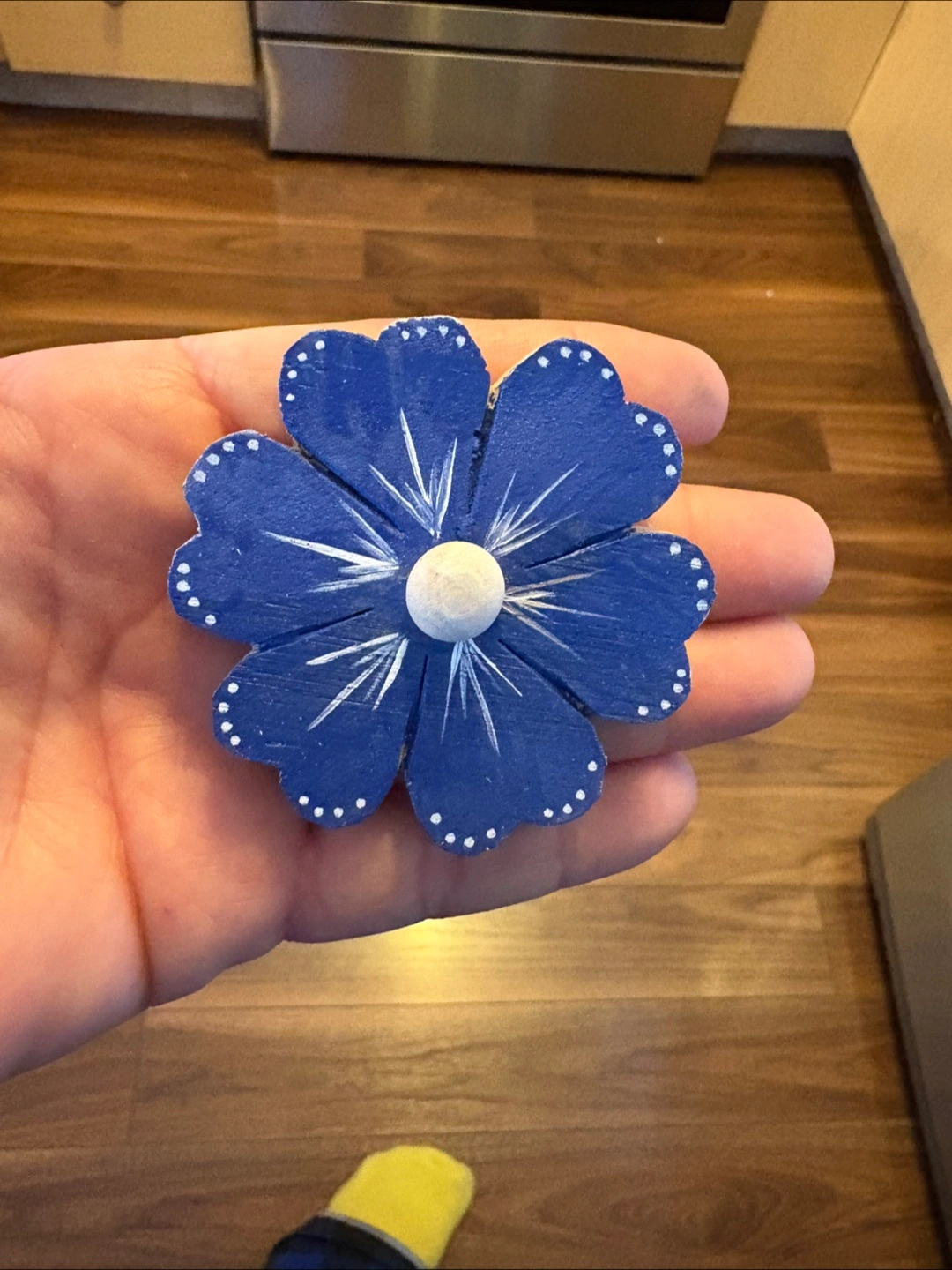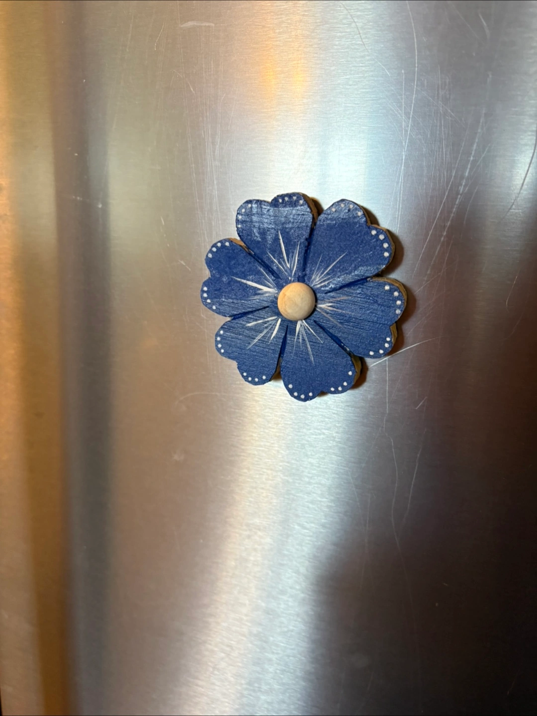 Adorable blue flower fridge magnet. Hand-painted wooden design. Small and charming. Perfect for adding a touch of colour to your kitchen.