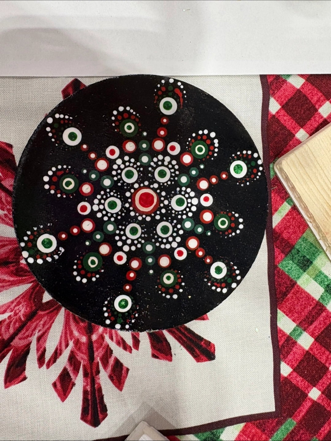 Unique round decor. Features a mandala design. Painted in red, green, and white dots on a black background. Looks great as a decorative piece.