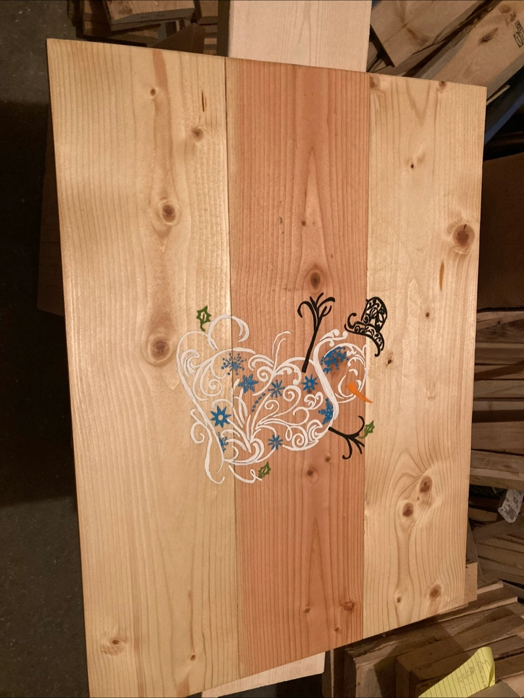 Unique Christmas decoration. Features a whimsical snowman design. Painted on reclaimed wood. Perfect for holiday decor.