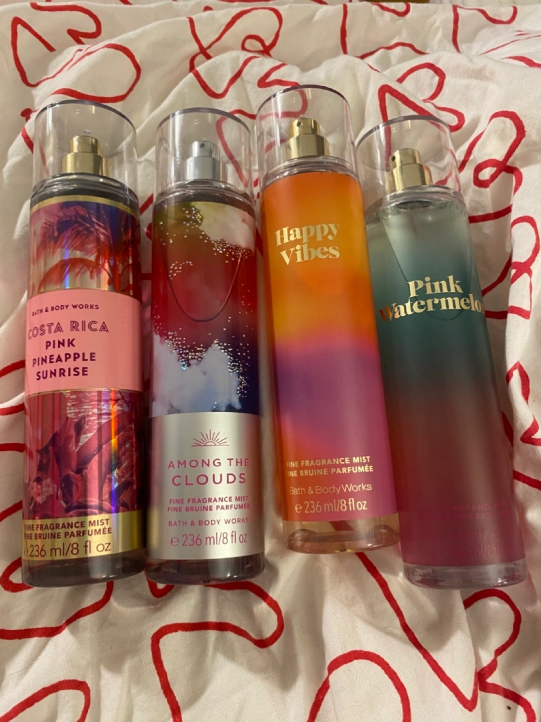 Four Bath & Body Works fine fragrance mists. Scents include Costa Rica Pink Pineapple Sunrise, Among the Clouds, Happy Vibes, and Pink Watermelon. Each bottle is 236ml/8 fl oz. $20 for all or $5 each