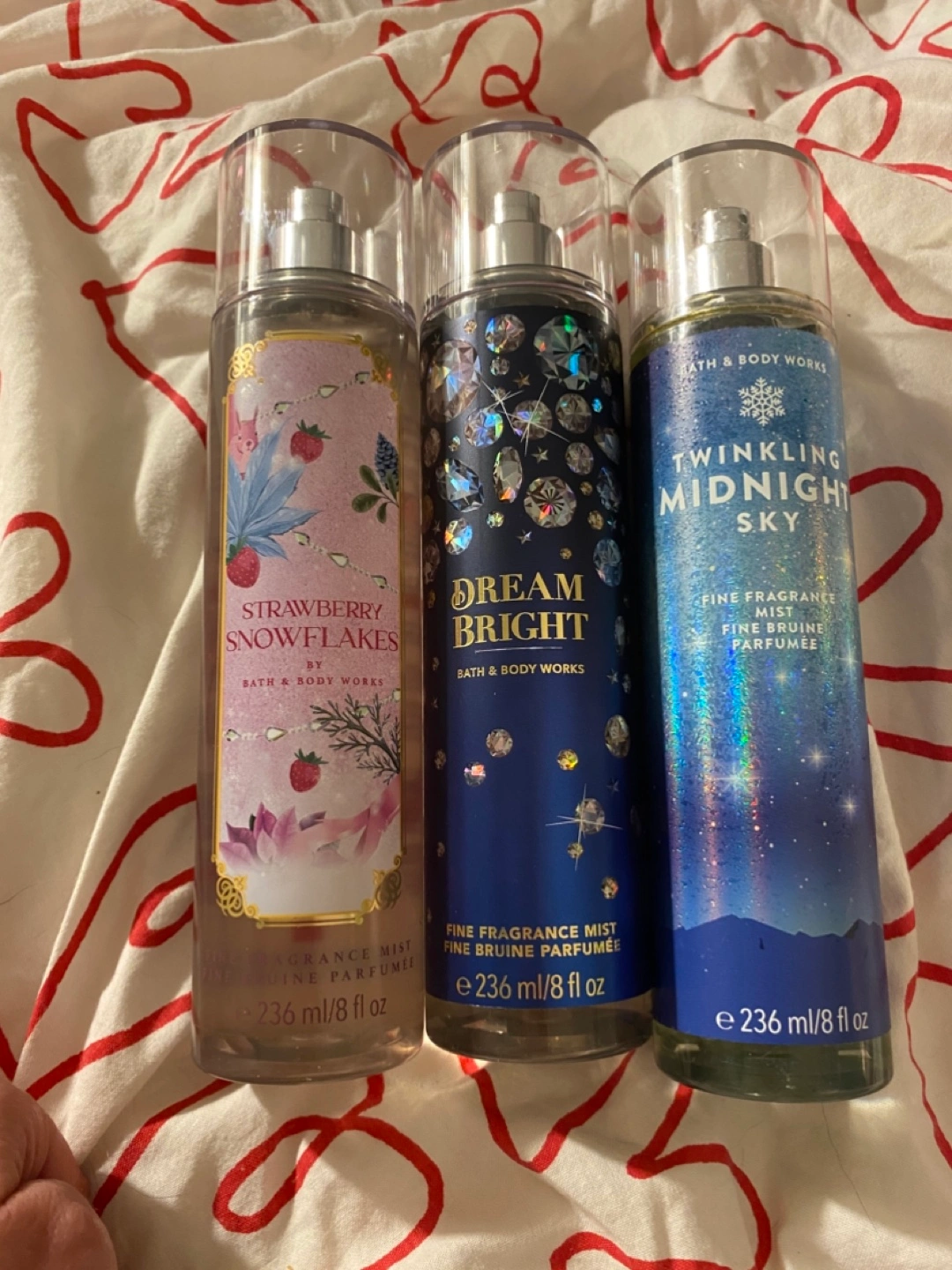 Three Bath & Body Works Fine Fragrance Mists. Strawberry Snowflakes, Dream Bright, and Twinkling Midnight Sky. Each bottle is 236 ml/8 fl oz. $15 for all or $5 each