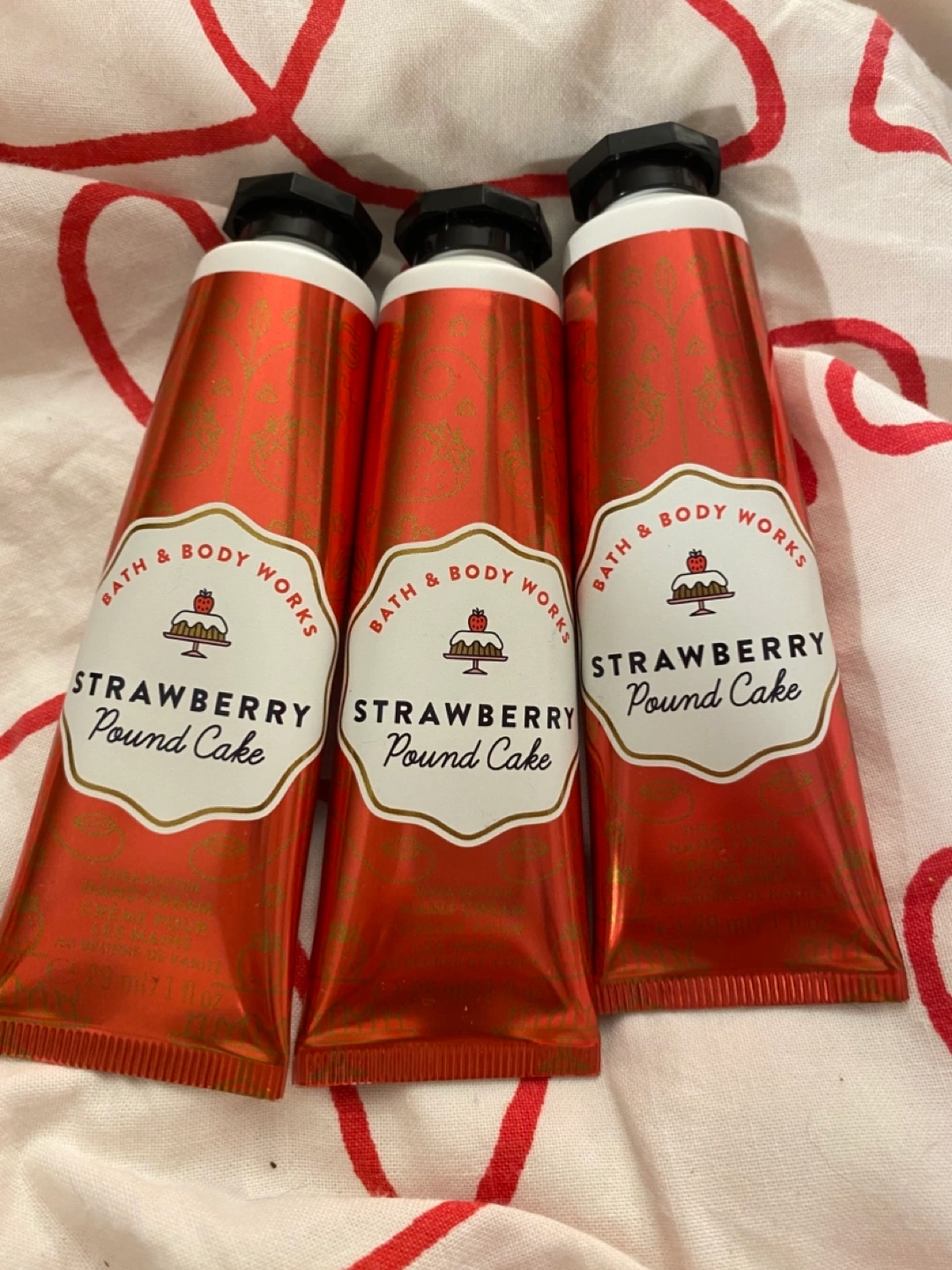 Three tubes of Bath & Body Works Strawberry Pound Cake hand cream. Red tubes with gold accents. Scented hand cream. $3 each or take ‘em all for $7