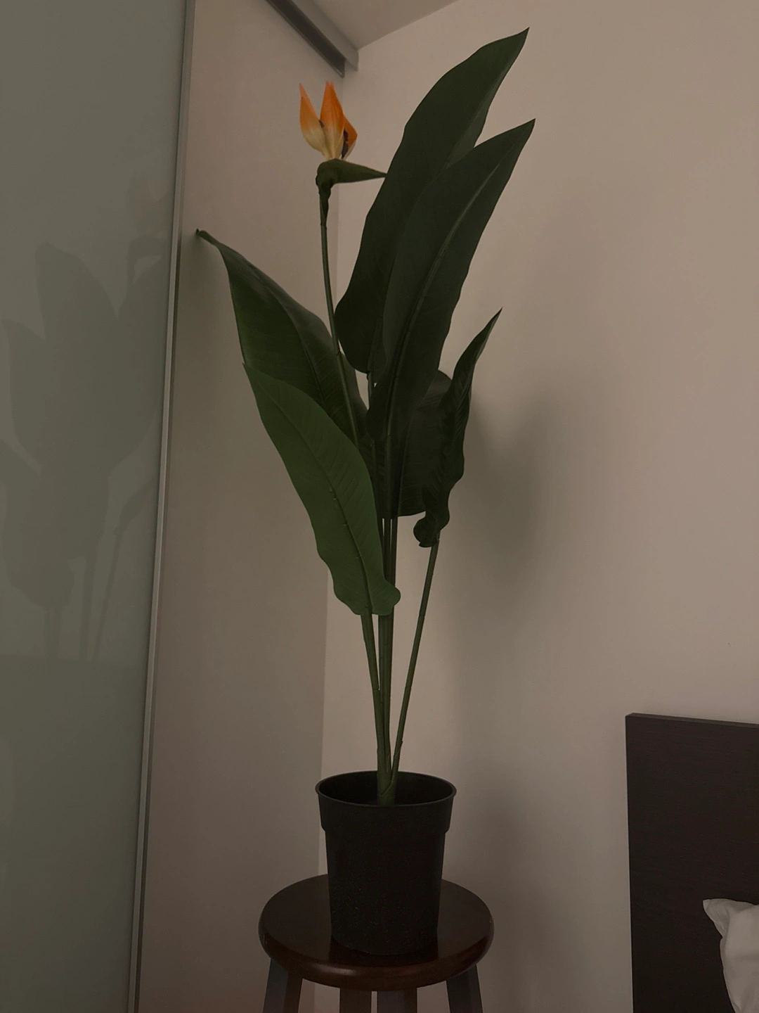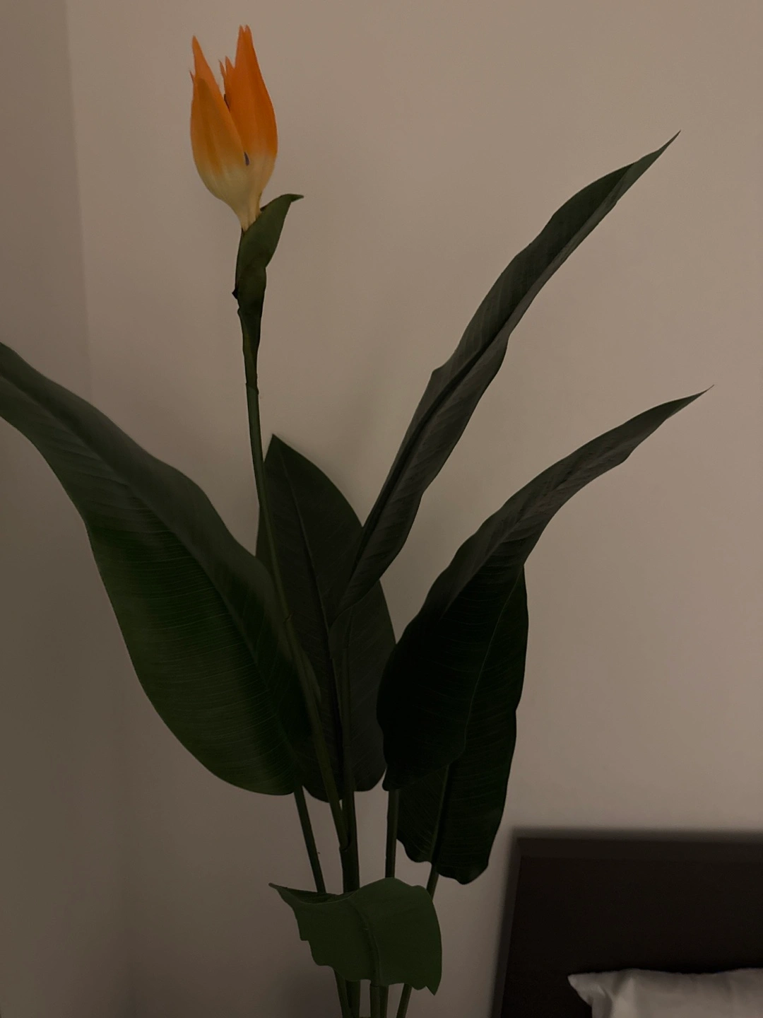 Just got it, did not fit with the rest of the space Artificial Bird of Paradise plant. Beautiful orange flower. Planted in a simple black plastic pot. Great for home décor.