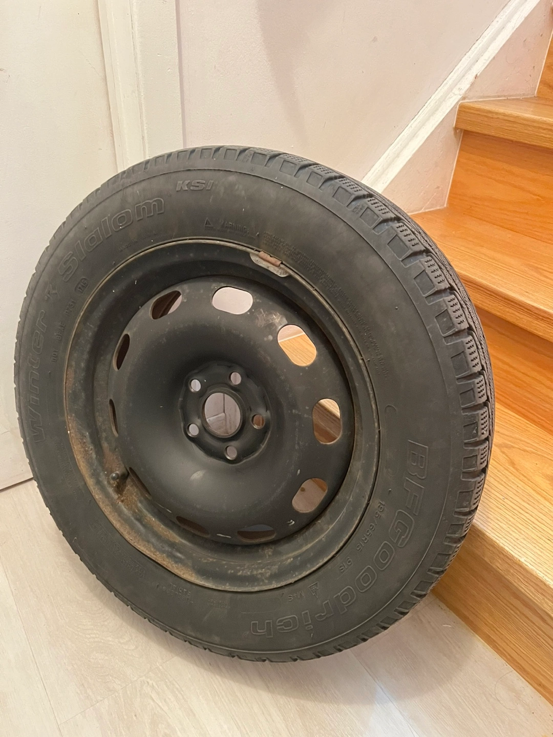 Used Goodyear Ultra Grip winter tire mounted on a steel rim. Size 195/65R15. Shows wear. Good for a spare.