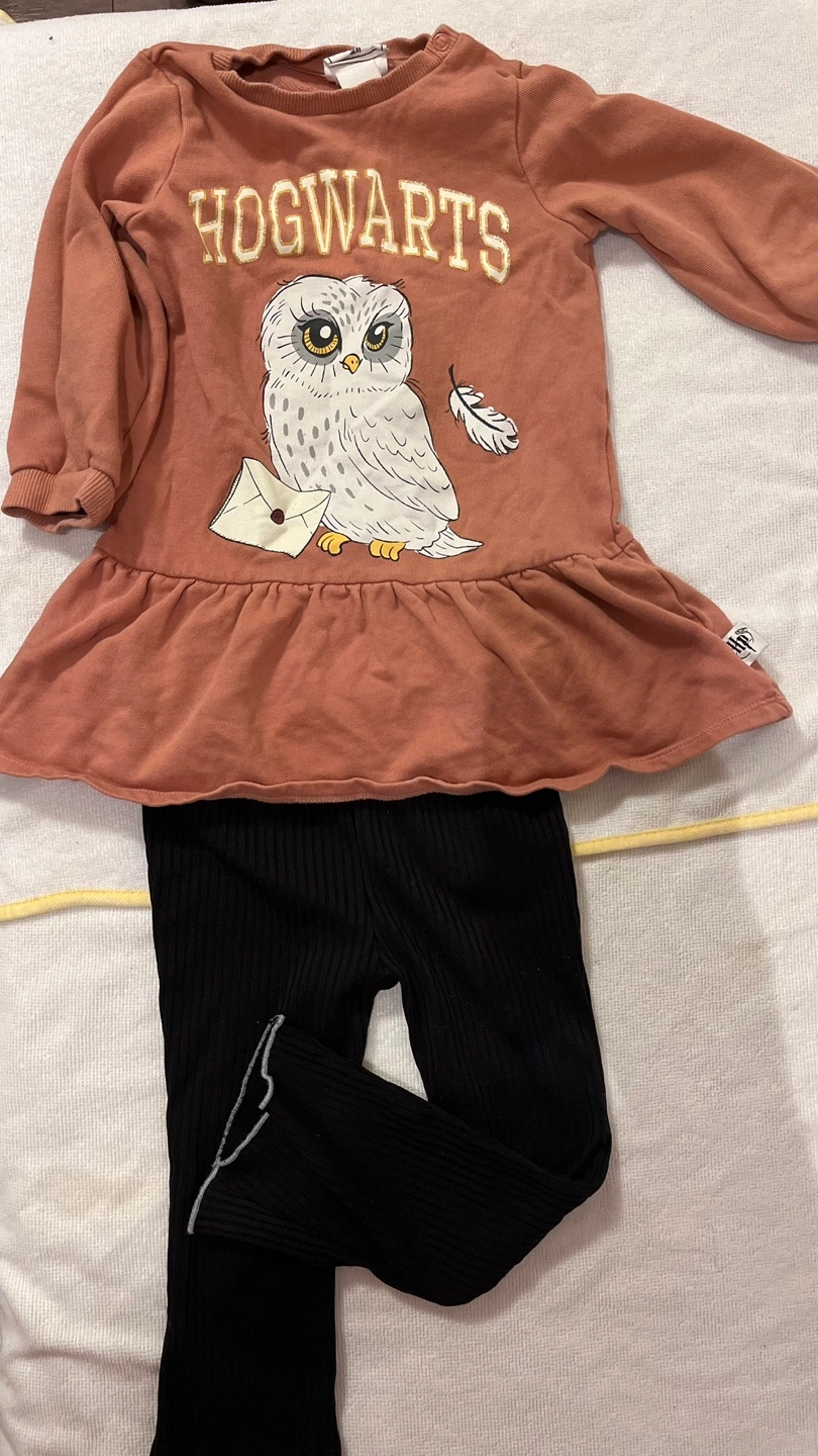 Cute two-piece outfit featuring a mauve long-sleeve top with a Hogwarts owl design and black ribbed leggings. Perfect for your little witch or wizard. Leggings feature subtle grey detailing.
