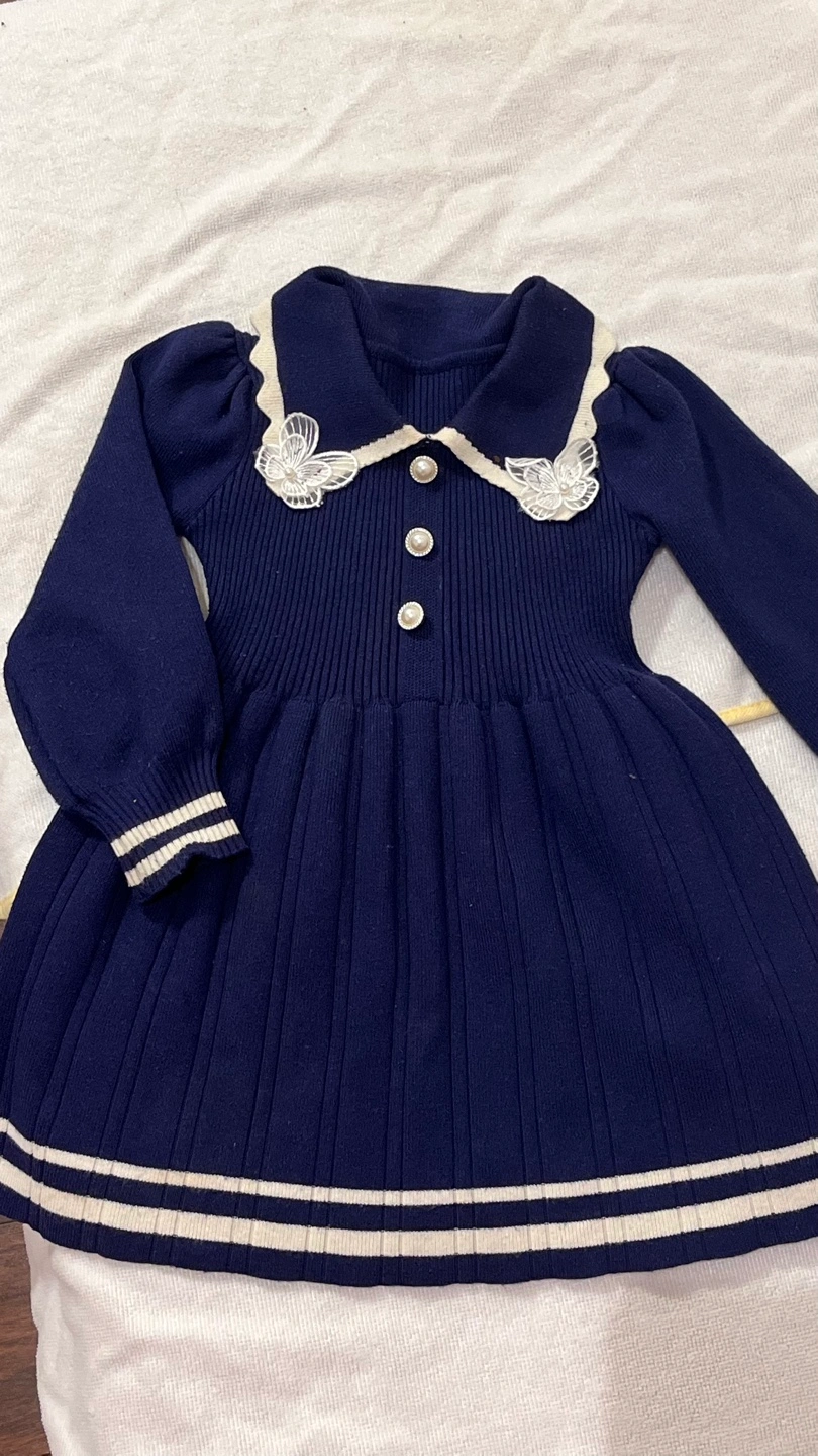 Adorable dark blue ribbed knit dress. Features a Peter Pan collar with embroidered floral accents and pearl buttons. Long sleeves with white stripes at the cuffs and hem. Pleated skirt. Perfect for special occasions.