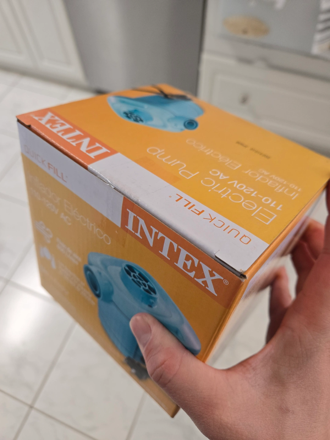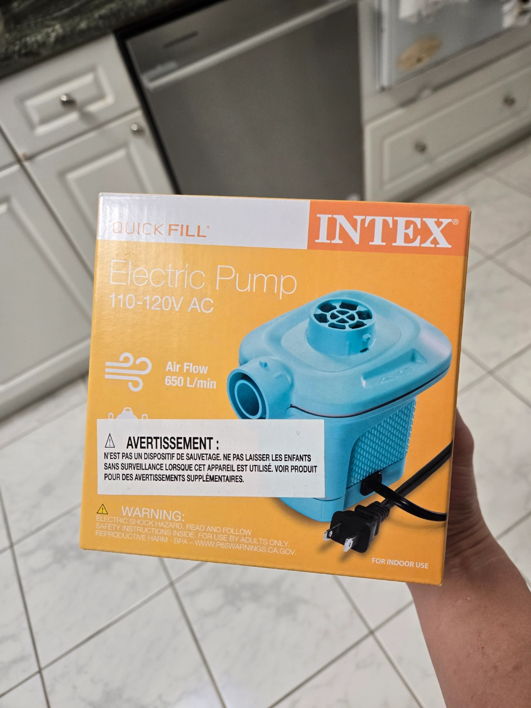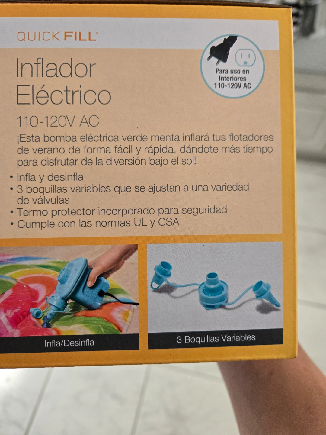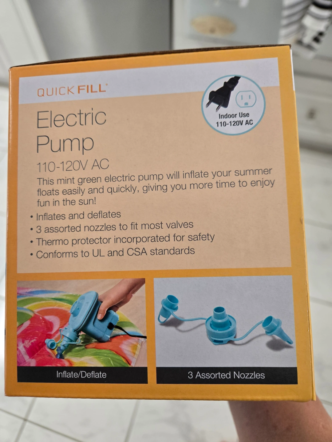 Inflates and deflates. Three assorted nozzles fit most valves. Thermo protector incorporated for safety. Conforms to UL and CSA standards. Indoor use only. 110-120V AC. 650 L/min air flow. price firm pick up near 22nd skytrain new west
