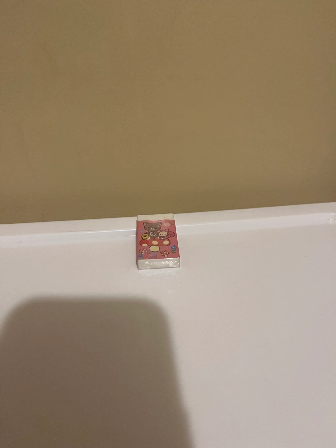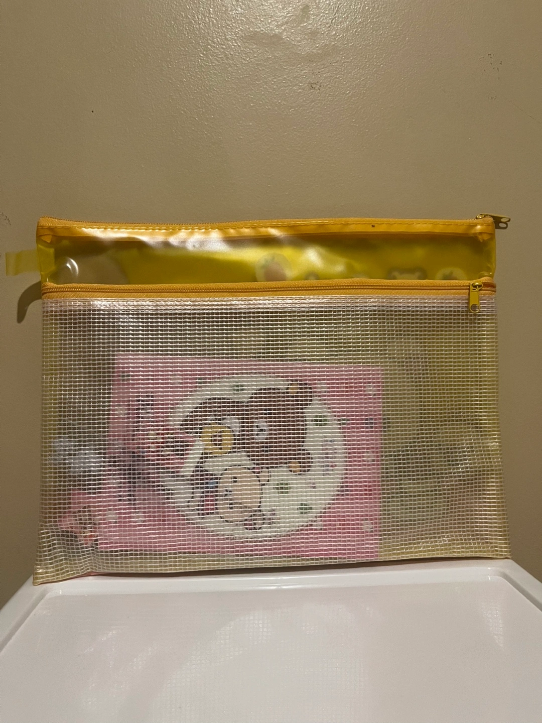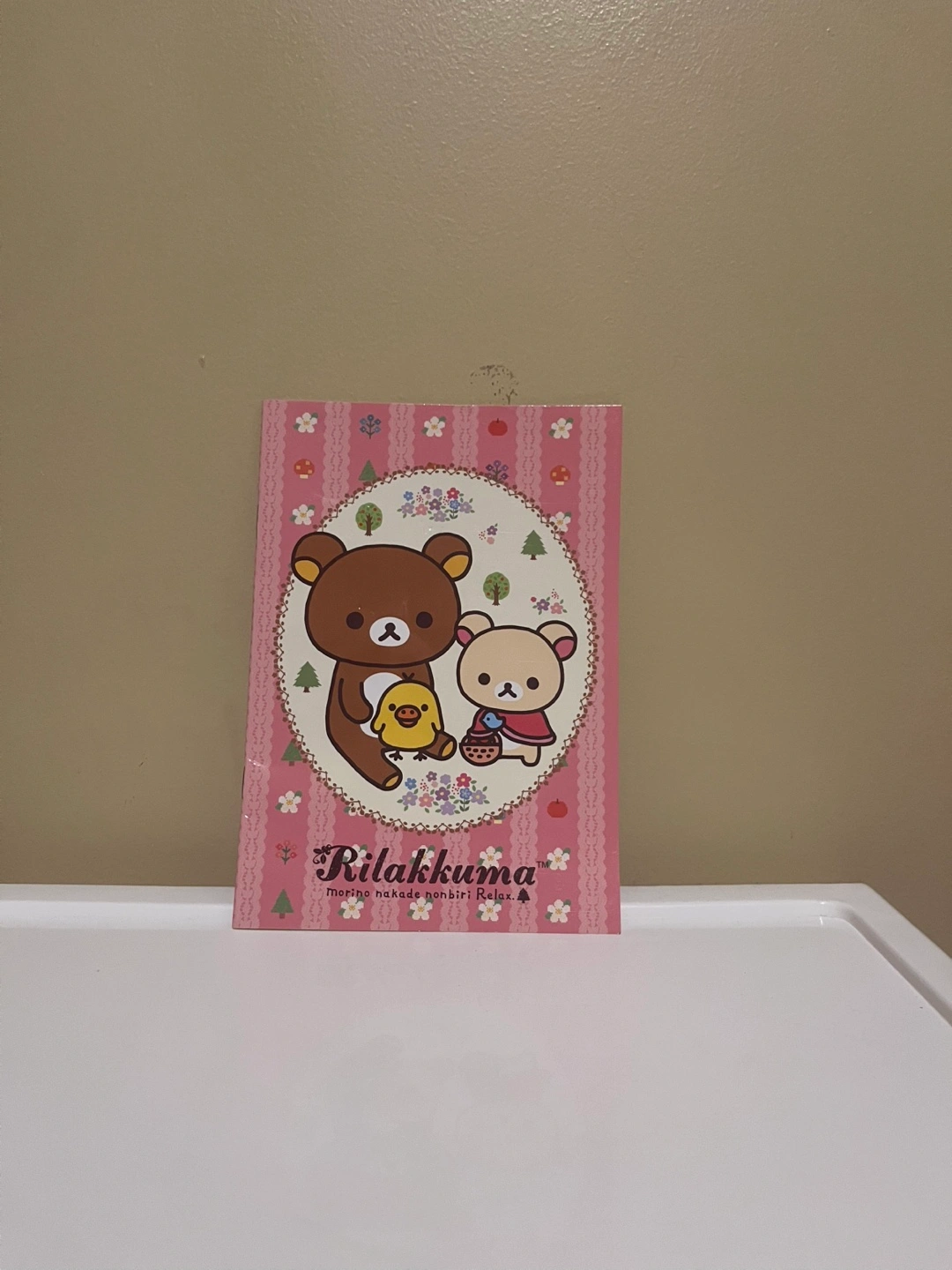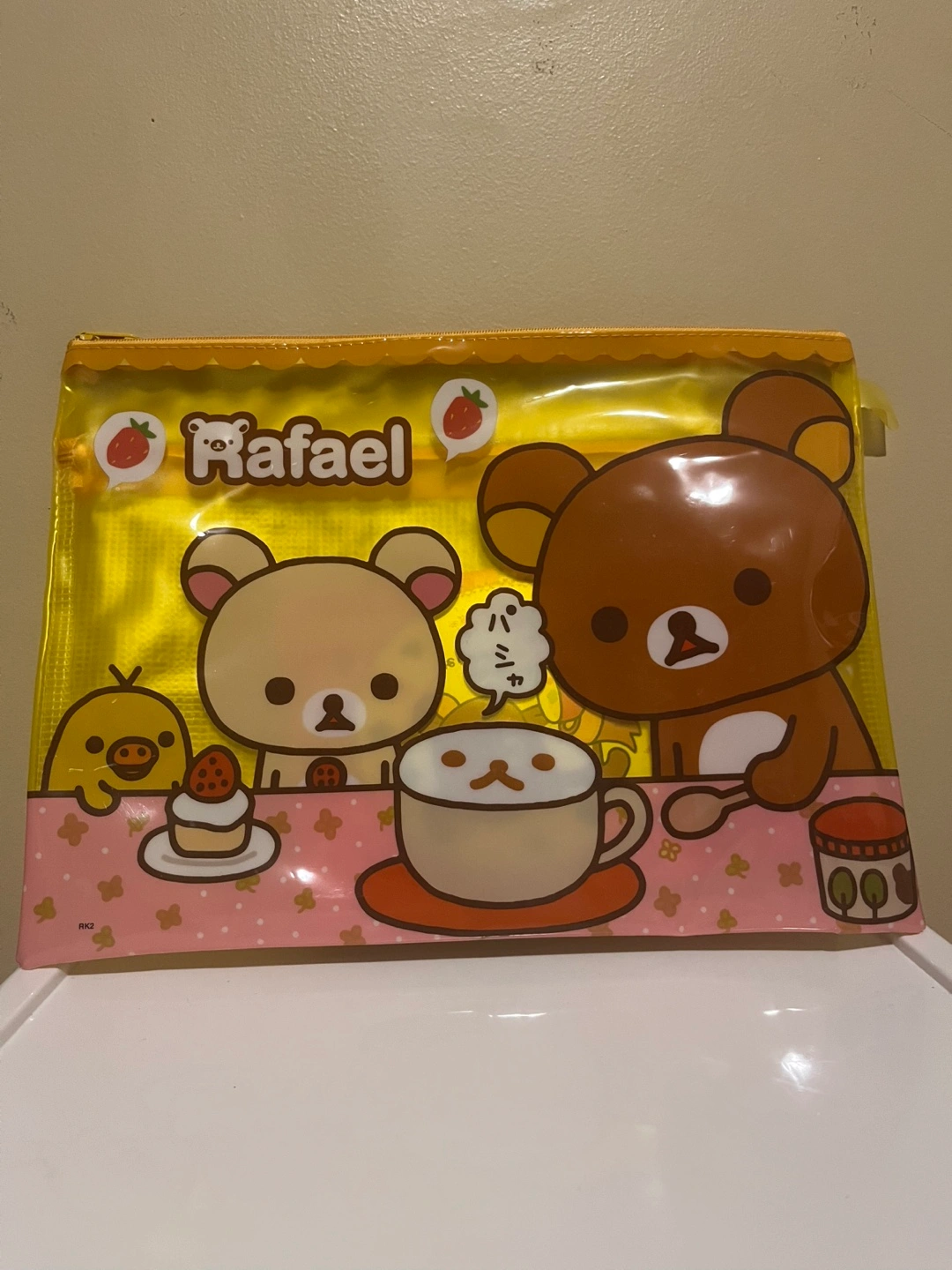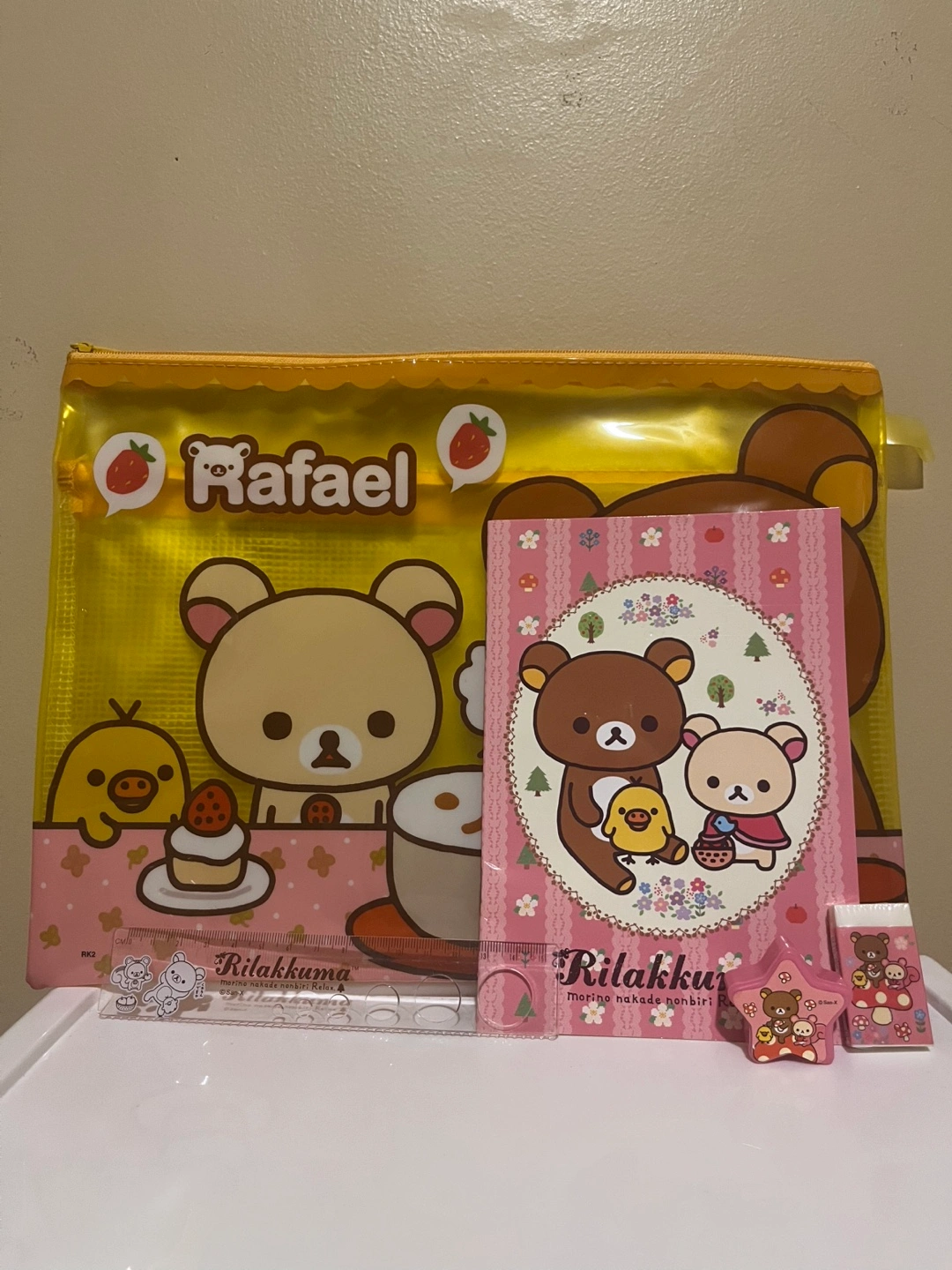 Adorable Rilakkuma stationery set. Includes a yellow clear zipper pouch, pink notebook, ruler, and eraser set. Perfect for students or fans.