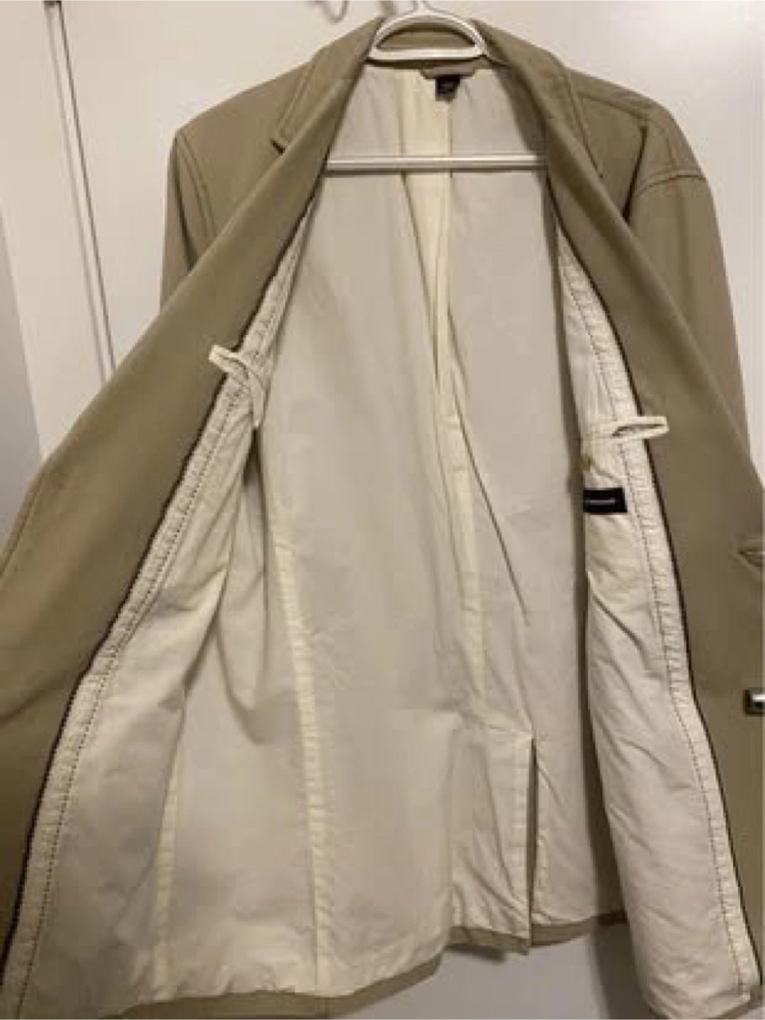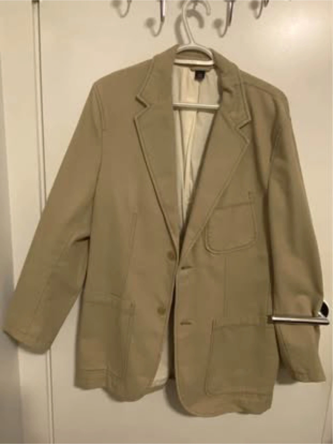 Men's beige sport coat. Features elbow patches. Two patch pockets. Three button closure. Lined. Good condition.