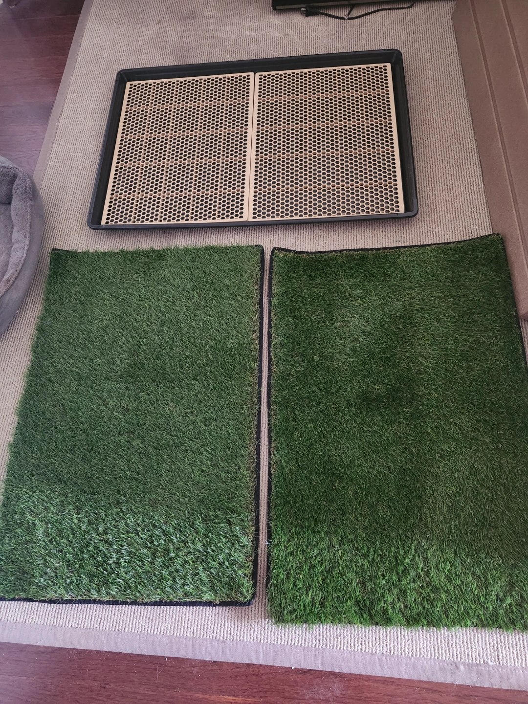 Two artificial grass mats and two plastic trays. Perfect for potty training. Easy to clean. X large for medium to large dogs used 3 xs only $ 70.00 paid 100.00 on Amazon months ago call Sarah 647 338 7177