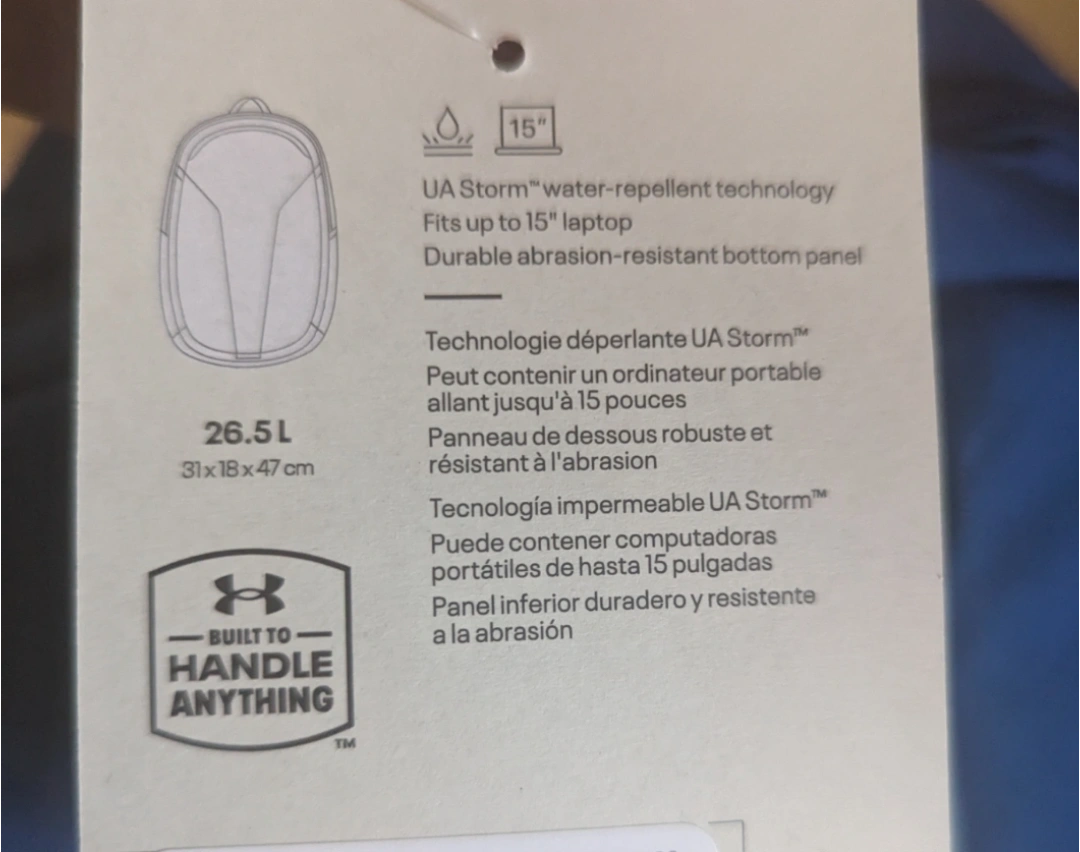 Brand New, Blue Under Armour backpack. Features UA Storm water-repellent technology. Fits up to a 15" laptop. Durable abrasion-resistant bottom panel. $30 Pick up only near Weston Rd and Black Creek