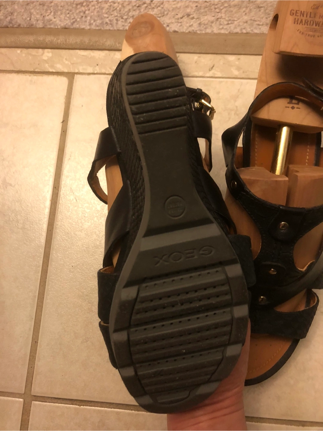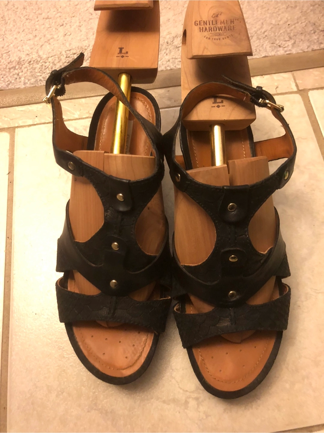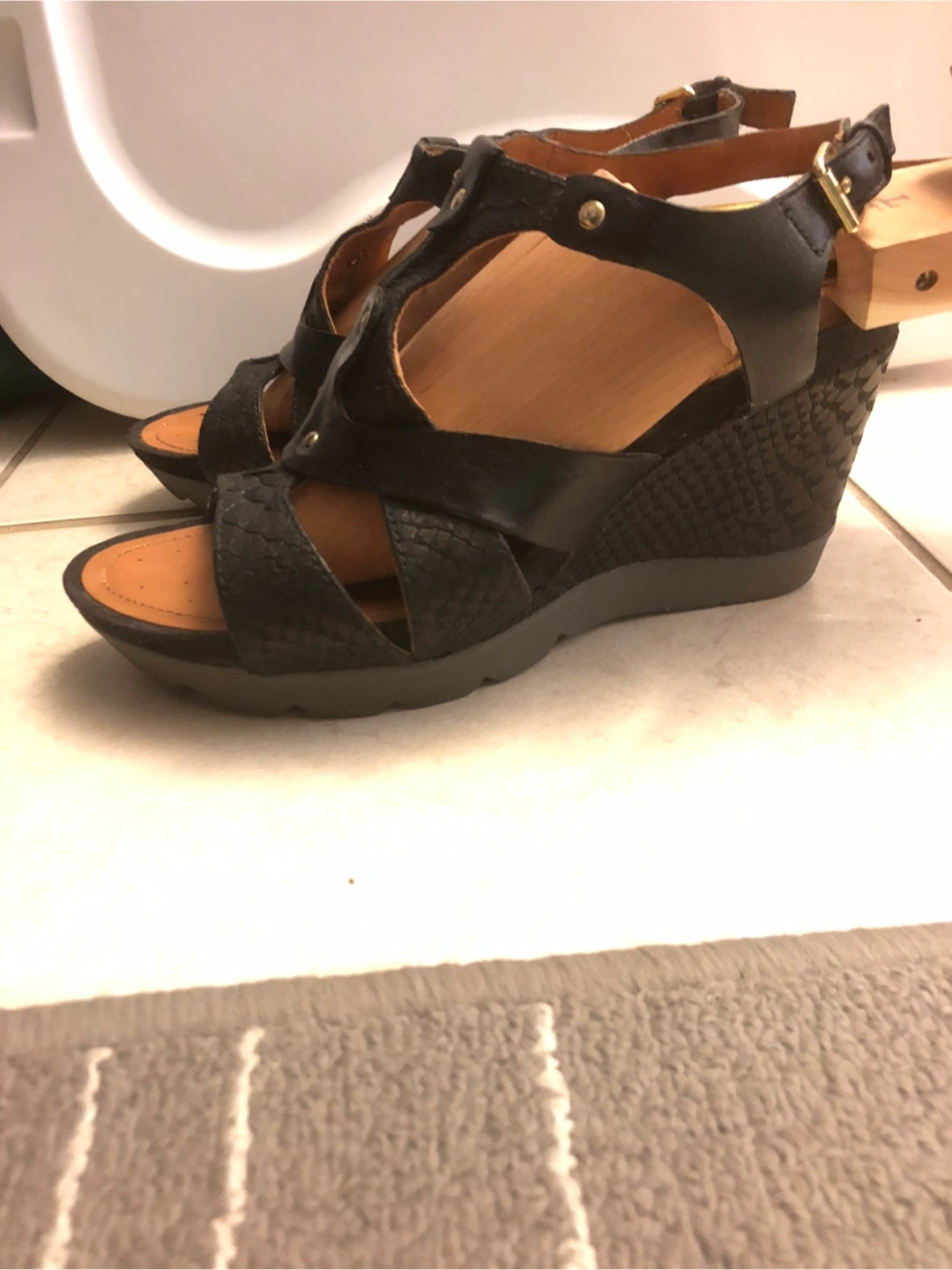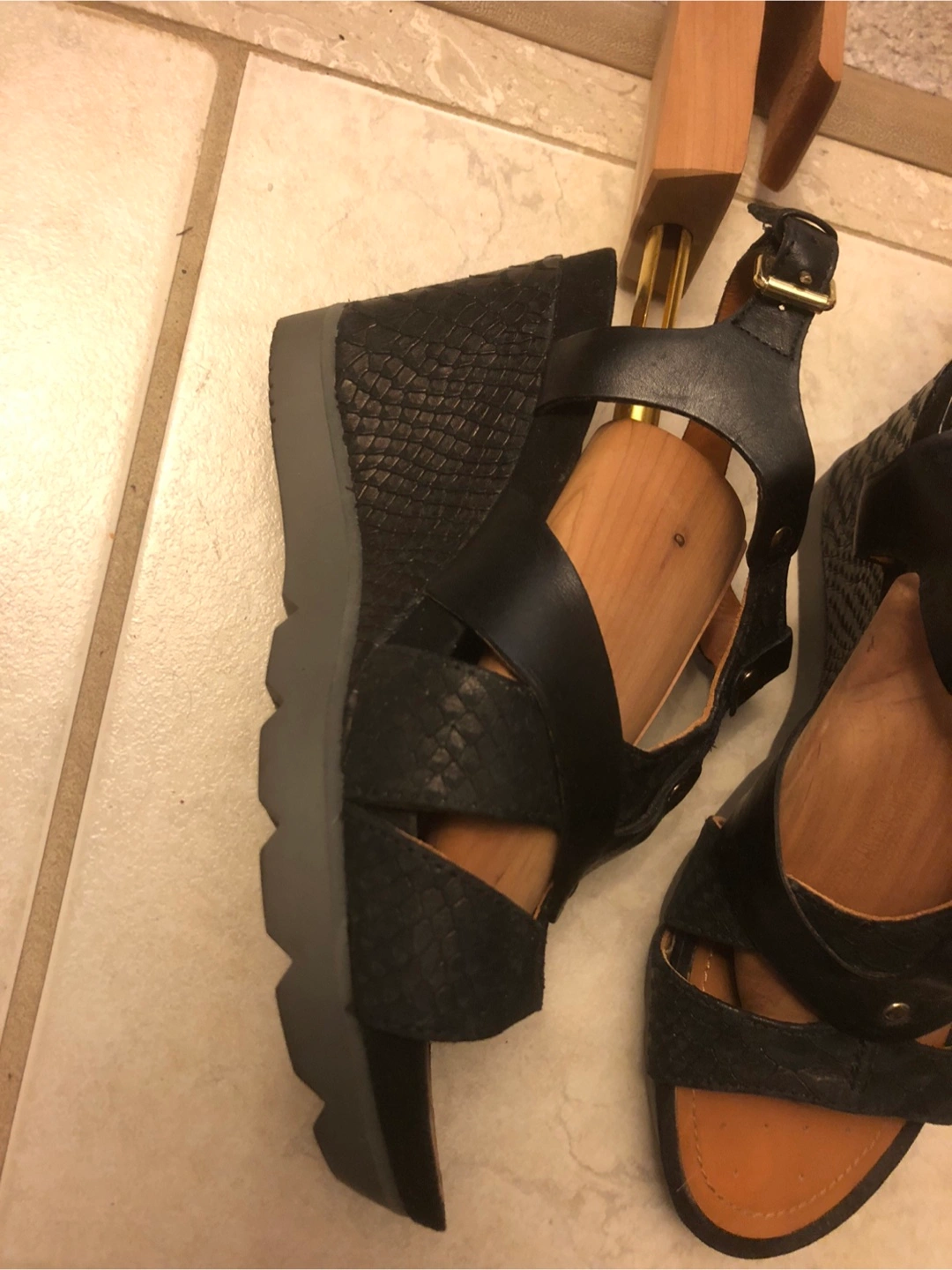 Italian patent stylish black leather wedge sandals. Features an ankle strap and intricate detailing. Snakeskin textured heels Comfortable and perfect for summer. Worn but in great condition. Size 38
