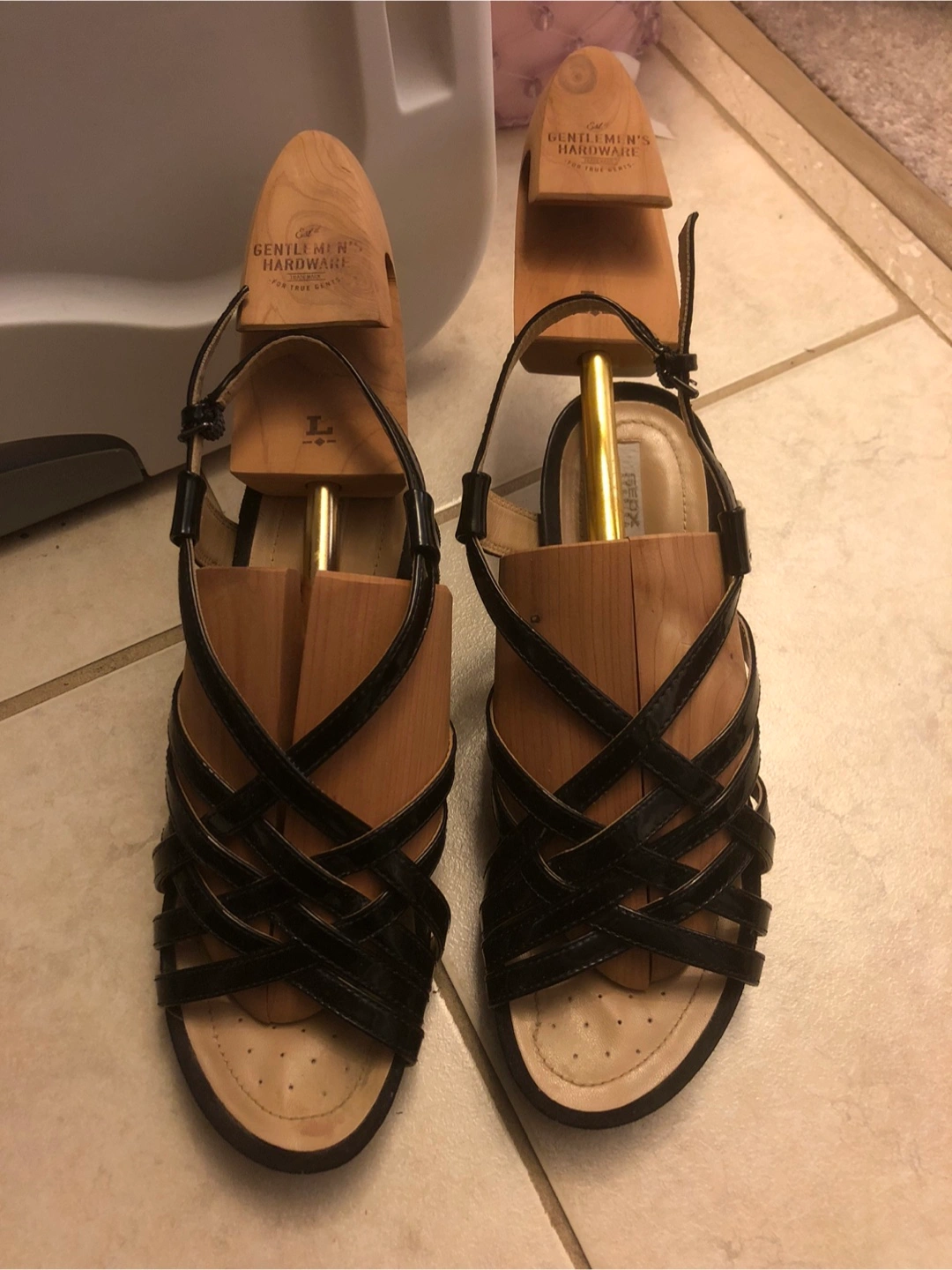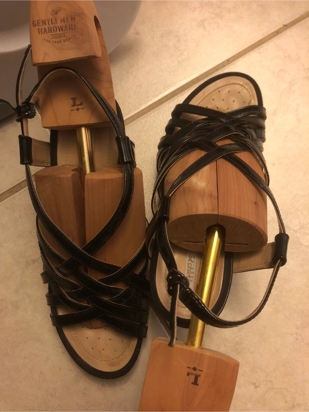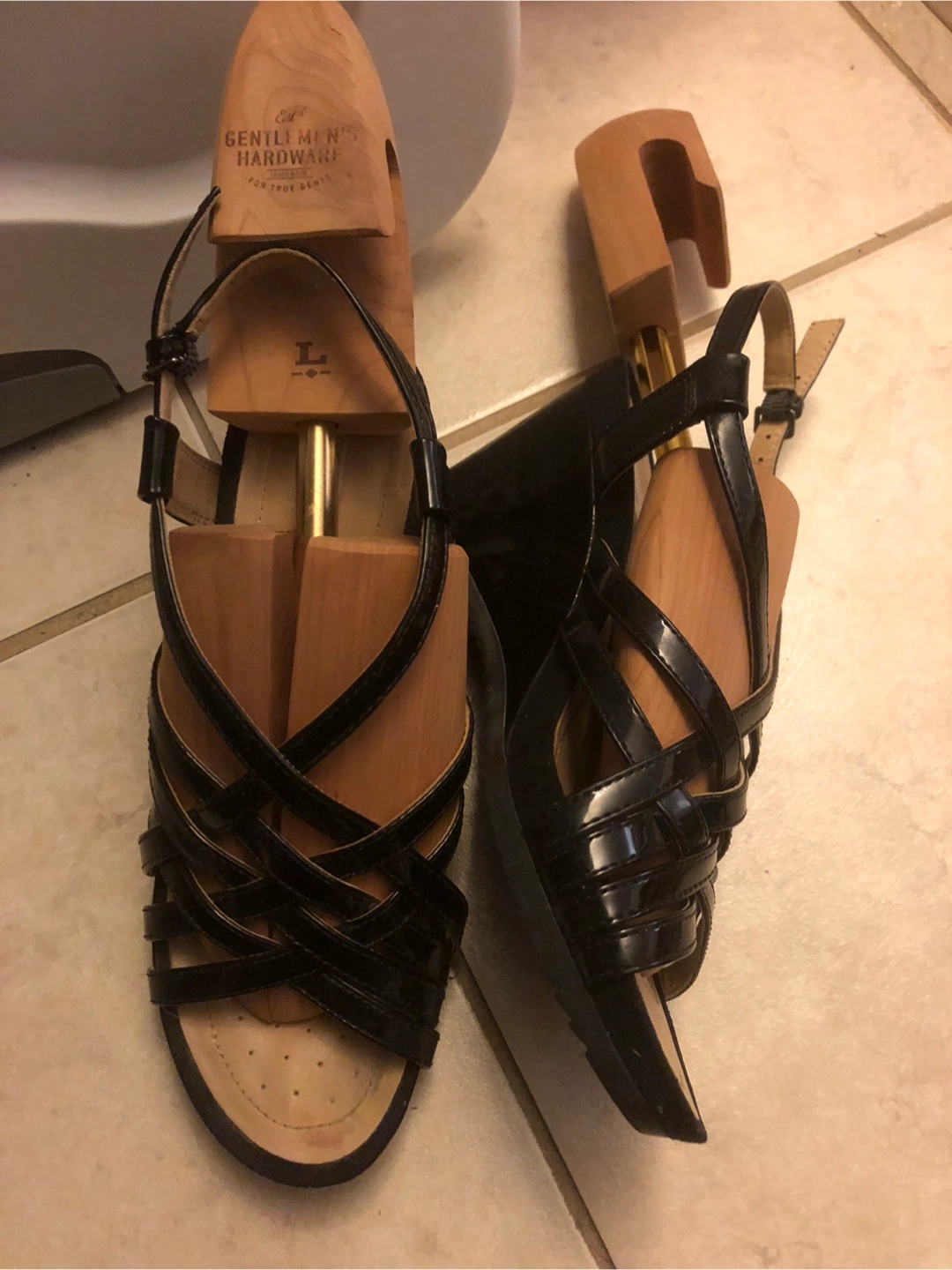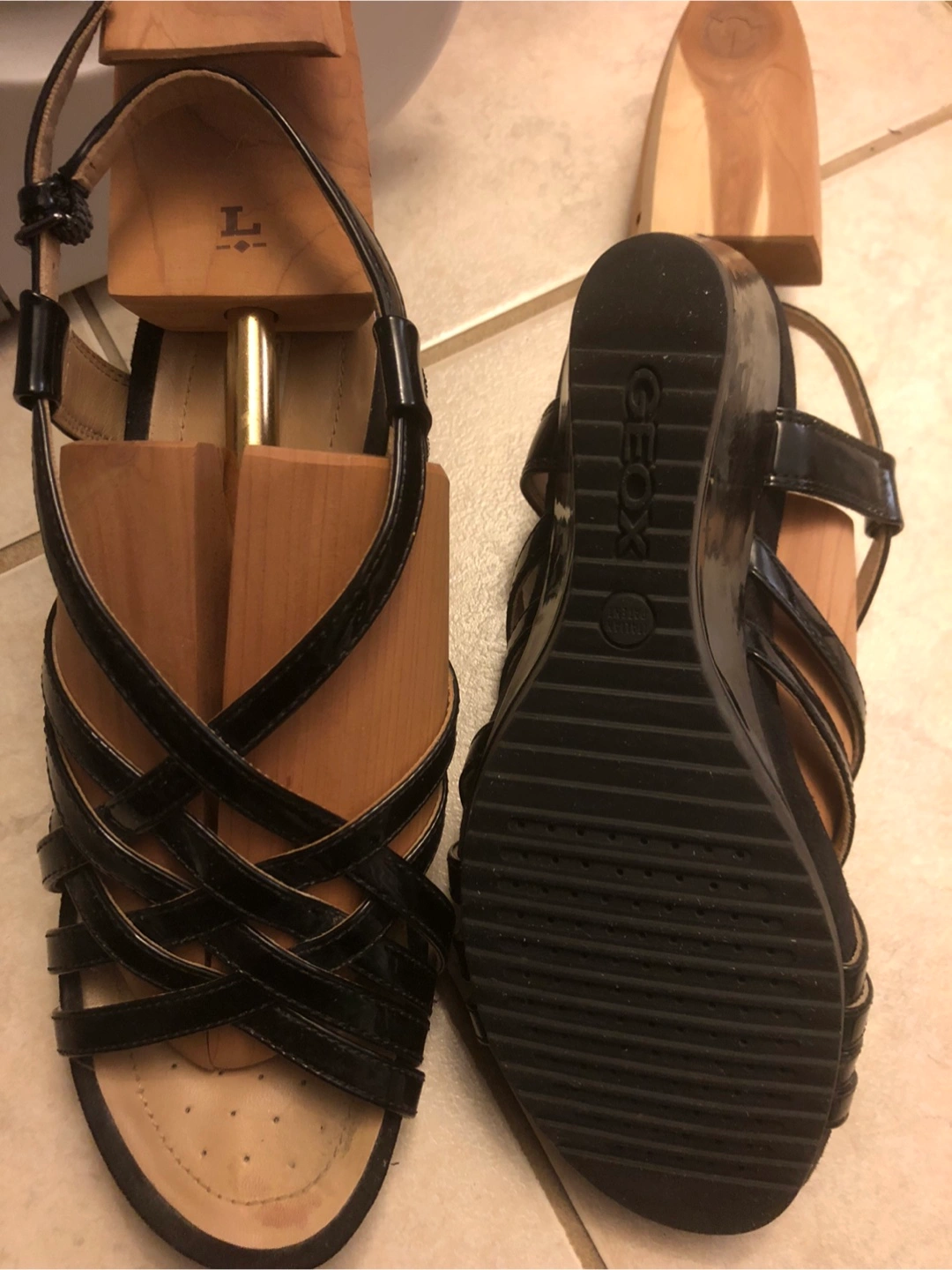 Black leather wedge sandals. Ankle strap closure. Very Good condition. Size 38