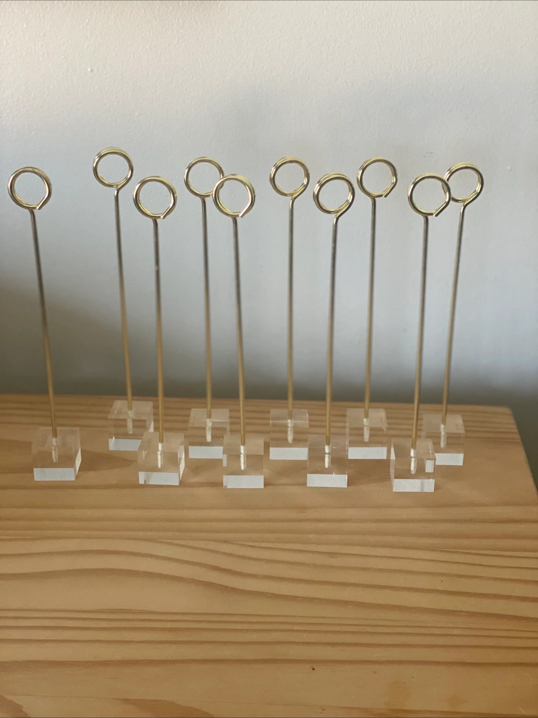 •Ten place card/sign holders •Excellent condition, clean, no breakage •Used Once •Gold metal top and clear acrylic base •Height: 8” (see pic) •Perfect for weddings, parties, showers…. •smoke-feee, pet-free environment ⬇️⬇️⬇️⬇️⬇️⬇️⬇️⬇️⬇️⬇️⬇️⬇️⬇️⬇️ Location: Jane & Lawrence