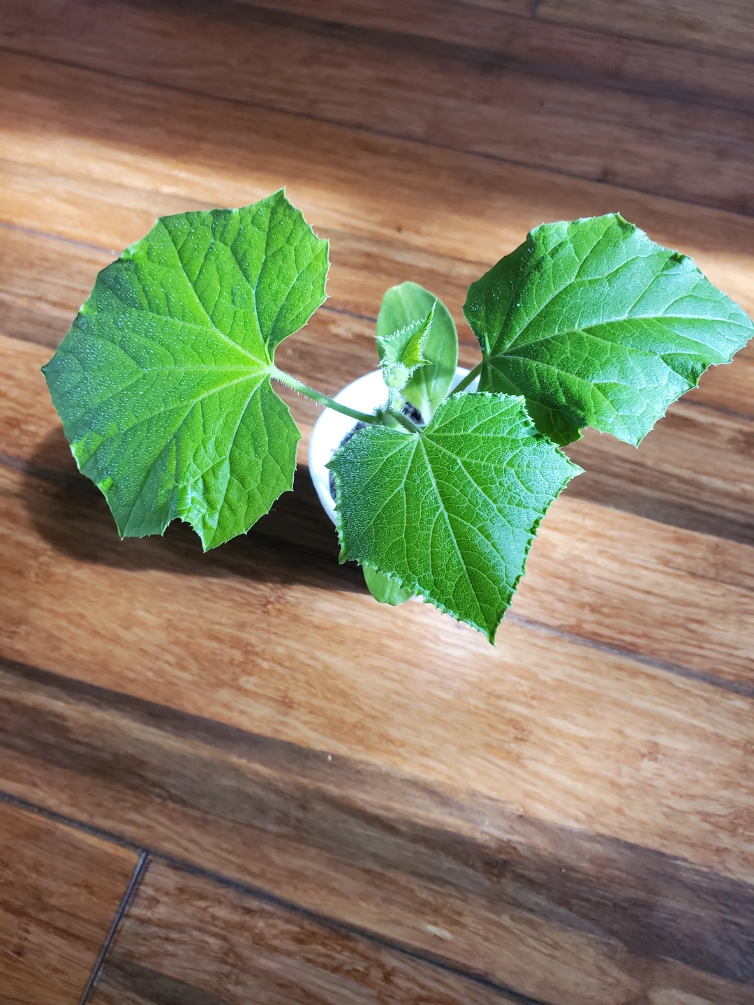 Healthy young cucumber plant, ready to transplant. Grown indoors. Small size, perfect for starting your garden.