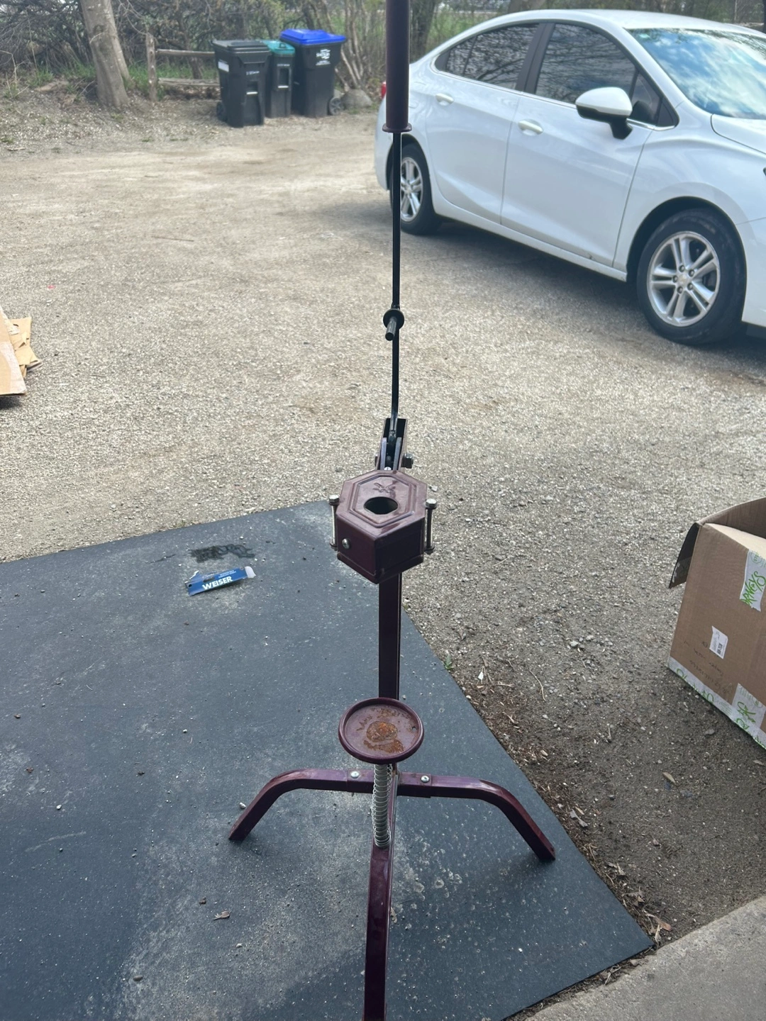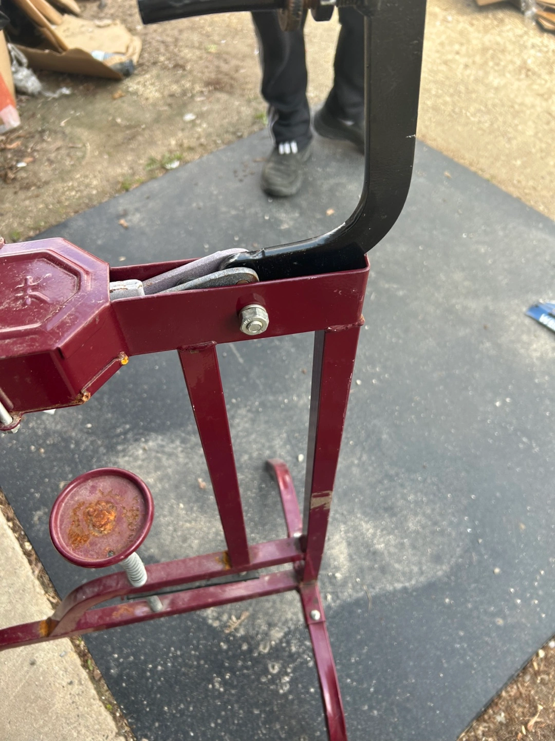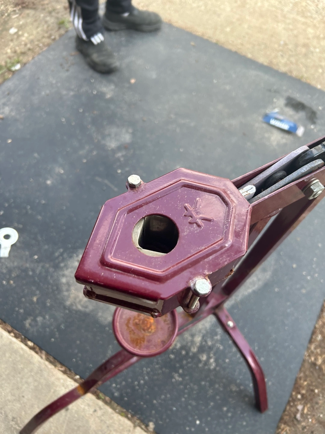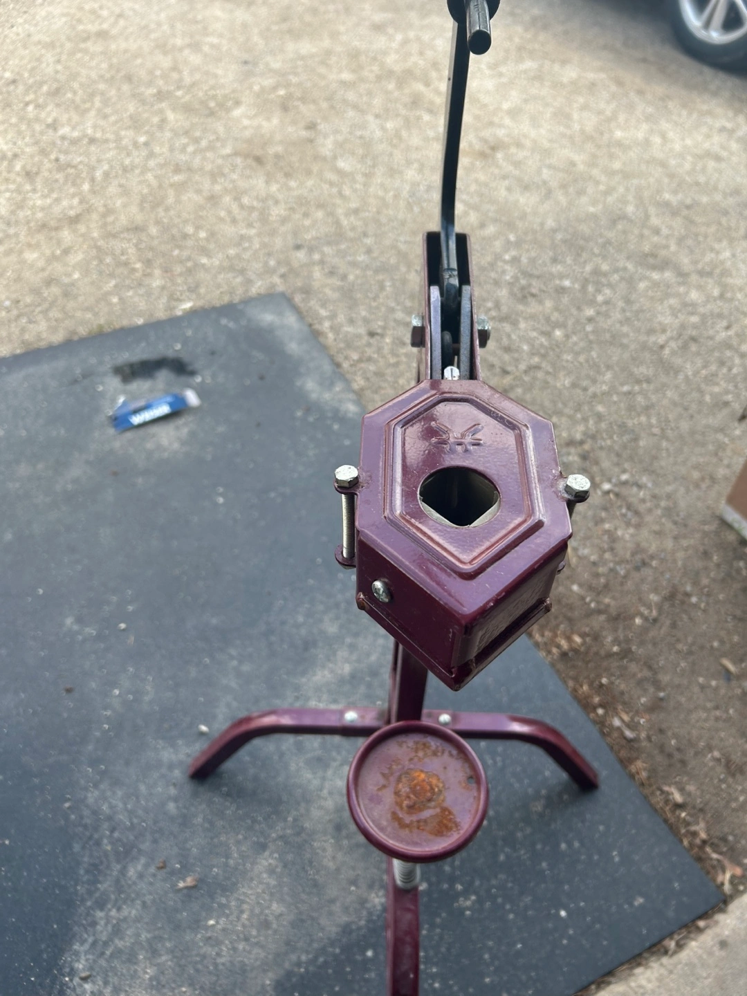 Freestanding bottle capper. Metal construction. Burgundy colour. Shows some signs of use and age. Good for capping wine bottles.